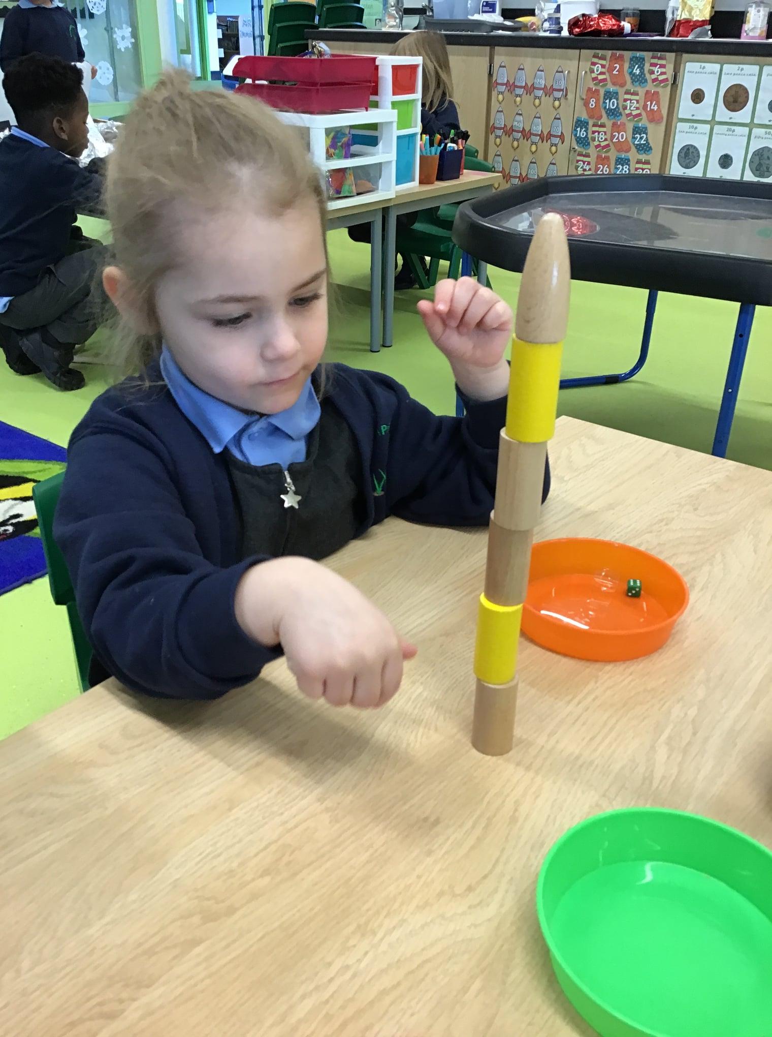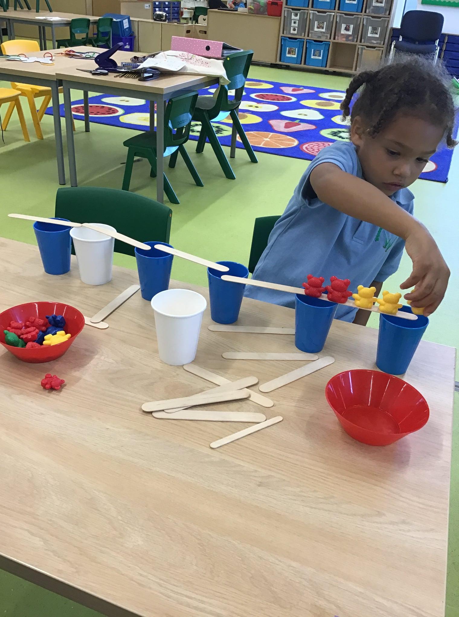 Mathematics (M): The children experience early maths skills such as sorting, classifying, identifying shapes, repeating patterns, counting, practical addition and subtraction, measuring and capacity in lots of different ways including at the sand tray, water tray and when engaging in baking activities. We use Numberblocks and learn many number rhymes to help with counting, which the children enjoy. We have specific focused teaching time for maths, where we follow a maths mastery approach, as well as practical independent activities and adult-led activities too. Throughout the year, the children will be learning to subitise (recognise quantities without counting) up to 5, recall numbers bonds up to 5, compare quantities up to 10 and explore and represent patterns within numbers up to 10, e.g. odd and even numbers and double facts.