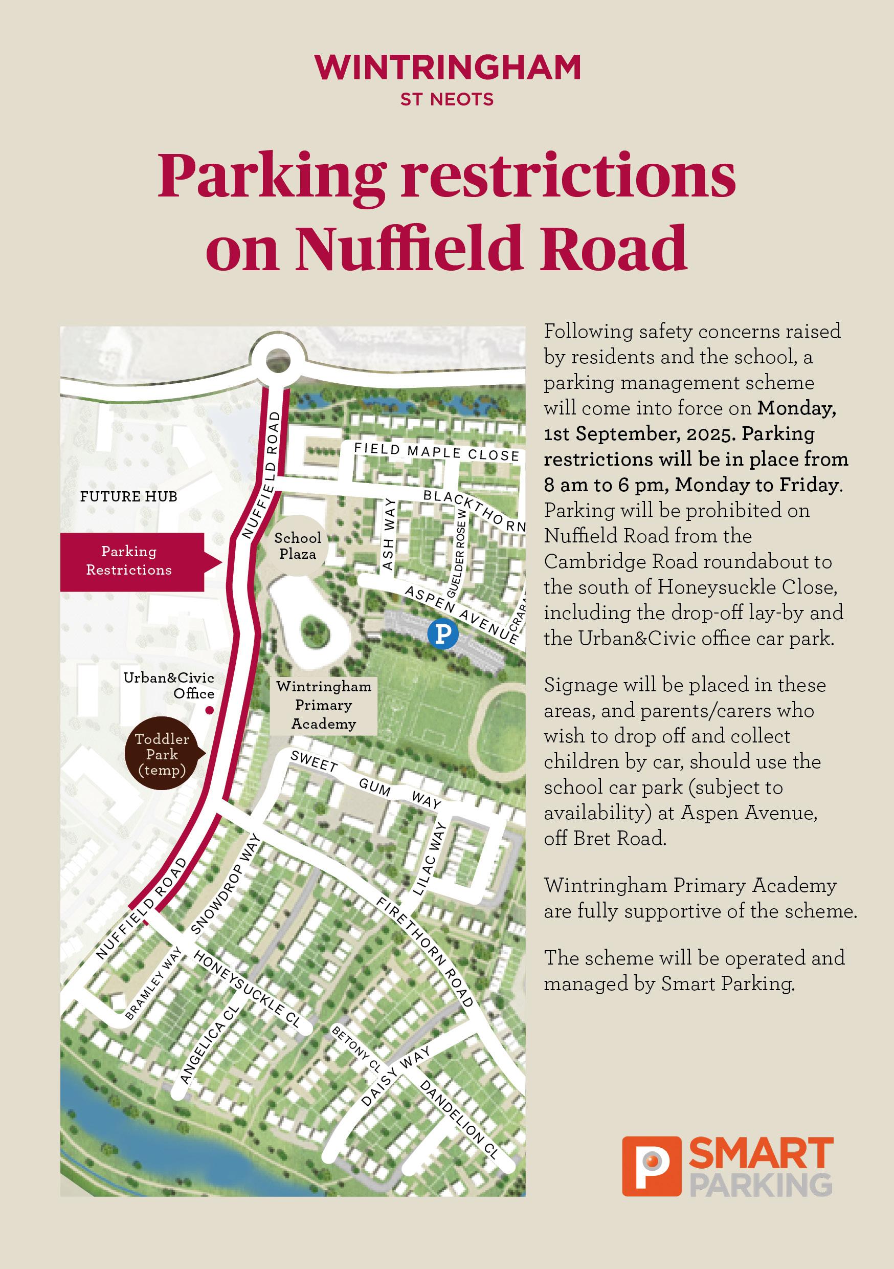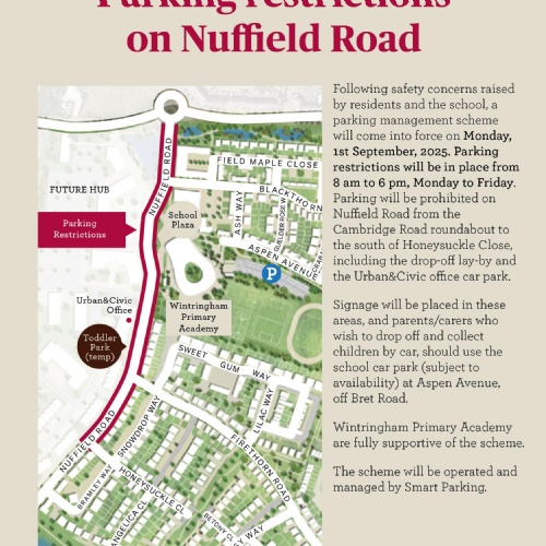 All visitors are asked to park in the school car park in Aspen Avenue which can be accessed from Bret Road. Please be aware that parking restrictions in Nuffield Road come into force from 1st September 2025. The car park is marked with an X on the below plan.