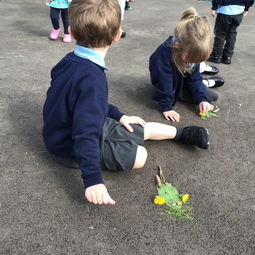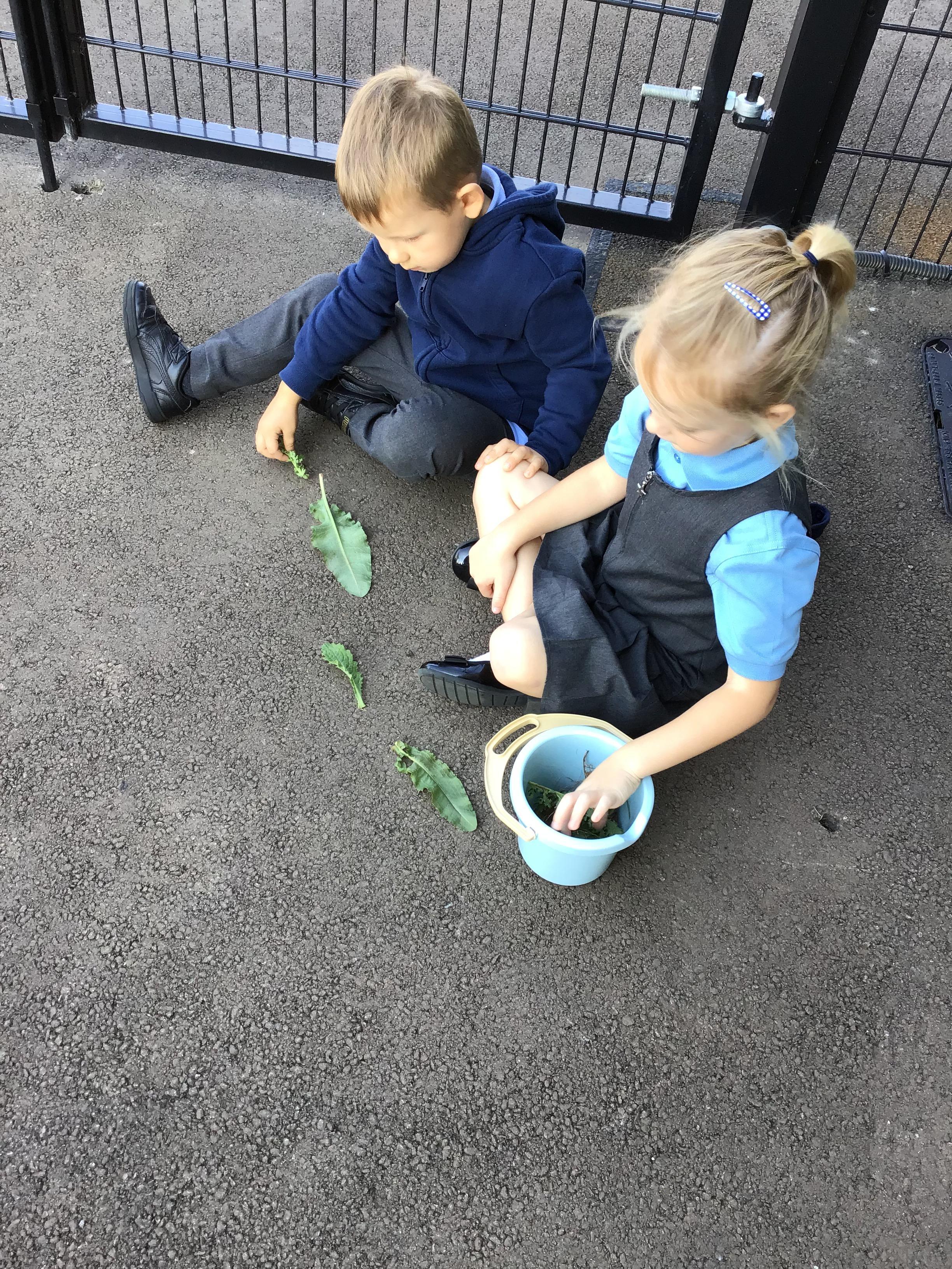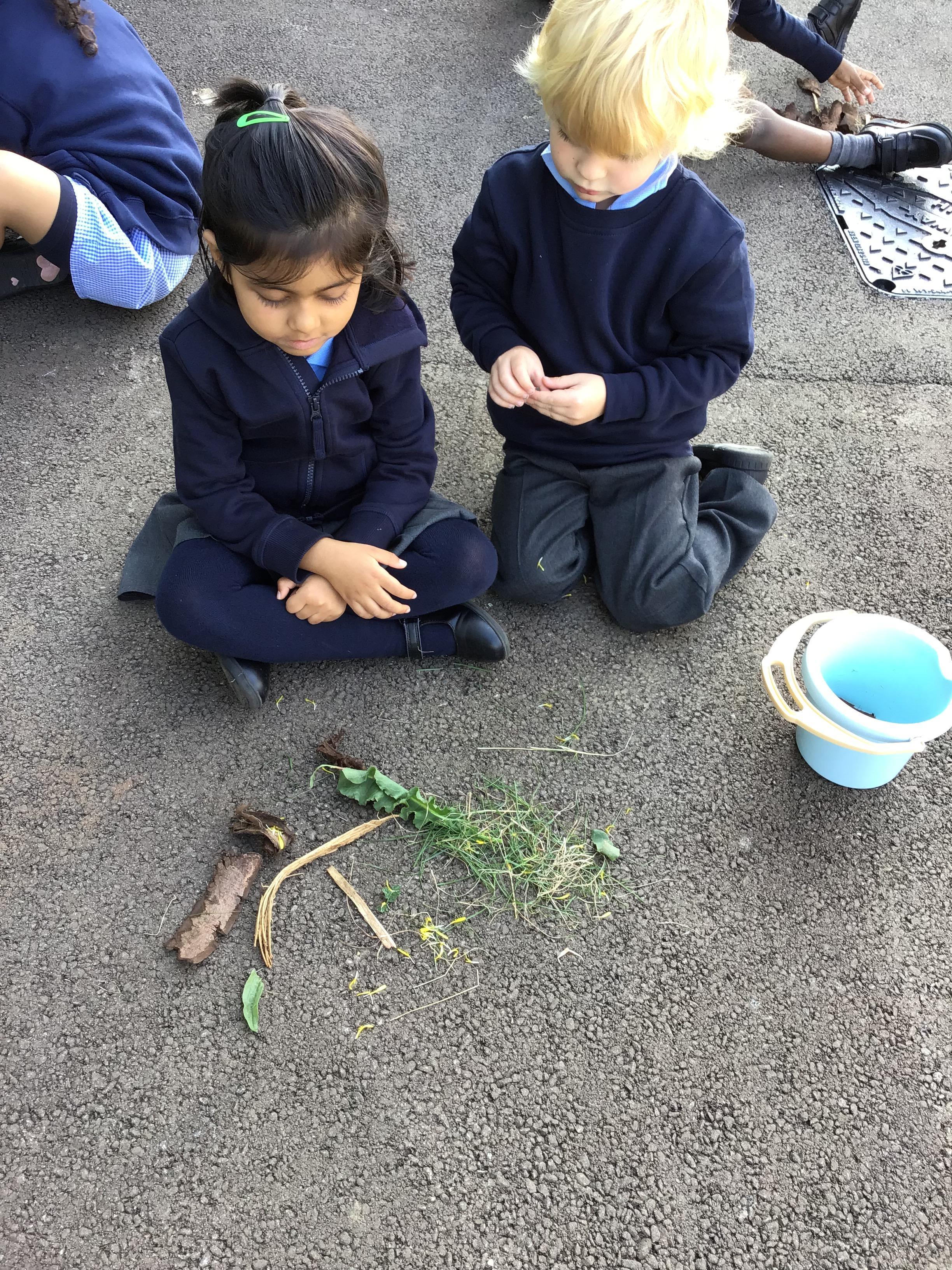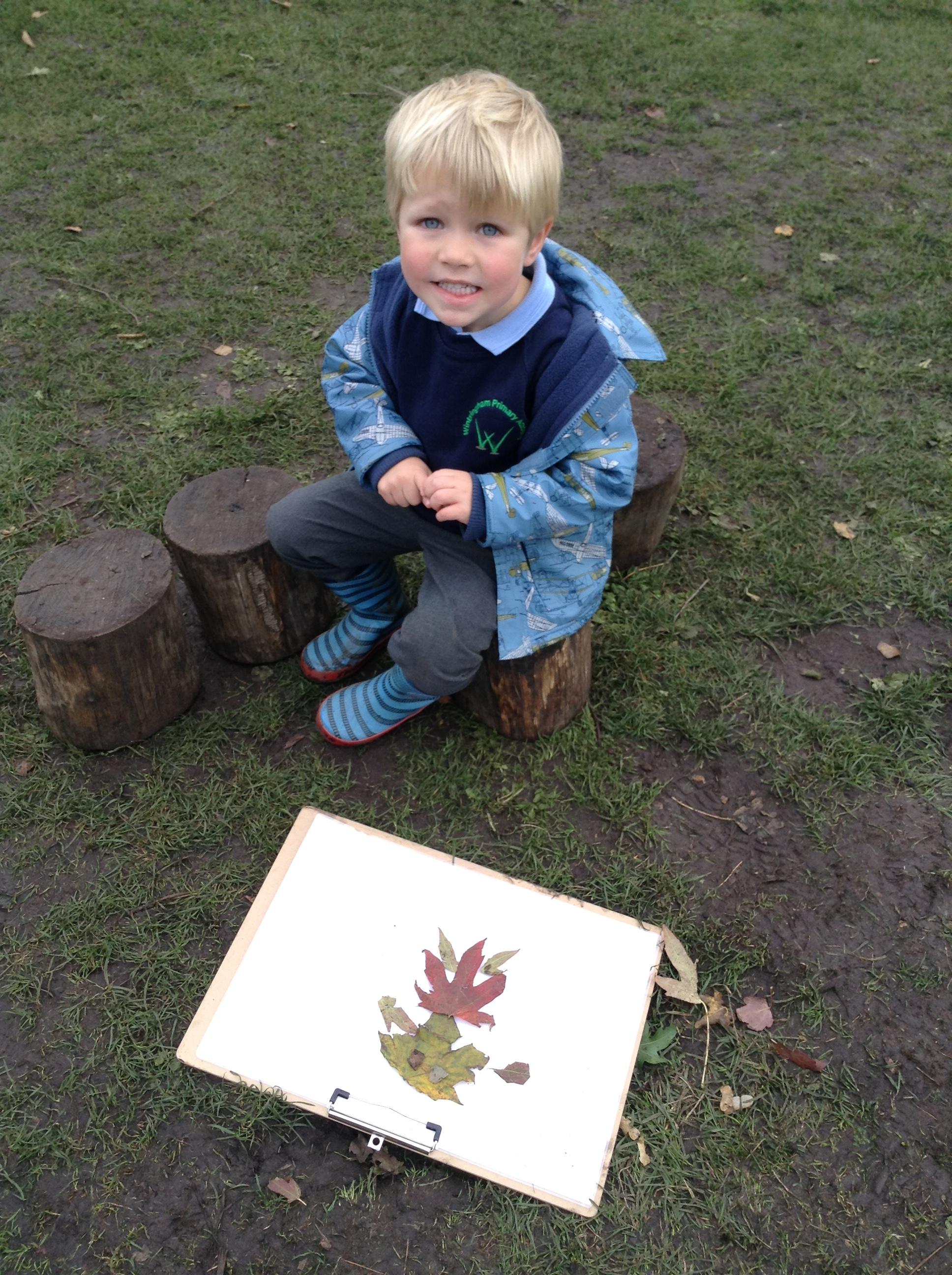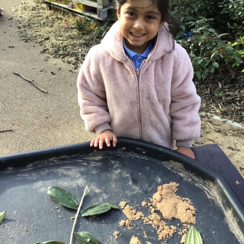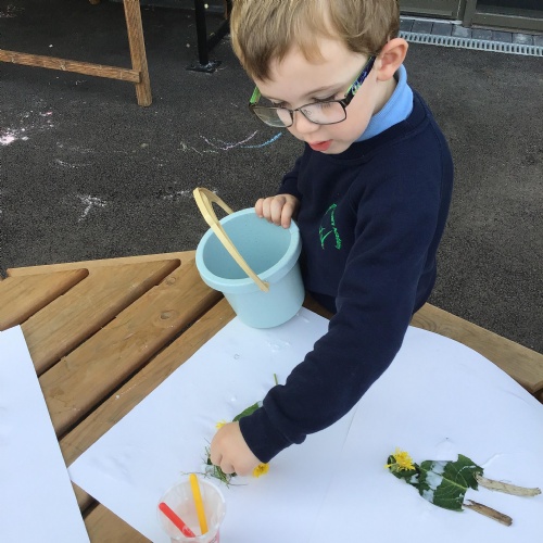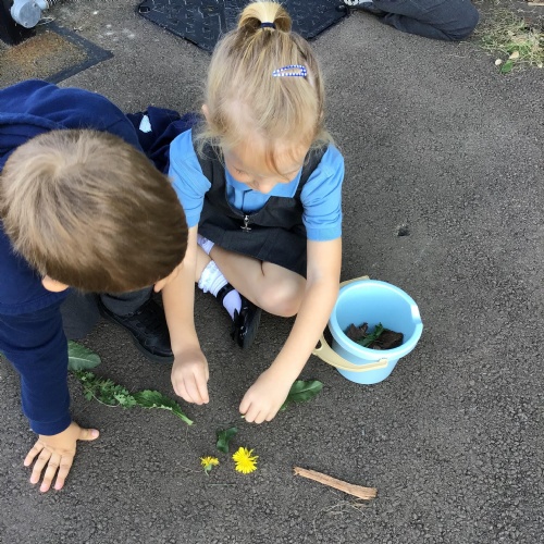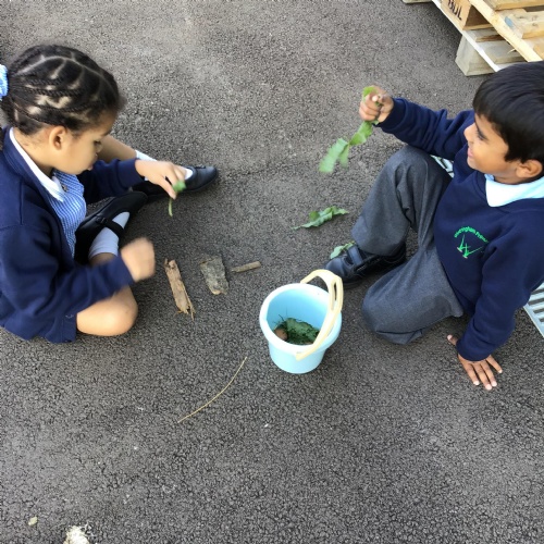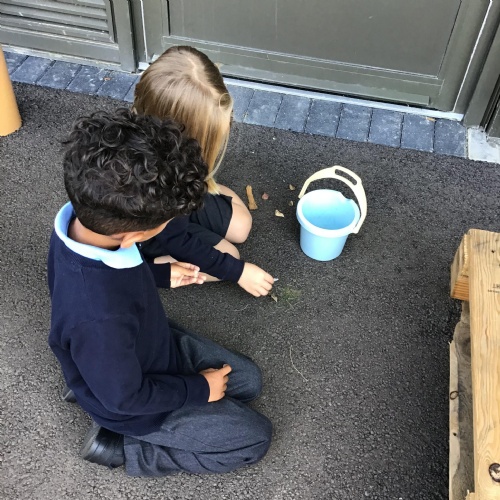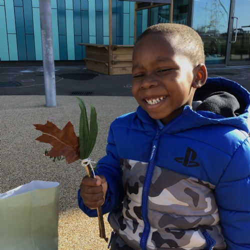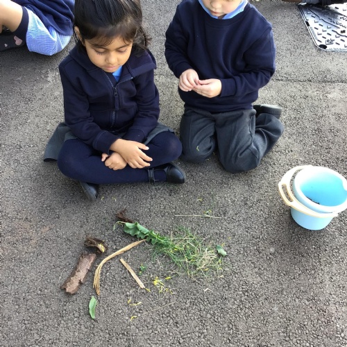 Outside, the children have enjoyed an exploration station. They have been looking at the different wildlife in the garden and also the variety of plants that we have. In outdoor learning, the children used different materials to create their very own leaf men.