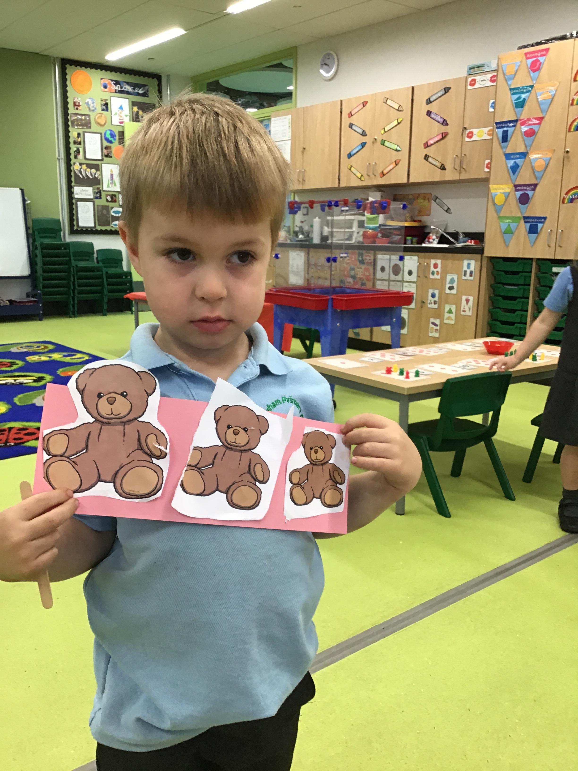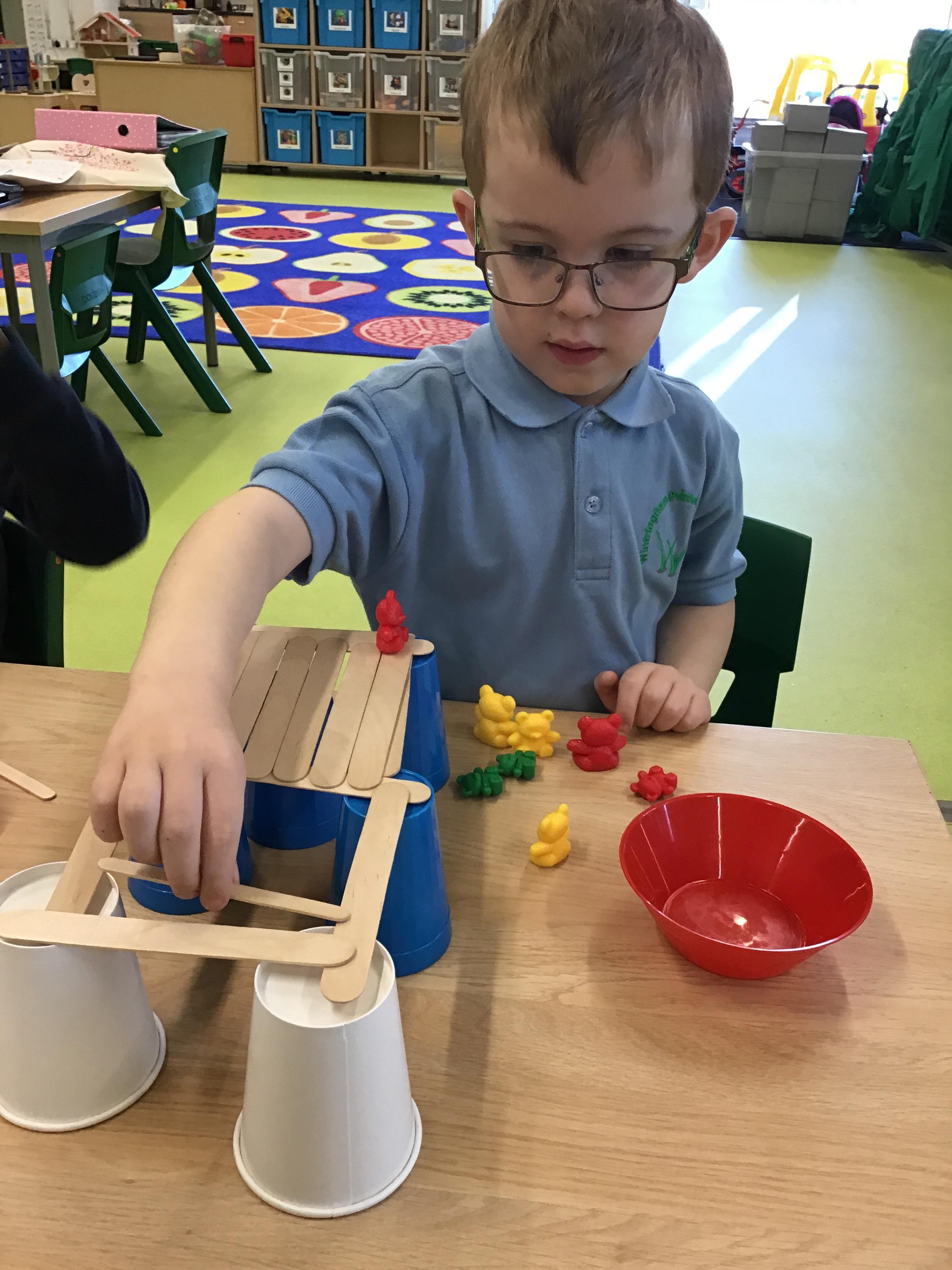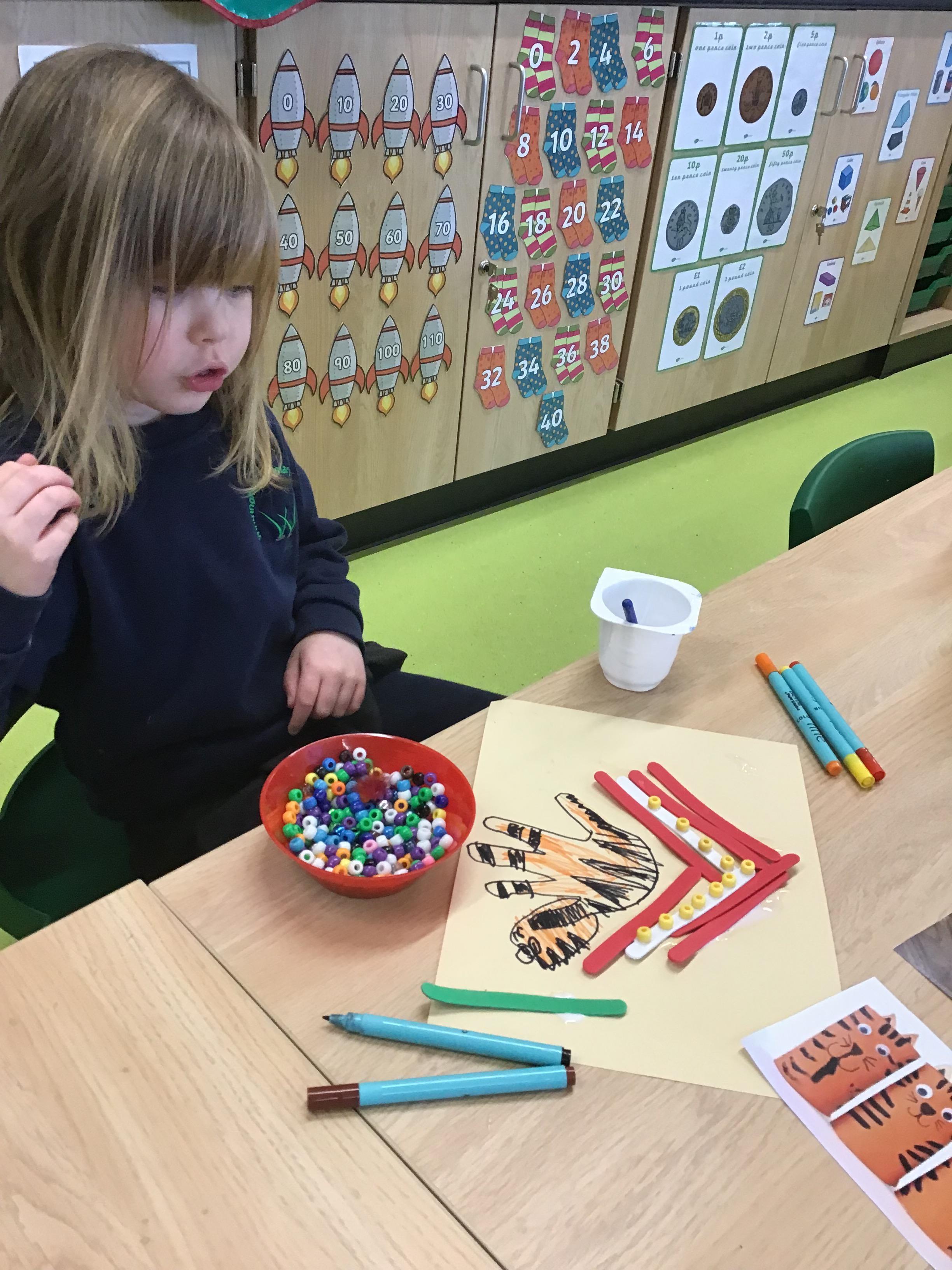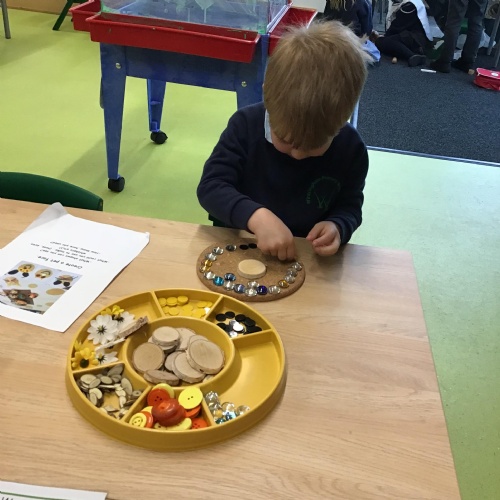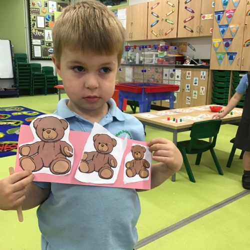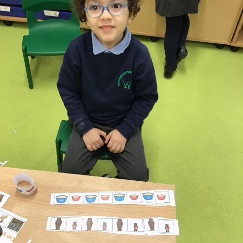 The children have had a fantastic start to the spring term focussing on the theme 'traditional tales.' First the children looked at the key text, 'Goldilocks and the Three Bears.' The children increased their confidence retelling a story, joining in with repeated parts of a story and hot seating the different characters. In continuous provision, the children role played in the cottage, wrote in porridge oats, ordered different objects from the story by size and made their own bear puppets. Outside, the children created ice dream catchers, explored colour in the water and created the bear's cottage using large shape bricks. During the focus activity, the children explored AB patterns. They were able to create their own patterns, continue a pre made pattern and spot errors in an AB pattern.