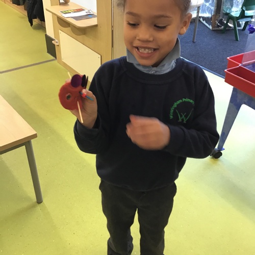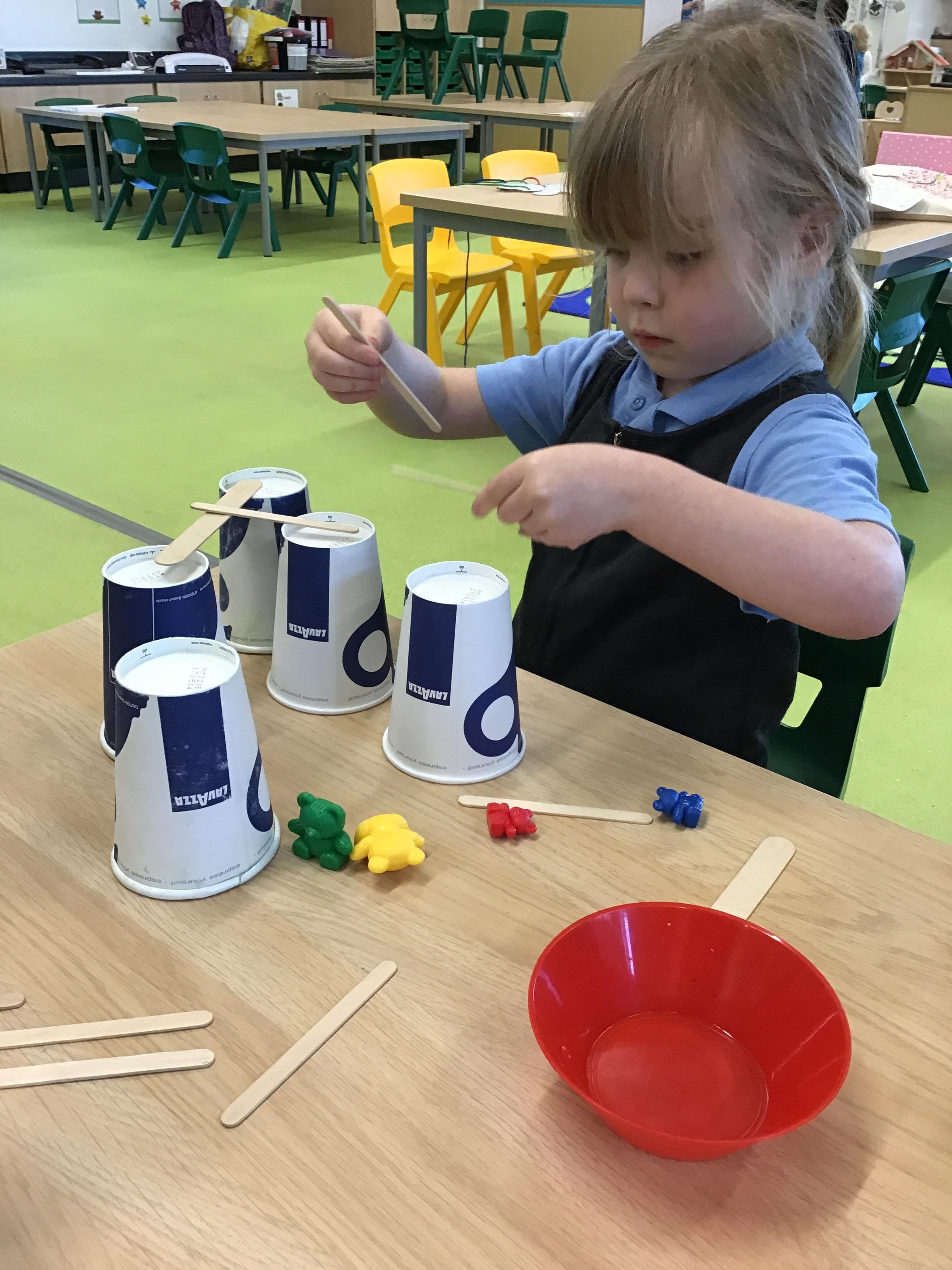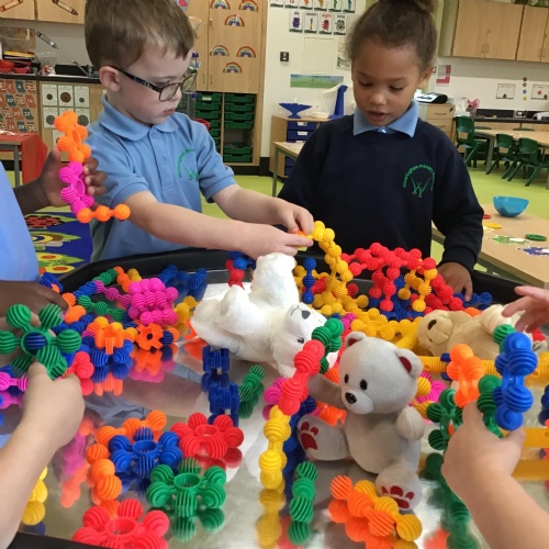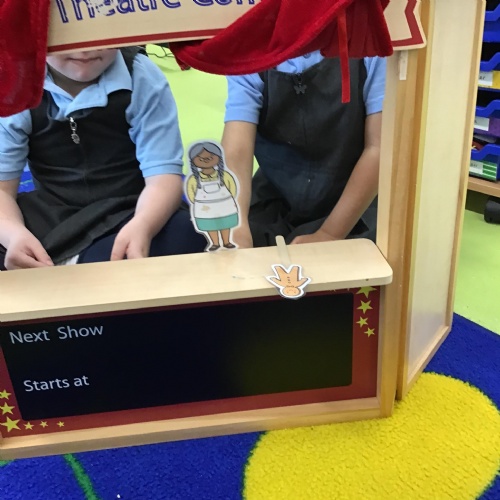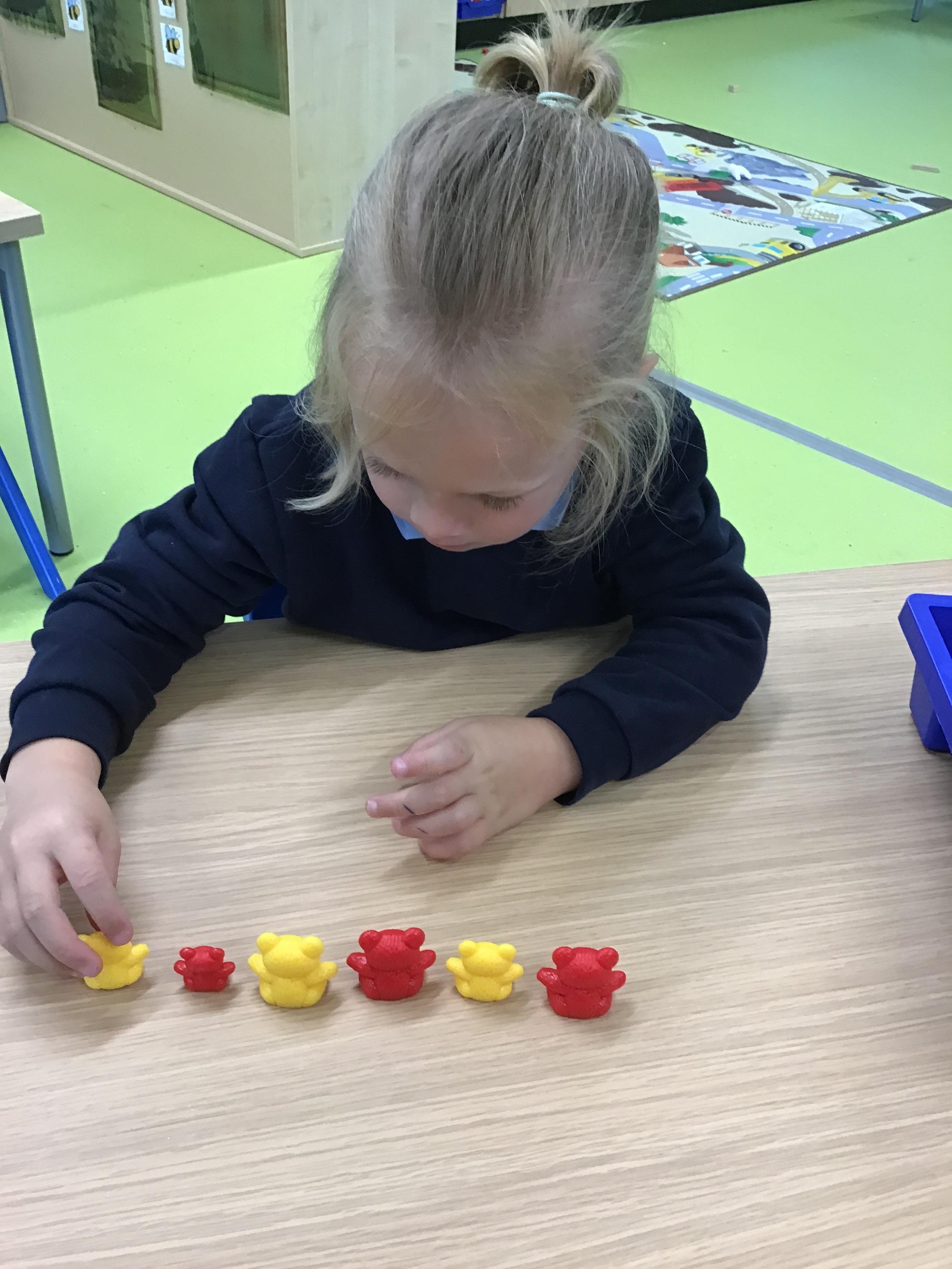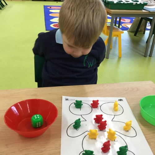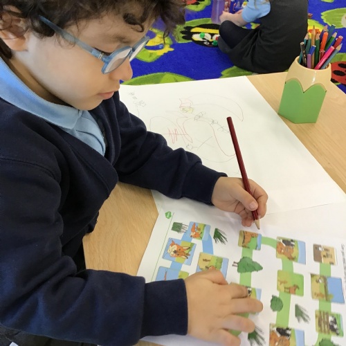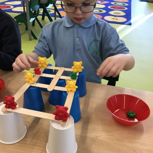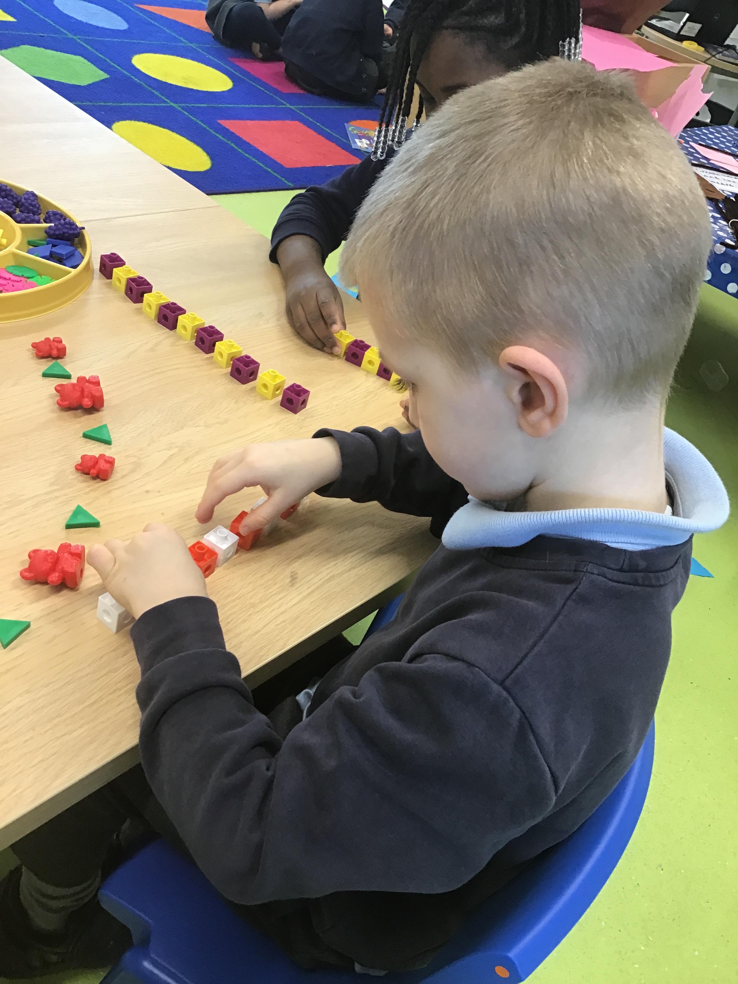 The children have had a fantastic start to the spring term focussing on the theme 'traditional tales.' First the children looked at the key text, 'Goldilocks and the Three Bears.' The children increased their confidence retelling a story, joining in with repeated parts of a story and hot seating the different characters. In continuous provision, the children role played in the cottage, wrote in porridge oats, ordered different objects from the story by size and made their own bear puppets. Outside, the children created ice dream catchers, explored colour in the water and created the bear's cottage using large shape bricks. During the focus activity, the children explored AB patterns. They were able to create their own patterns, continue a pre made pattern and spot errors in an AB pattern.