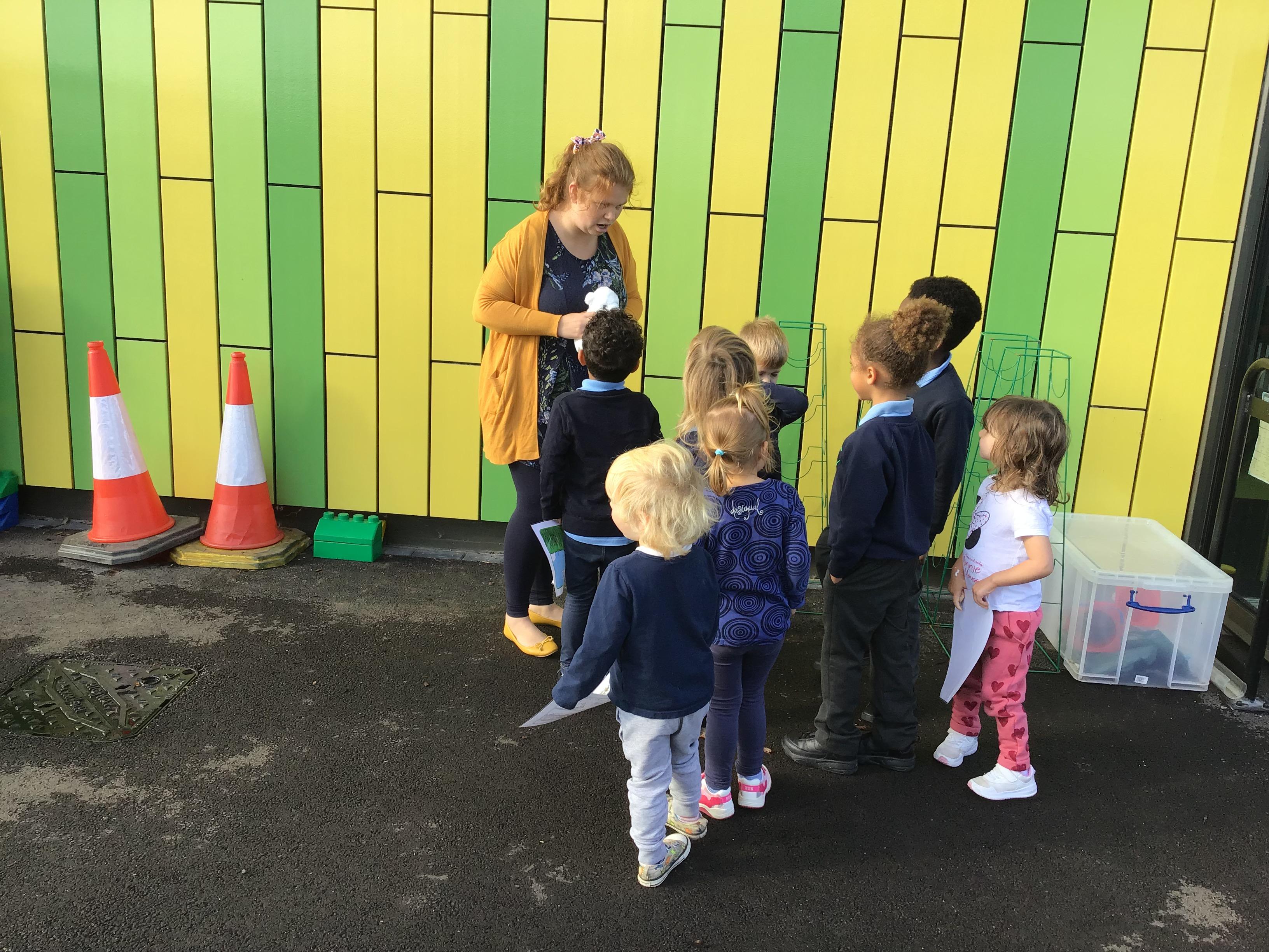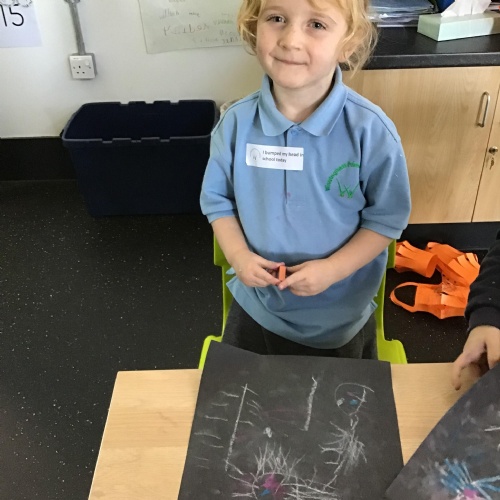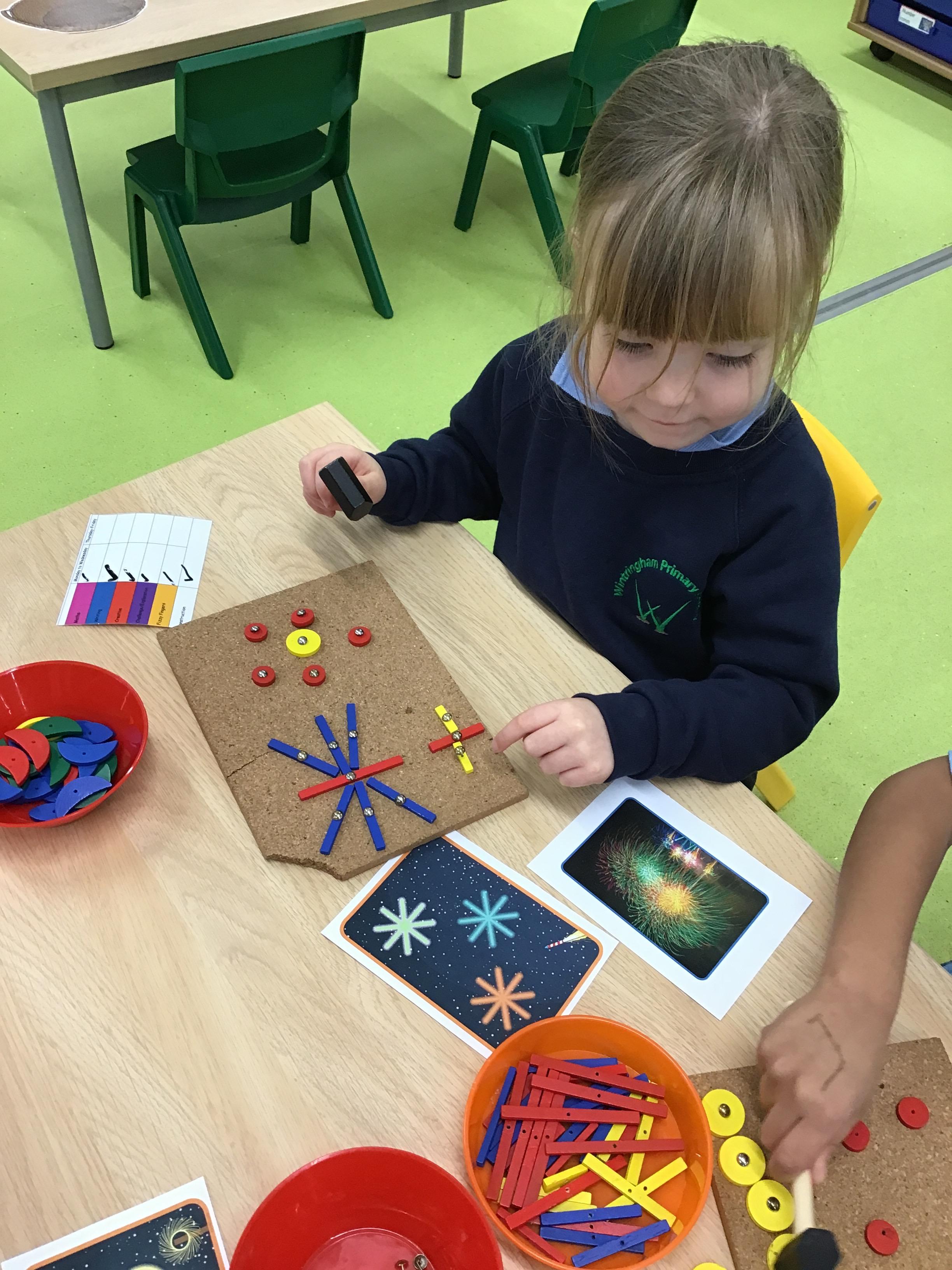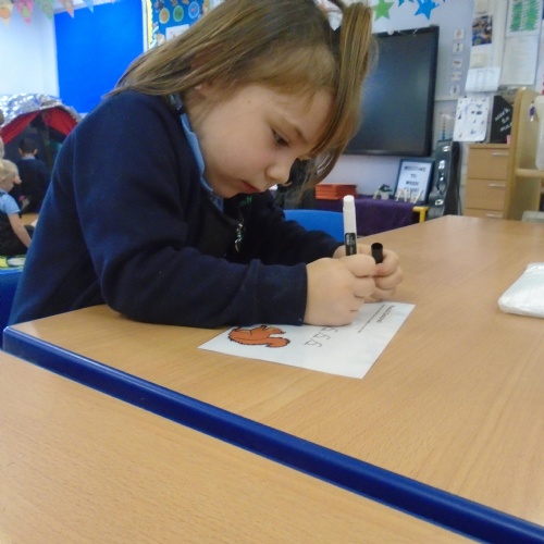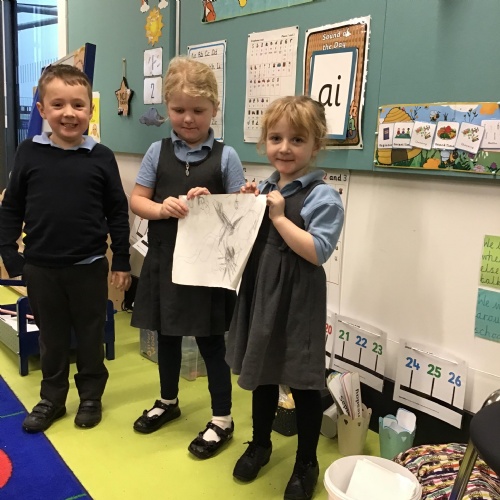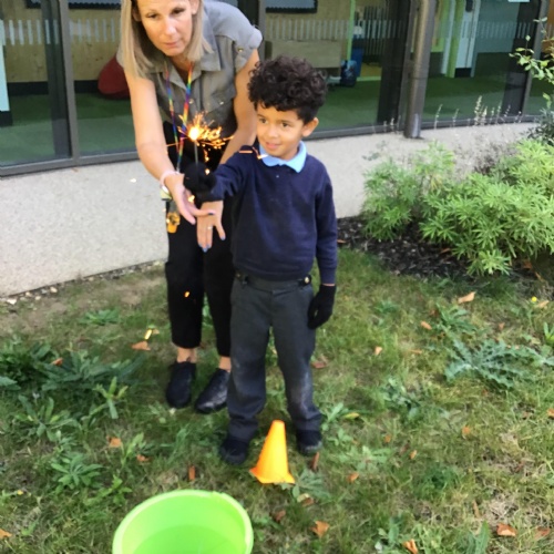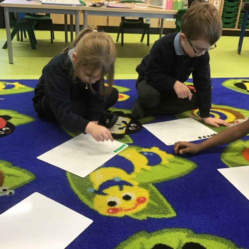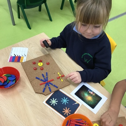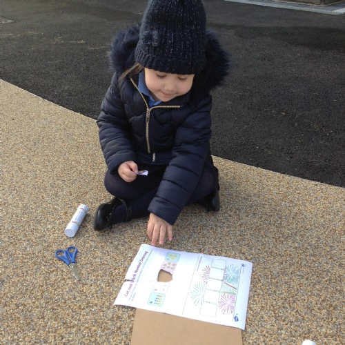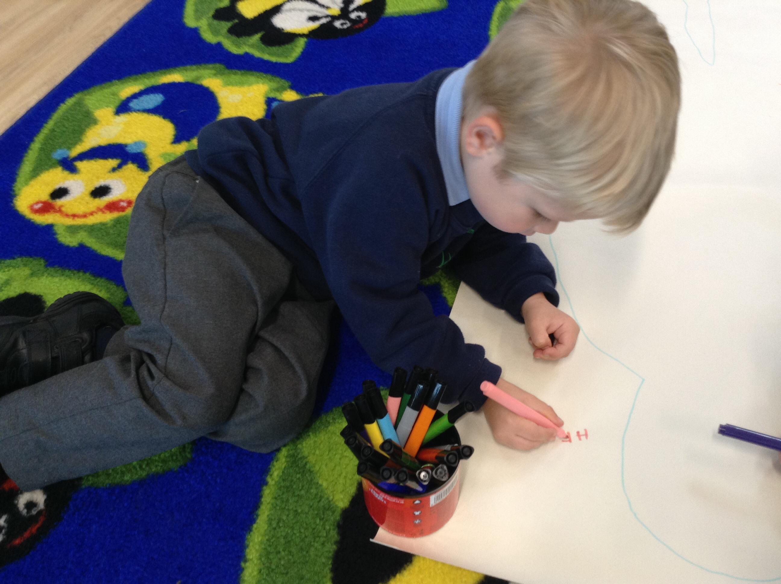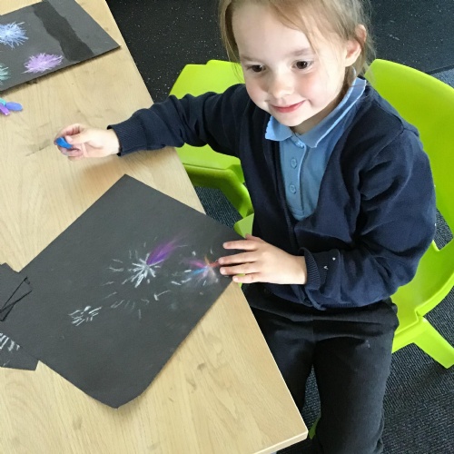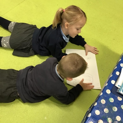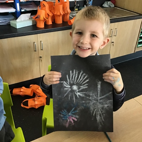 Welcome back after half term, it is so lovely to see the children back at school and hearing about what they have been doing during their week off. The children have settled well into their new school, they have been enjoying exploring their new surroundings and meeting the children in class 2 at playtime, lunchtime and during shared outdoor learning sessions. For Bonfire Night, the children made firework pictures using the touch screen on the laptop and also using glue, salt and different watercolours. They made patterns using firework noises, e.g. bang, whoosh, fizz, bang, whoosh, fizz and then wrote down some of these words onto an outline of a firework. The children have been independently adding together the number of seeds found on two strawberries before writing down the answer, writing signs for our new fruit and vegetable shop role play area and using play-dough to replicate different fireworks. For our outdoor learning this week, the children worked with the children from class 2 to draw around each other's bodies on the playground and then wrote some labels for the different body parts. Next week the children will be learning the sounds r, h, b and f/ff in our phonics sessions. They will also be continuing to practise segmenting and blending sounds for reading and writing.