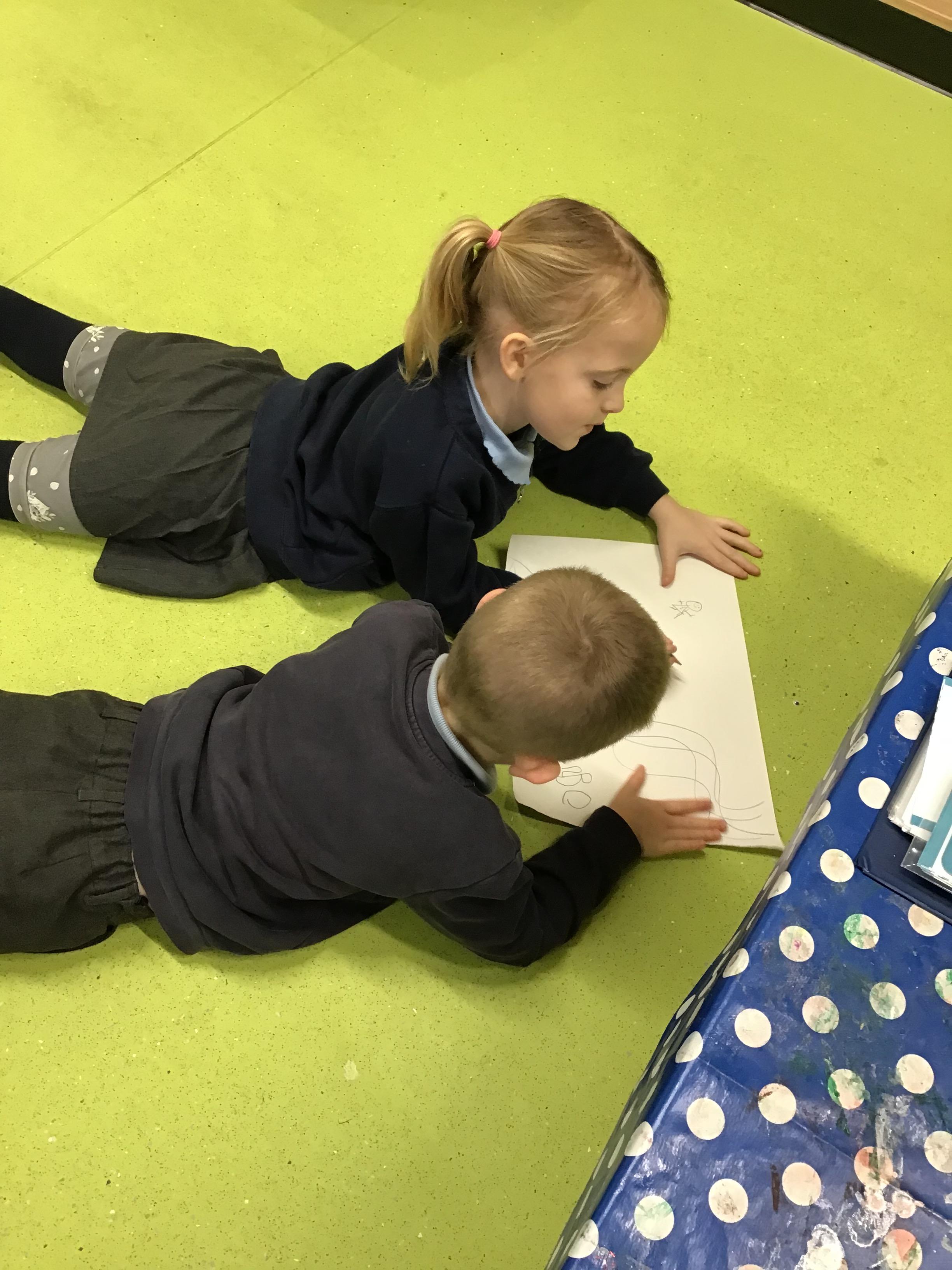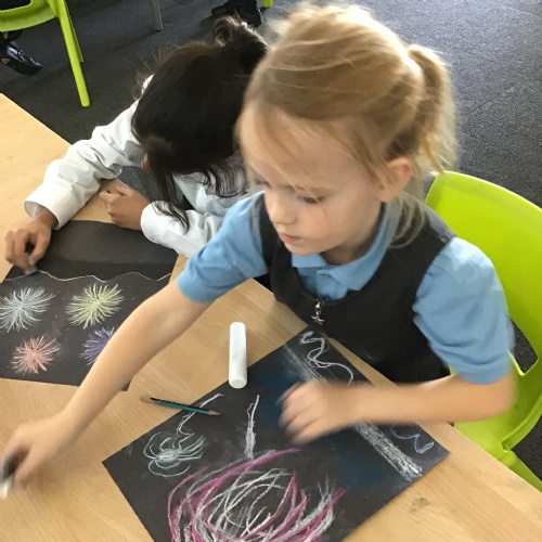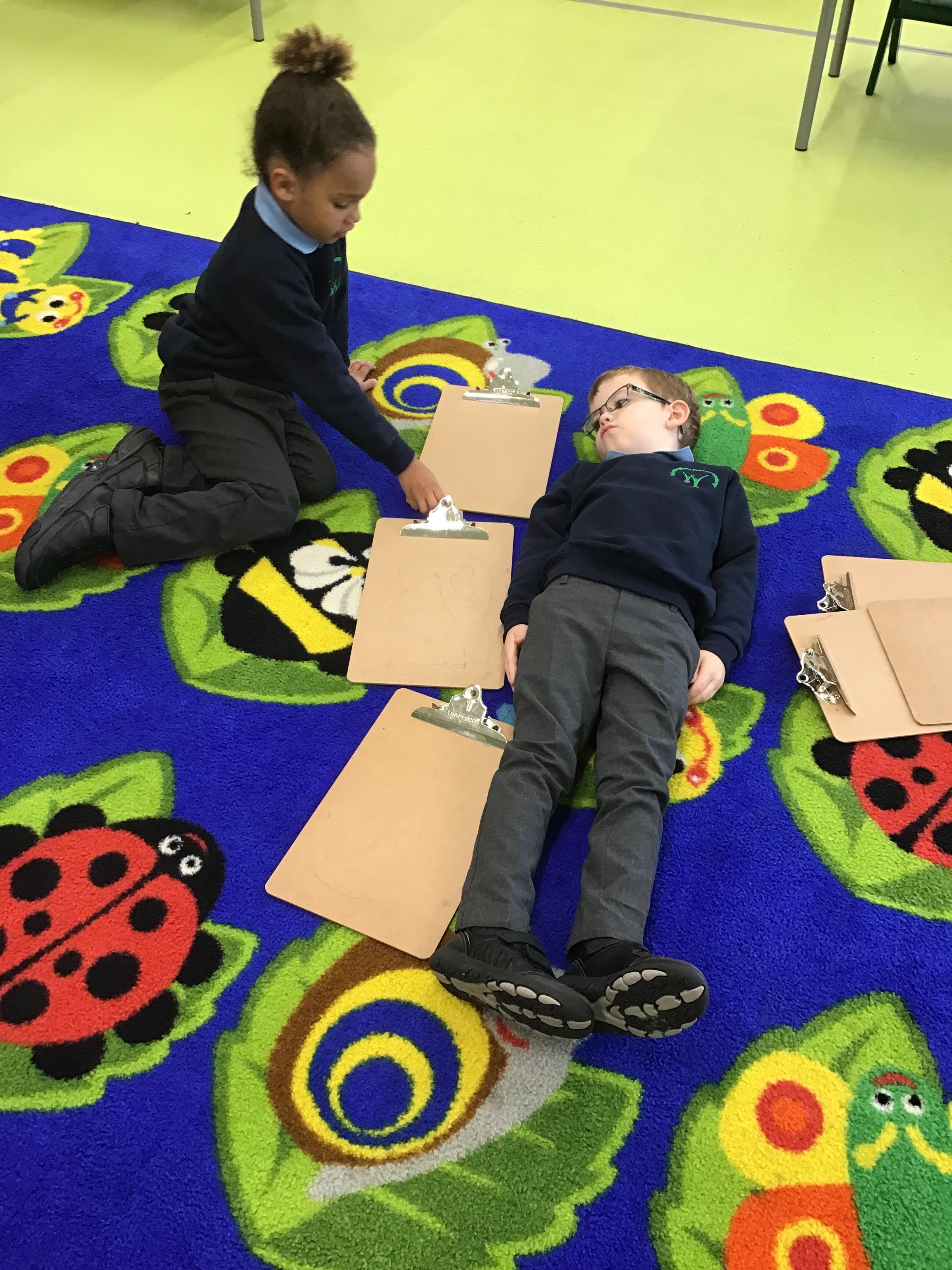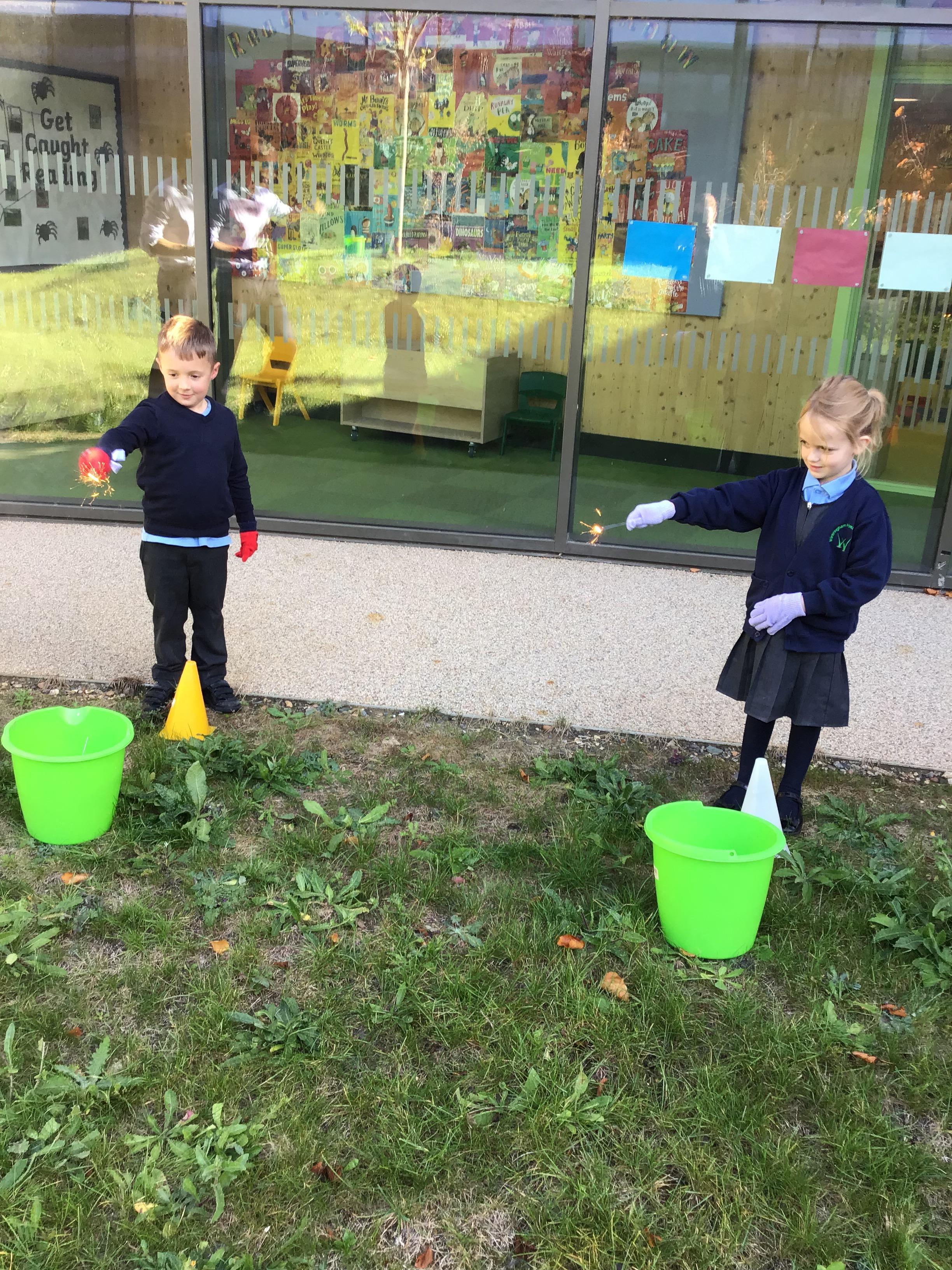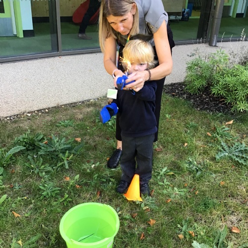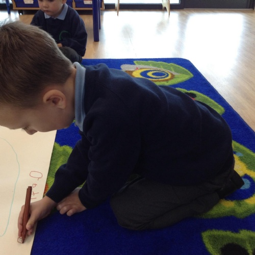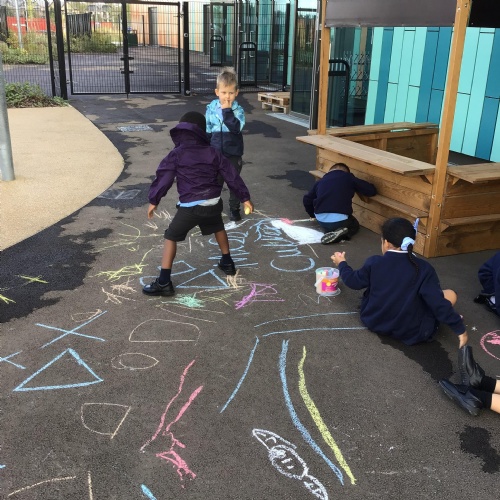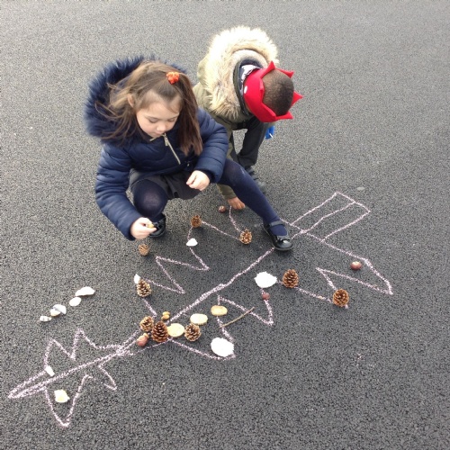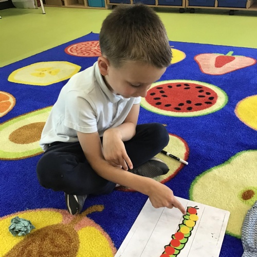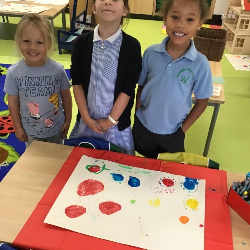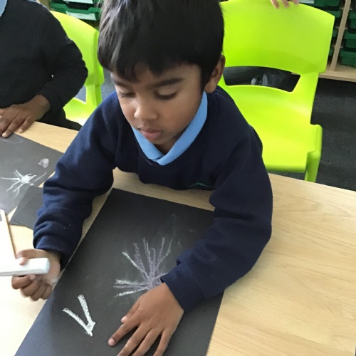 Welcome back after half term, it is so lovely to see the children back at school and hearing about what they have been doing during their week off. The children have settled well into their new school, they have been enjoying exploring their new surroundings and meeting the children in class 2 at playtime, lunchtime and during shared outdoor learning sessions. For Bonfire Night, the children made firework pictures using the touch screen on the laptop and also using glue, salt and different watercolours. They made patterns using firework noises, e.g. bang, whoosh, fizz, bang, whoosh, fizz and then wrote down some of these words onto an outline of a firework. The children have been independently adding together the number of seeds found on two strawberries before writing down the answer, writing signs for our new fruit and vegetable shop role play area and using play-dough to replicate different fireworks. For our outdoor learning this week, the children worked with the children from class 2 to draw around each other's bodies on the playground and then wrote some labels for the different body parts. Next week the children will be learning the sounds r, h, b and f/ff in our phonics sessions. They will also be continuing to practise segmenting and blending sounds for reading and writing.