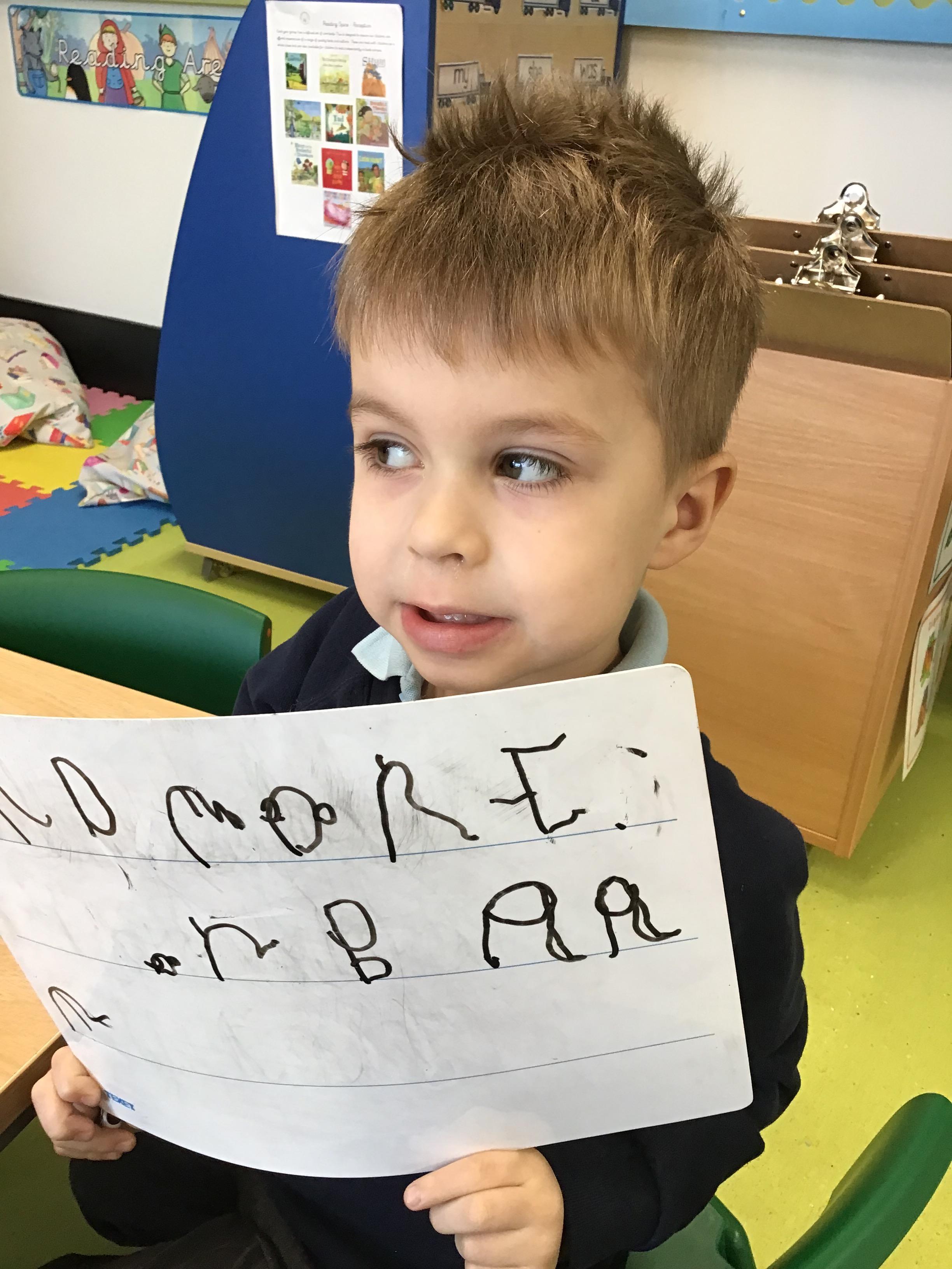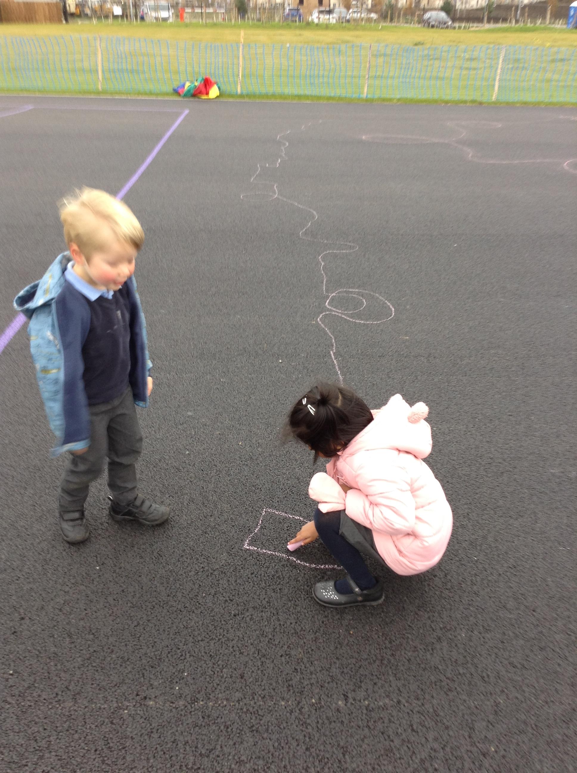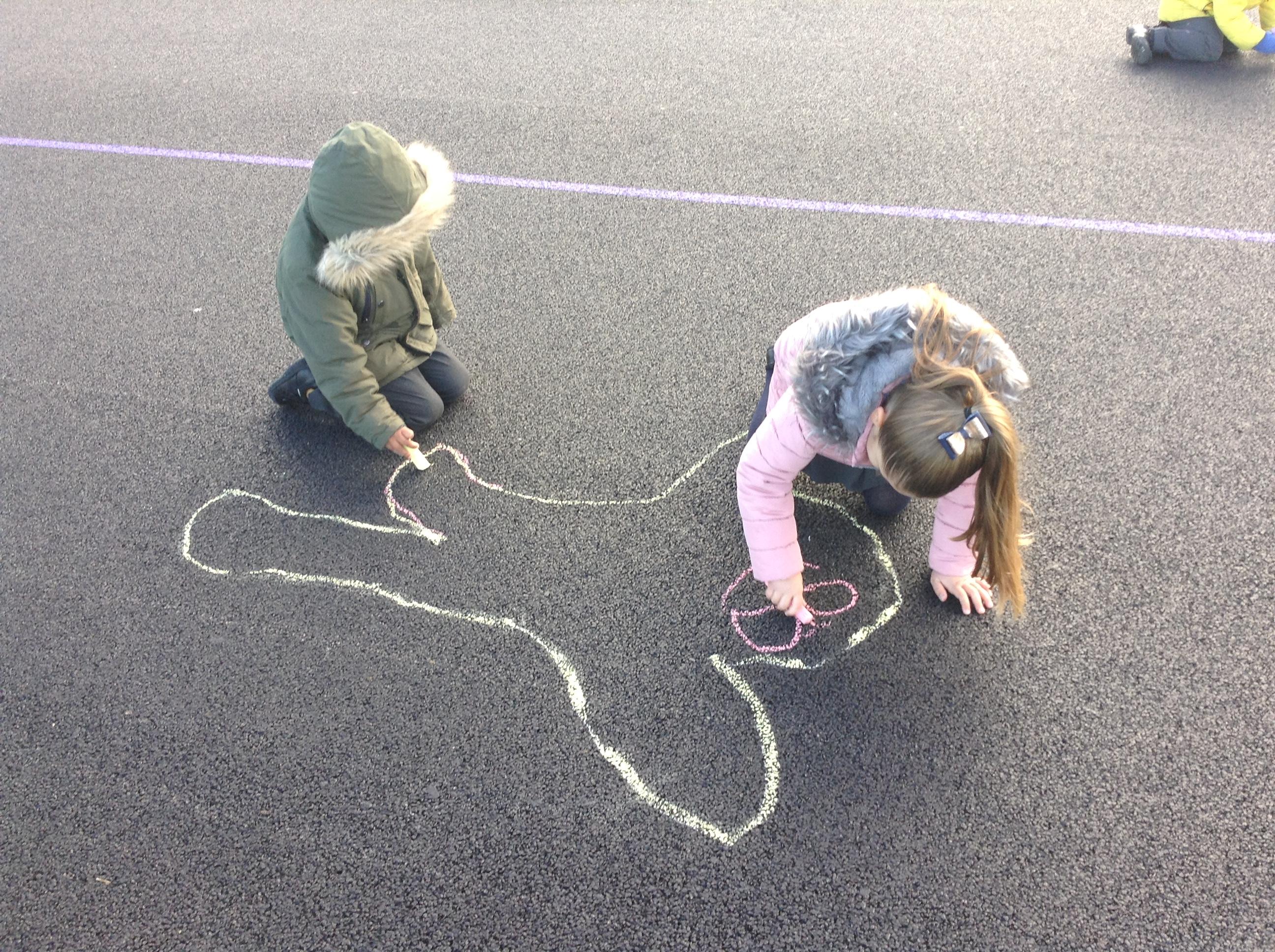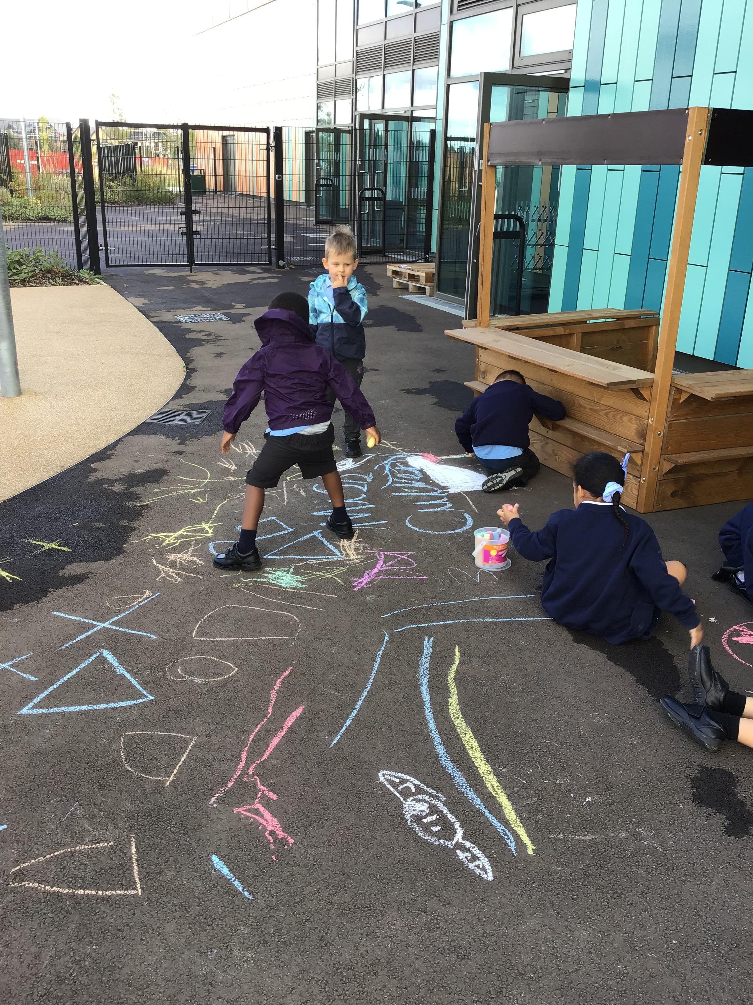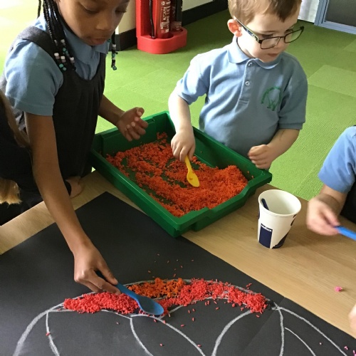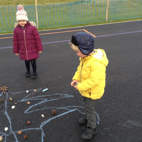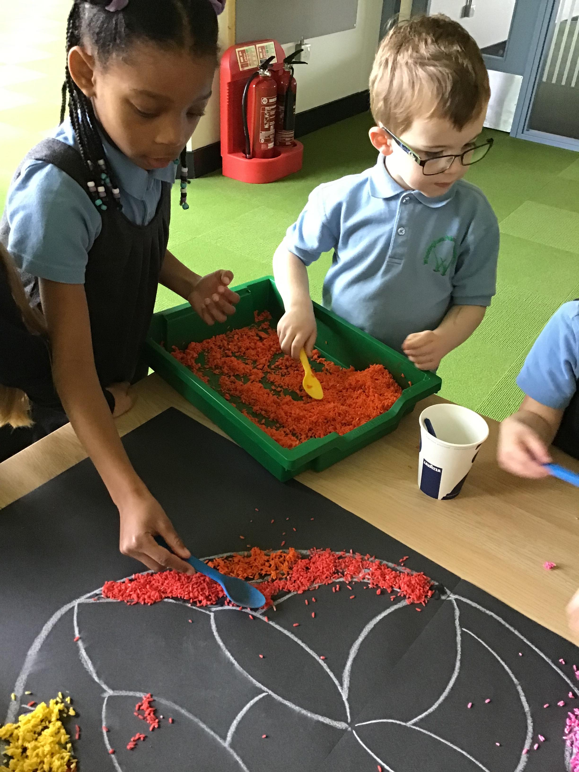 Welcome back after half term, it is so lovely to see the children back at school and hearing about what they have been doing during their week off. The children have settled well into their new school, they have been enjoying exploring their new surroundings and meeting the children in class 2 at playtime, lunchtime and during shared outdoor learning sessions. For Bonfire Night, the children made firework pictures using the touch screen on the laptop and also using glue, salt and different watercolours. They made patterns using firework noises, e.g. bang, whoosh, fizz, bang, whoosh, fizz and then wrote down some of these words onto an outline of a firework. The children have been independently adding together the number of seeds found on two strawberries before writing down the answer, writing signs for our new fruit and vegetable shop role play area and using play-dough to replicate different fireworks. For our outdoor learning this week, the children worked with the children from class 2 to draw around each other's bodies on the playground and then wrote some labels for the different body parts. Next week the children will be learning the sounds r, h, b and f/ff in our phonics sessions. They will also be continuing to practise segmenting and blending sounds for reading and writing.