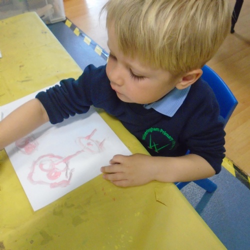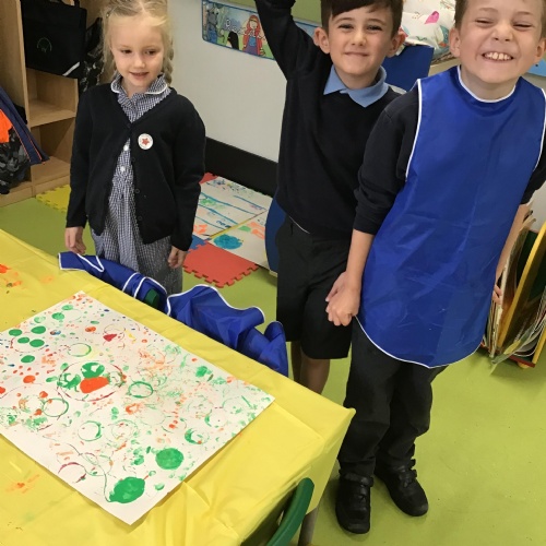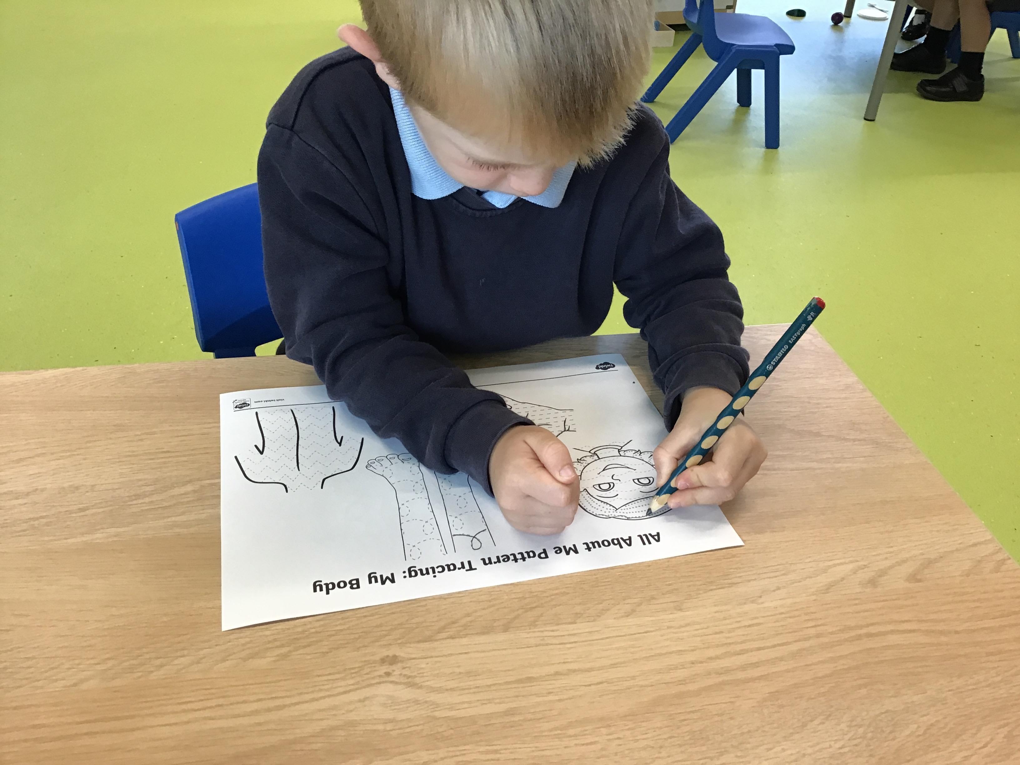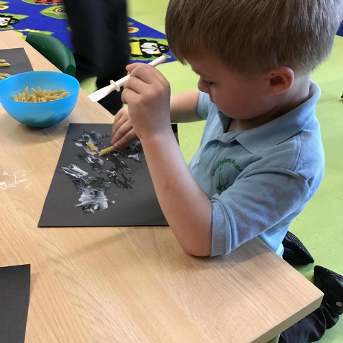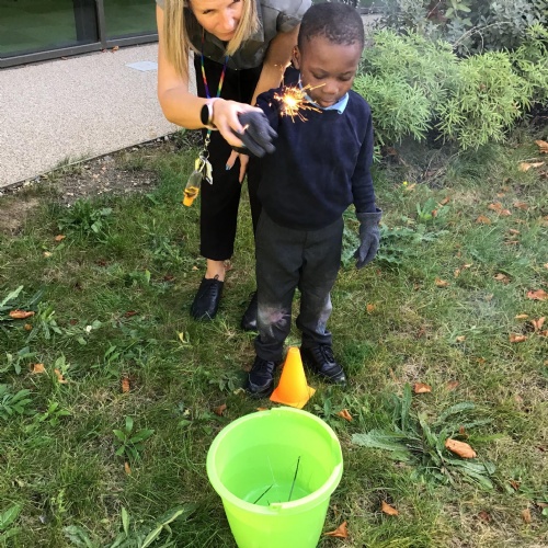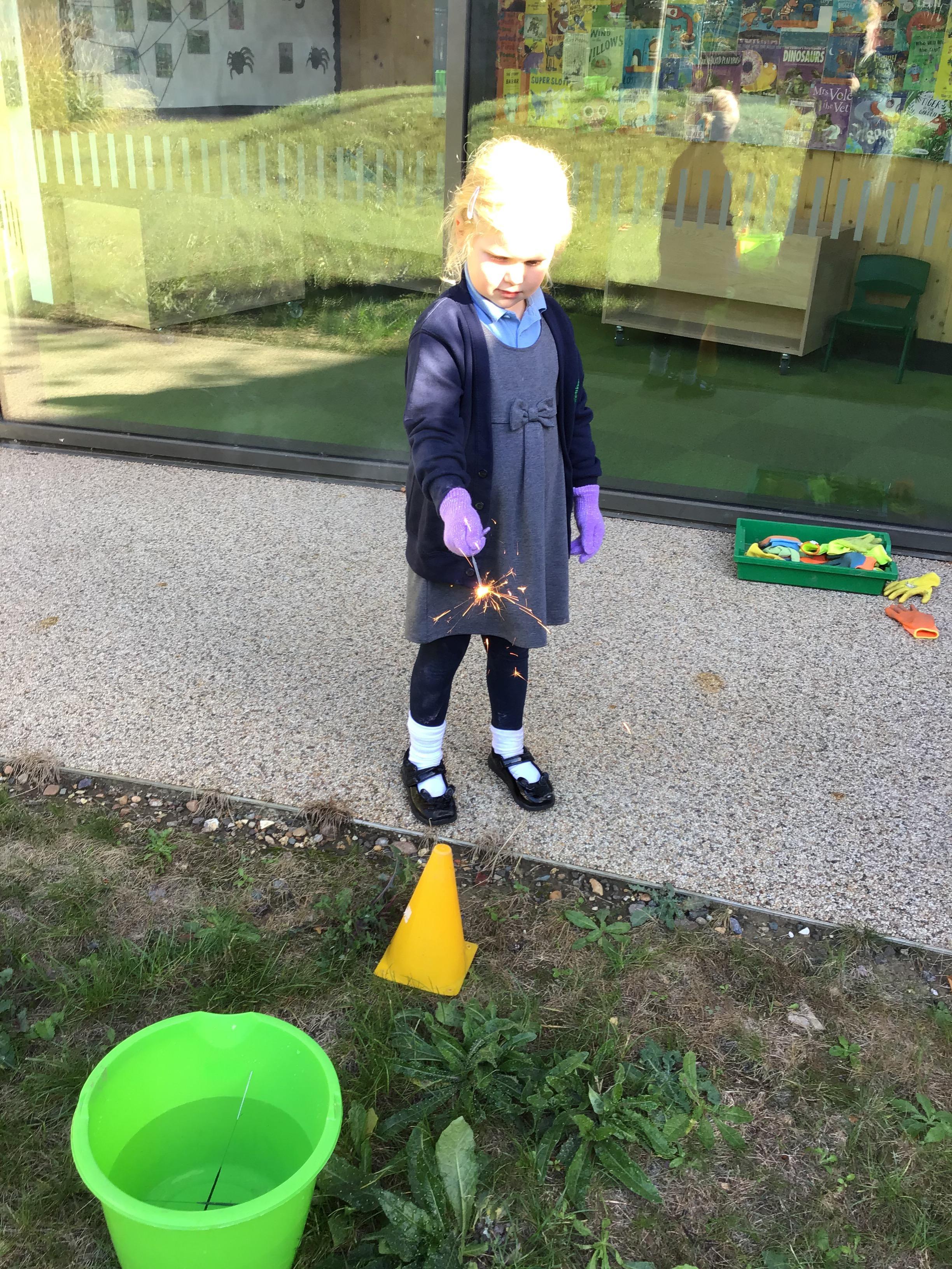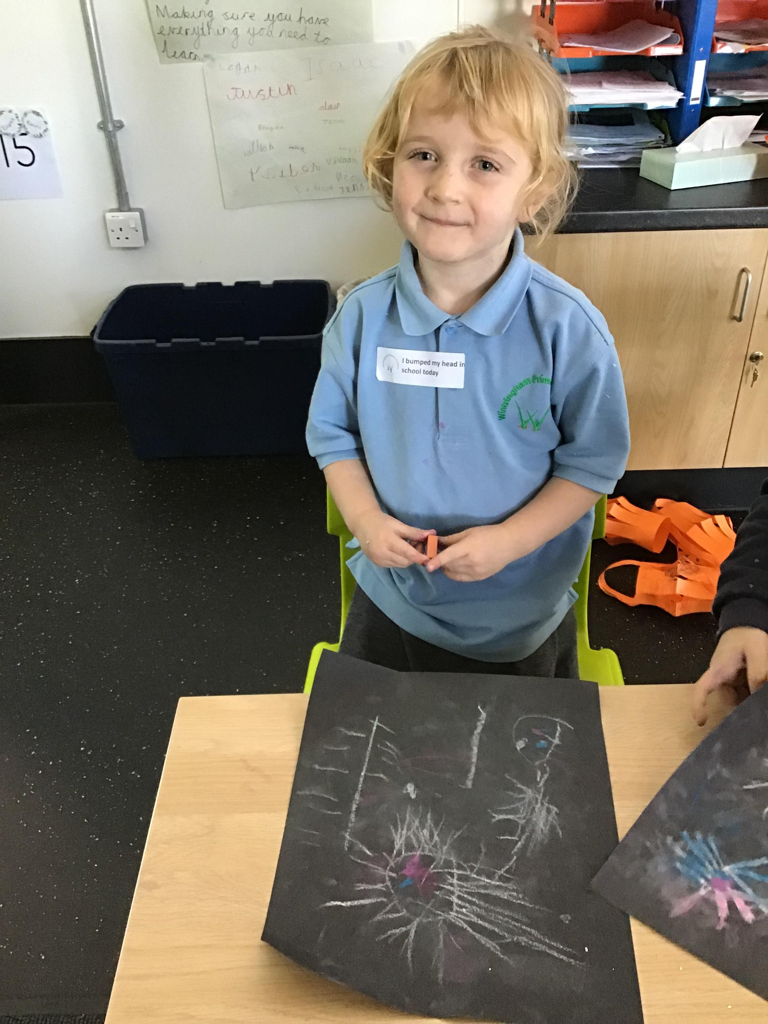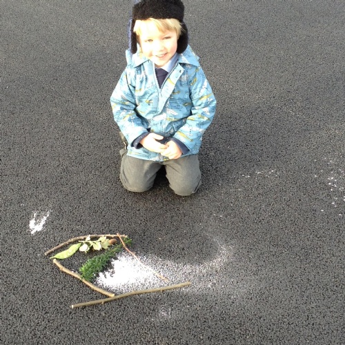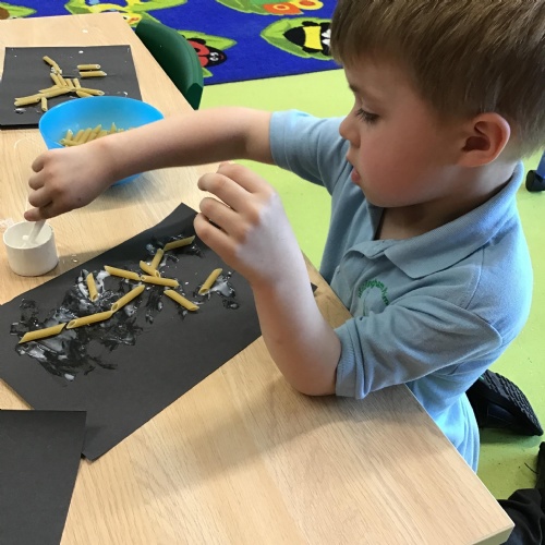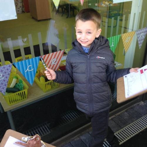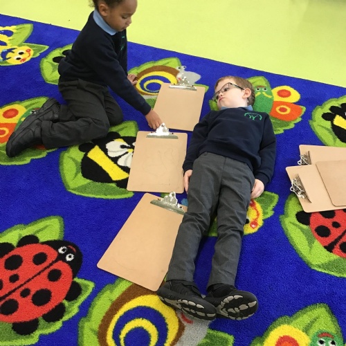 Welcome back after half term, it is so lovely to see the children back at school and hearing about what they have been doing during their week off. The children have settled well into their new school, they have been enjoying exploring their new surroundings and meeting the children in class 2 at playtime, lunchtime and during shared outdoor learning sessions. For Bonfire Night, the children made firework pictures using the touch screen on the laptop and also using glue, salt and different watercolours. They made patterns using firework noises, e.g. bang, whoosh, fizz, bang, whoosh, fizz and then wrote down some of these words onto an outline of a firework. The children have been independently adding together the number of seeds found on two strawberries before writing down the answer, writing signs for our new fruit and vegetable shop role play area and using play-dough to replicate different fireworks. For our outdoor learning this week, the children worked with the children from class 2 to draw around each other's bodies on the playground and then wrote some labels for the different body parts. Next week the children will be learning the sounds r, h, b and f/ff in our phonics sessions. They will also be continuing to practise segmenting and blending sounds for reading and writing.