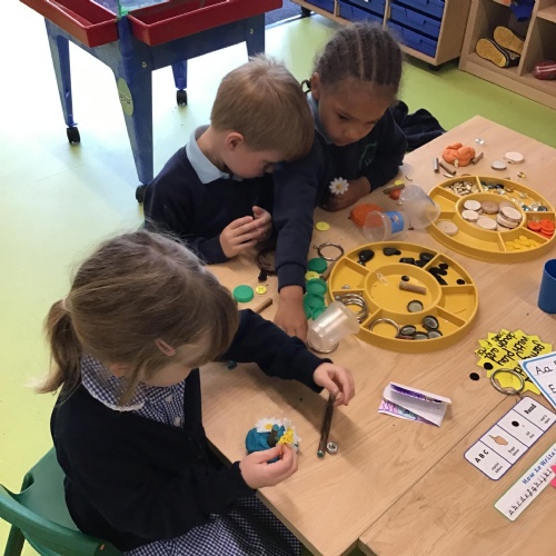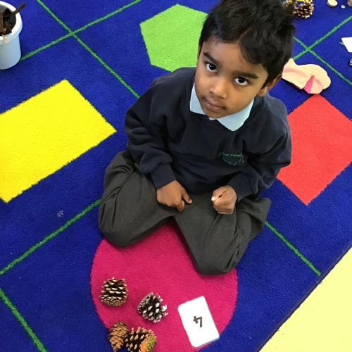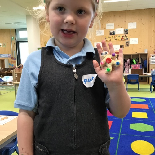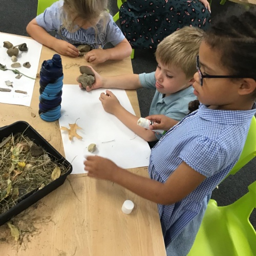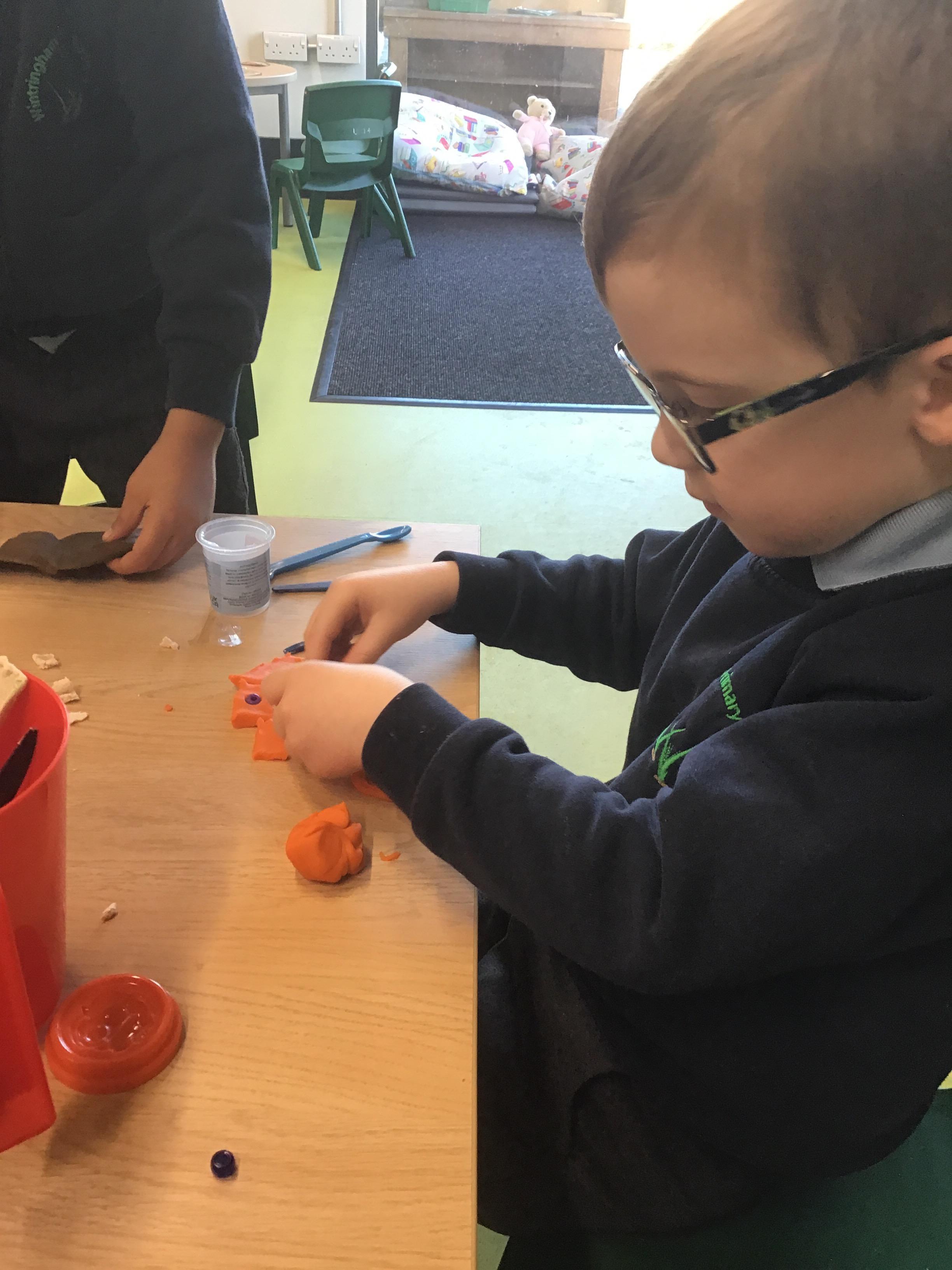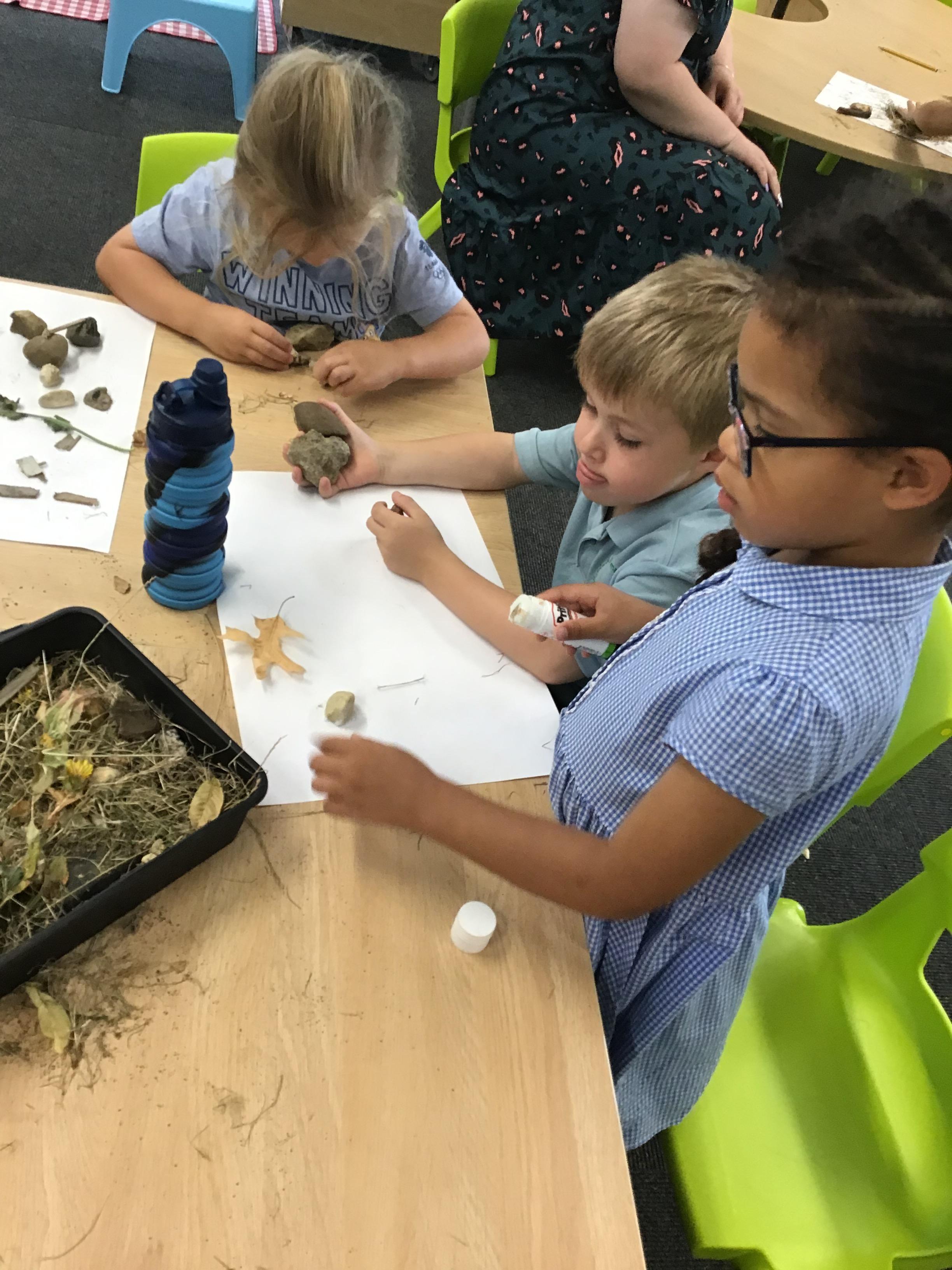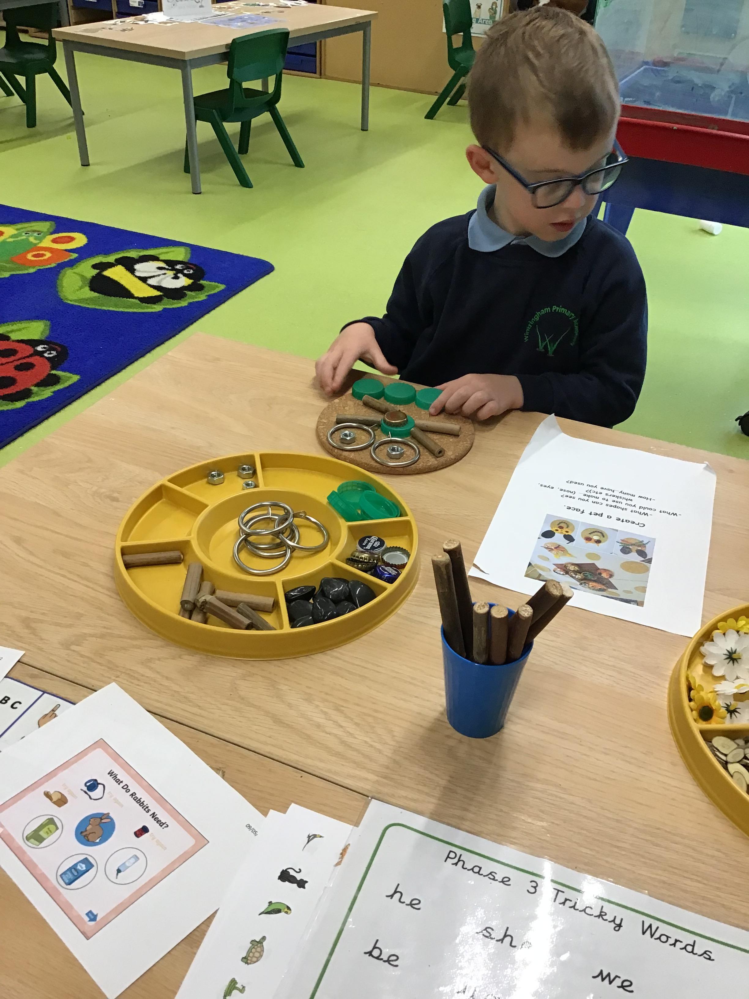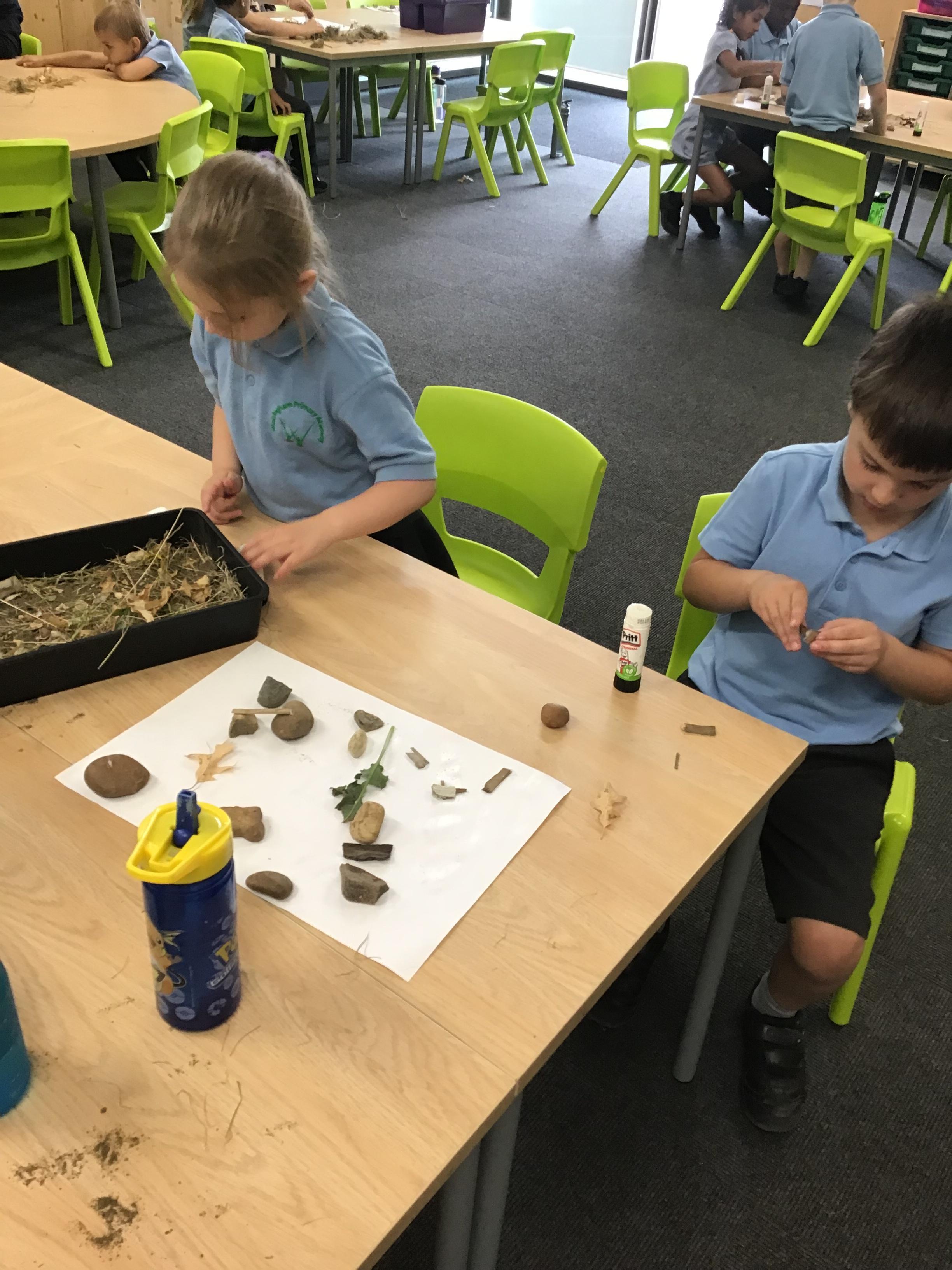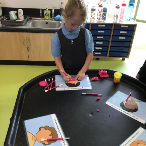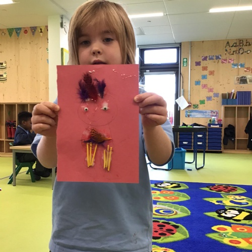 The children have settled in quickly to the new routines at school and all appear to be looking forward to starting full time next week. The children have been looking at the topic, 'ourselves.' In group time, the children have been looking at feelings and thinking about how things make us feel. In maths, the children have started to subitise numbers 1 and 2 and start to think about the number 3. The children practically made arrangements with counters to show the number 3. In continuous provision, the children have been creating pictures of their families, mark making around their favourite television characters, creating play dough faces and role playing in the home corner. Outside, the children have enjoyed mark making with chalk, exploring the climbing frame and playing in the mud kitchen. In outdoor learning, the children have represented numbers using different natural materials and made clay faces.