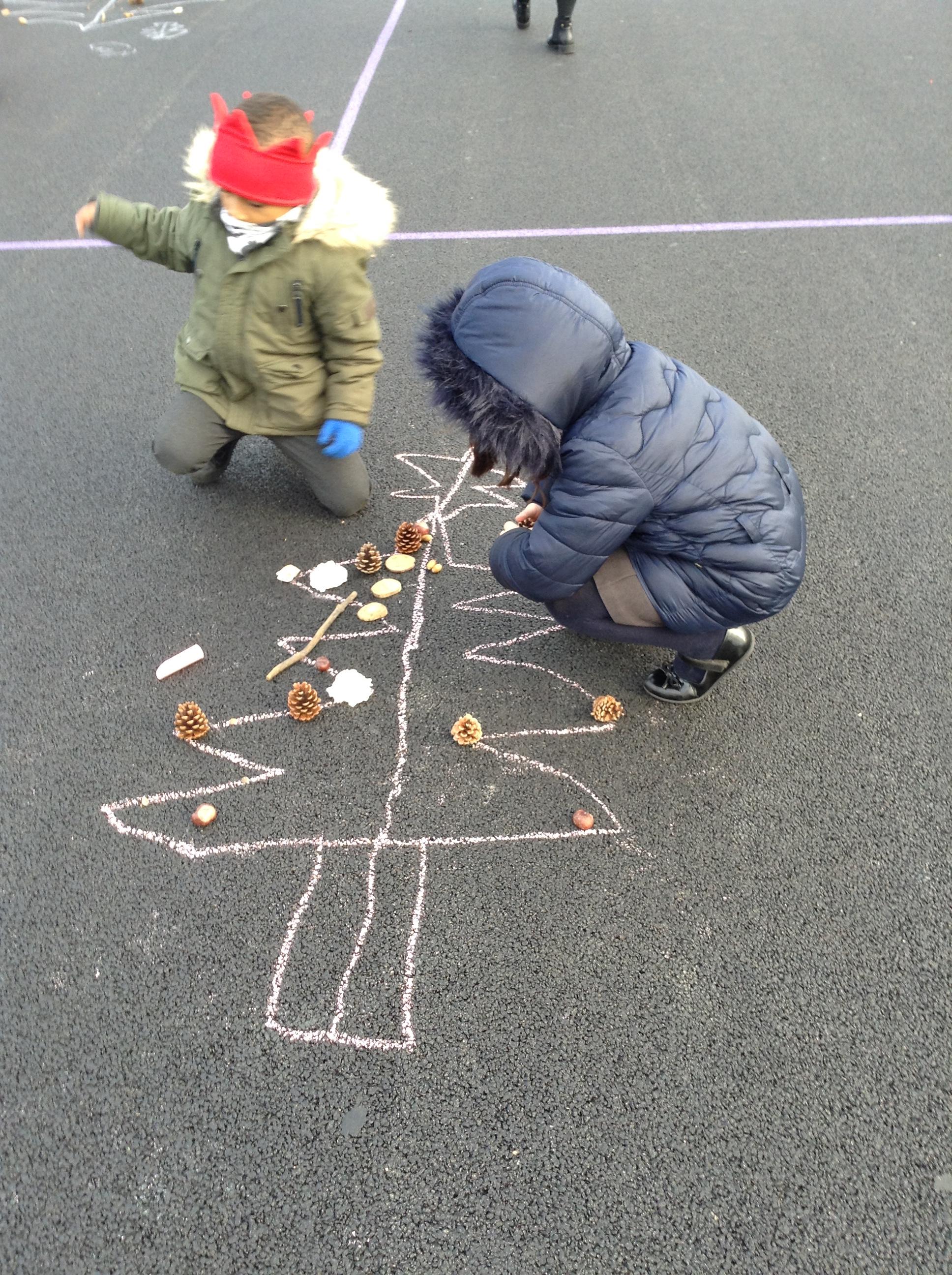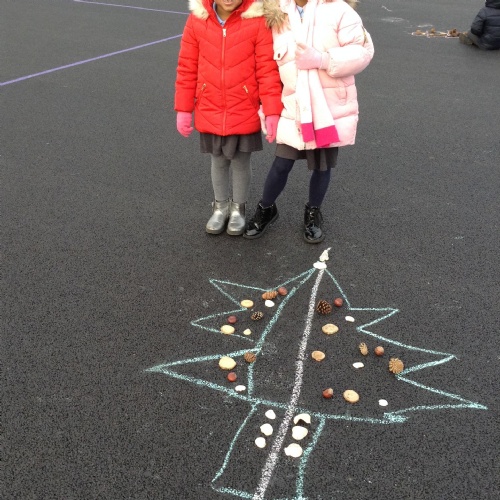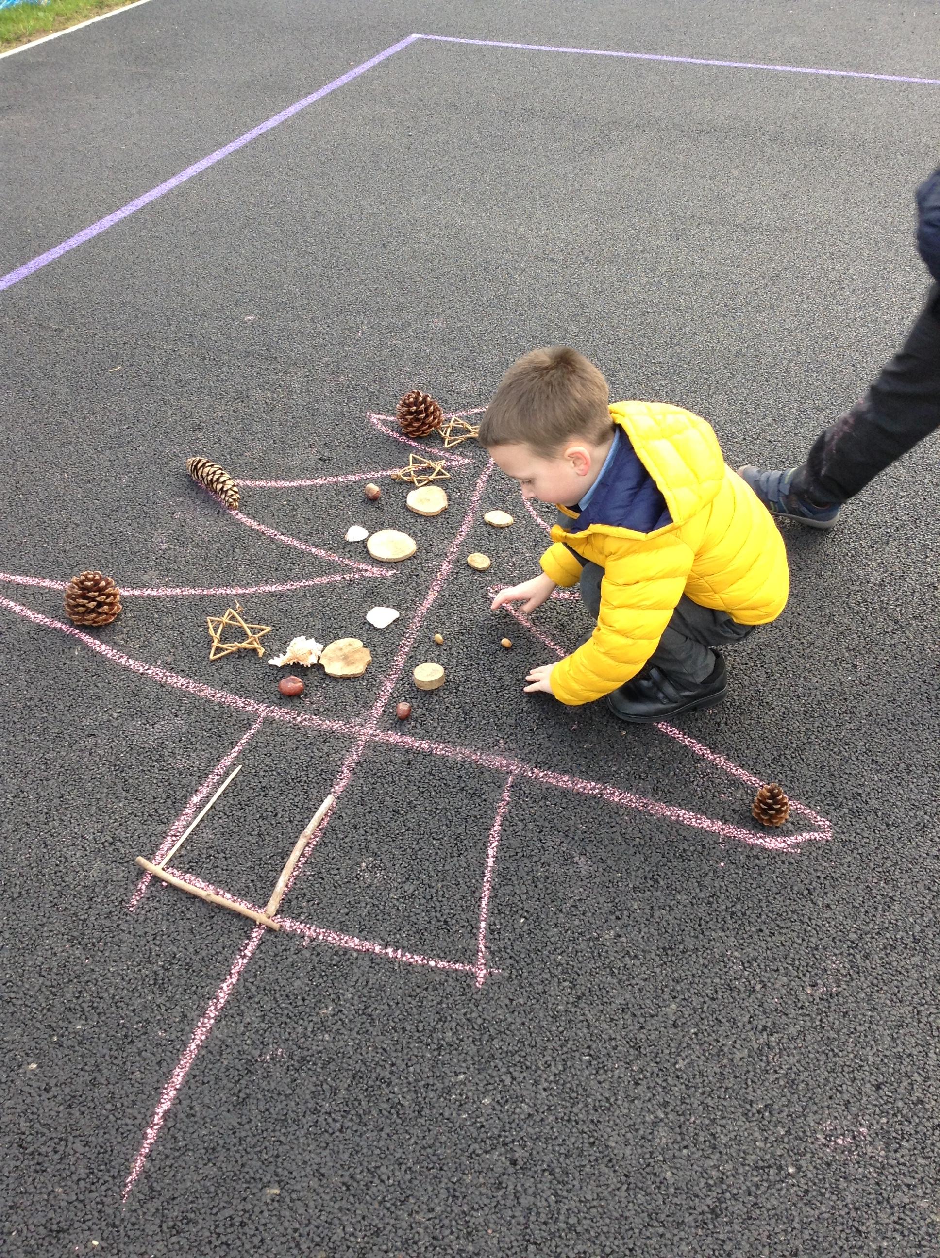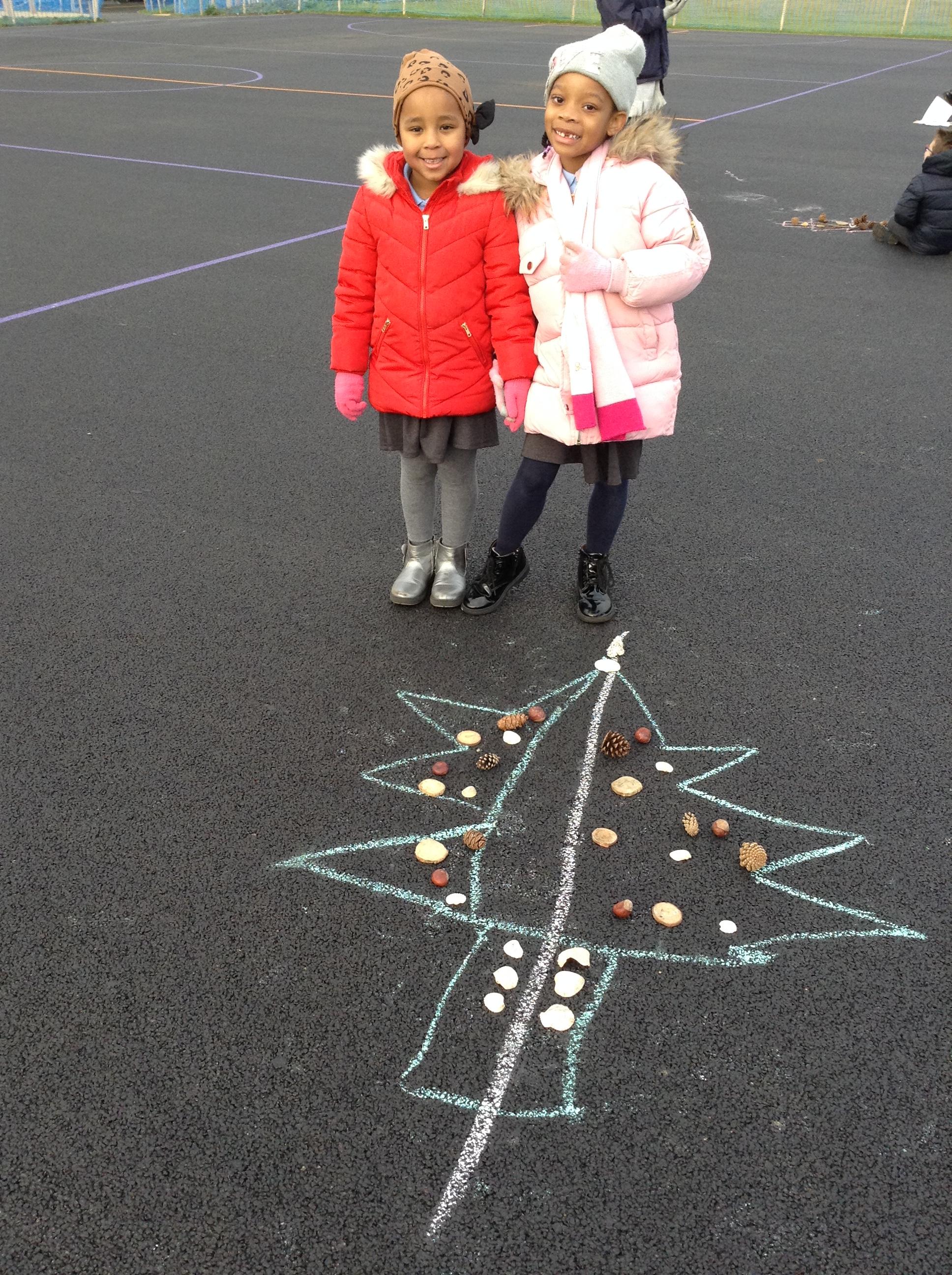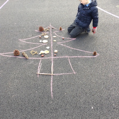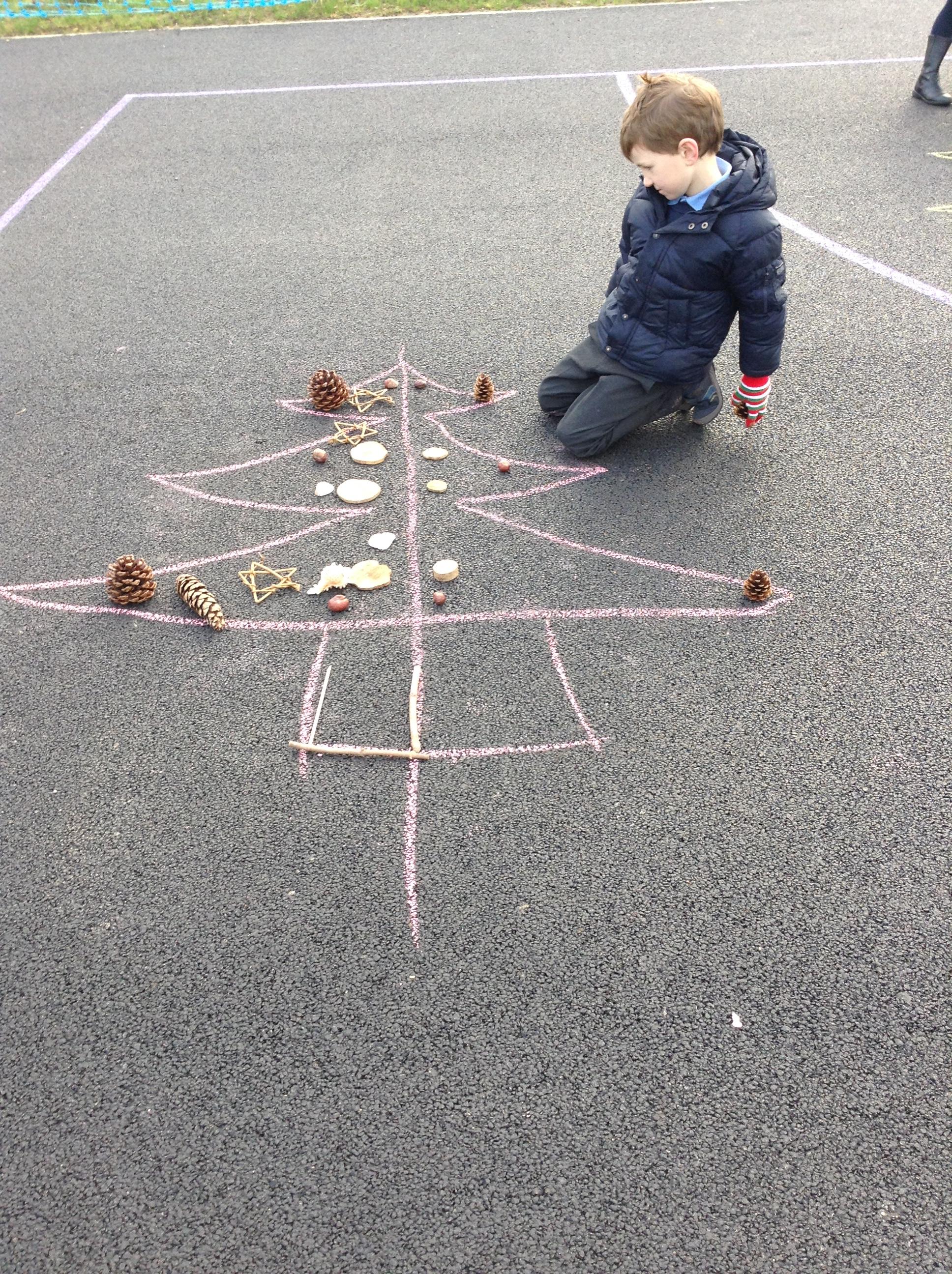 The children were very excited when they came into school on Tuesday morning and saw all of their Christmas decorations hanging up inside the classroom and in the corridor. They also really enjoyed going to their first ever whole school assembly which was the ‘wishing the lights on’ assembly. The children had to close their eyes and wish really hard for the lights to come on on the Christmas tree. They also had an opportunity to hang their home-made Christmas decorations onto the tree. The children have finished off their learning about space this week. They have really enjoyed listening to the story 'Aliens Love Underpants' and have used puppets to role-play the story, as well as thinking of adjectives to describe the different aliens in the story. The children have independently been using their phonic knowledge to write facts about the moon using the mind map created earlier on in the week. I was very impressed with the children being able to record the sounds that they could hear in the different words and that they were starting to write simple sentences using capital letters, finger spaces and full stops. For our outdoor learning this week, the children worked with the children from class 2 to draw a picture of a Christmas tree on the playground using chalk and then adding natural decorations onto it to create a symmetrical tree. The children have also been continuing to practise for the nativity performance and are getting very excited to show everyone just what they can do. For children who are speaking, please continue to rehearse and practise their lines at home as much as possible. Please note that all of the children's costumes must be in school by Monday 7th December. Next week the children will be learning to read the tricky words ‘we’, 'me' and ‘be’ and will be learning the sounds ch, ai and th in our phonics sessions.