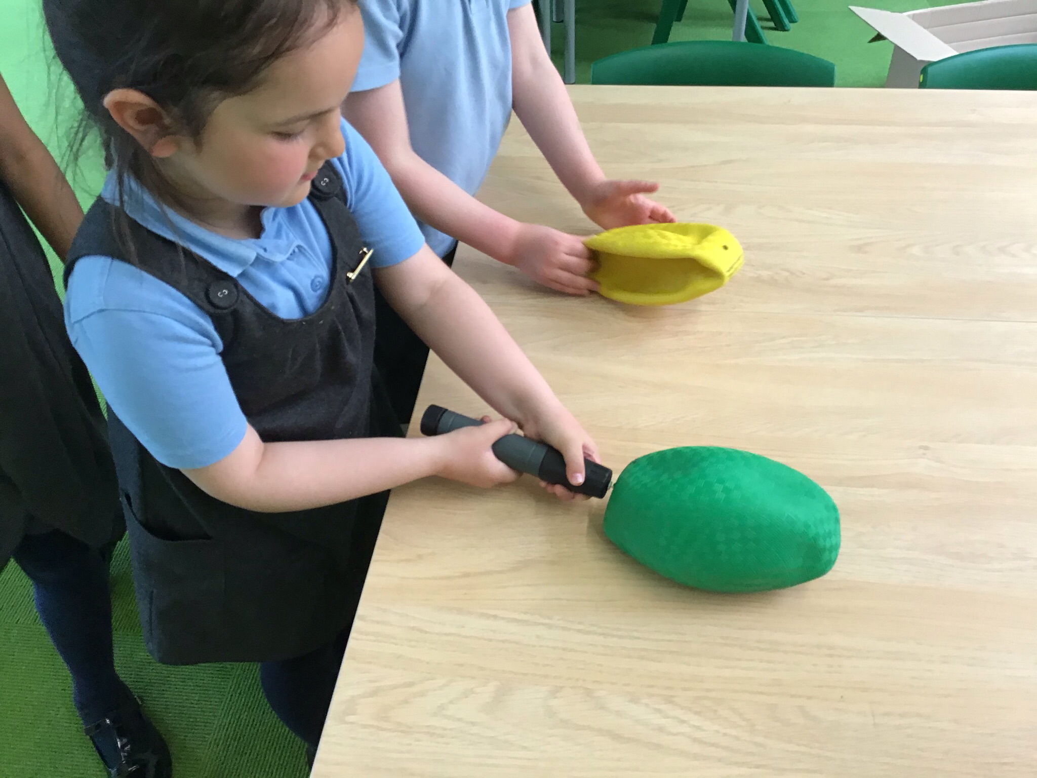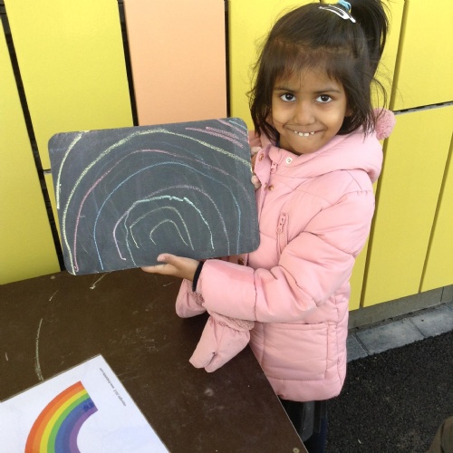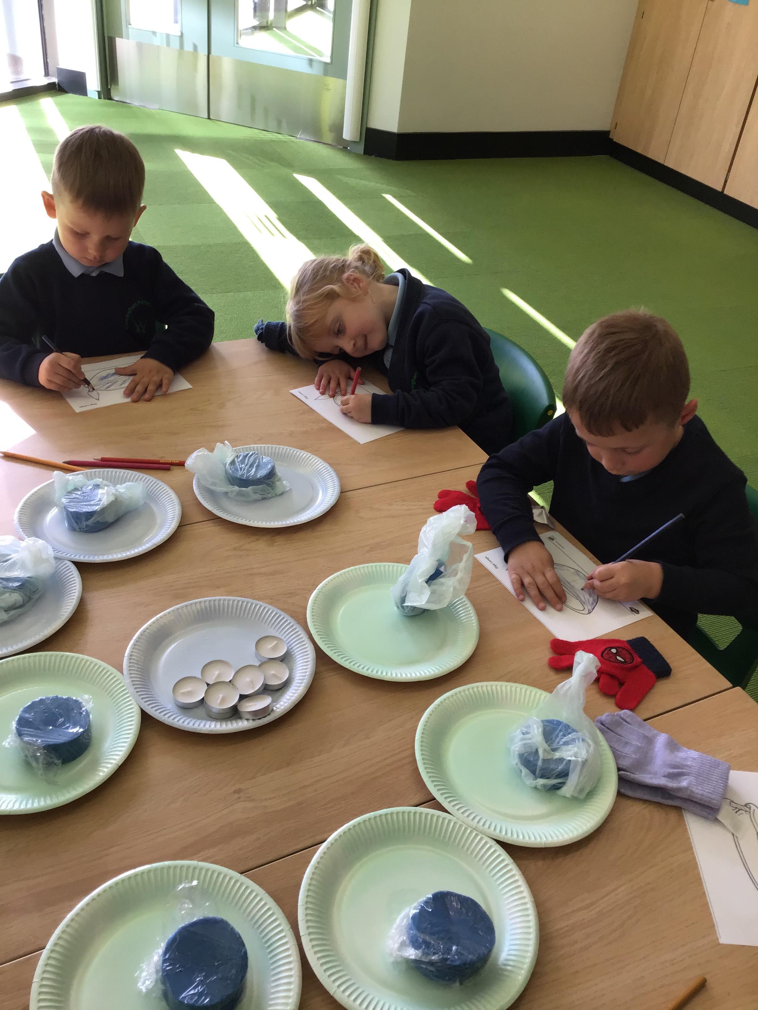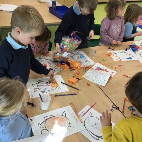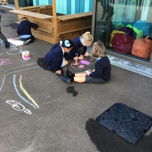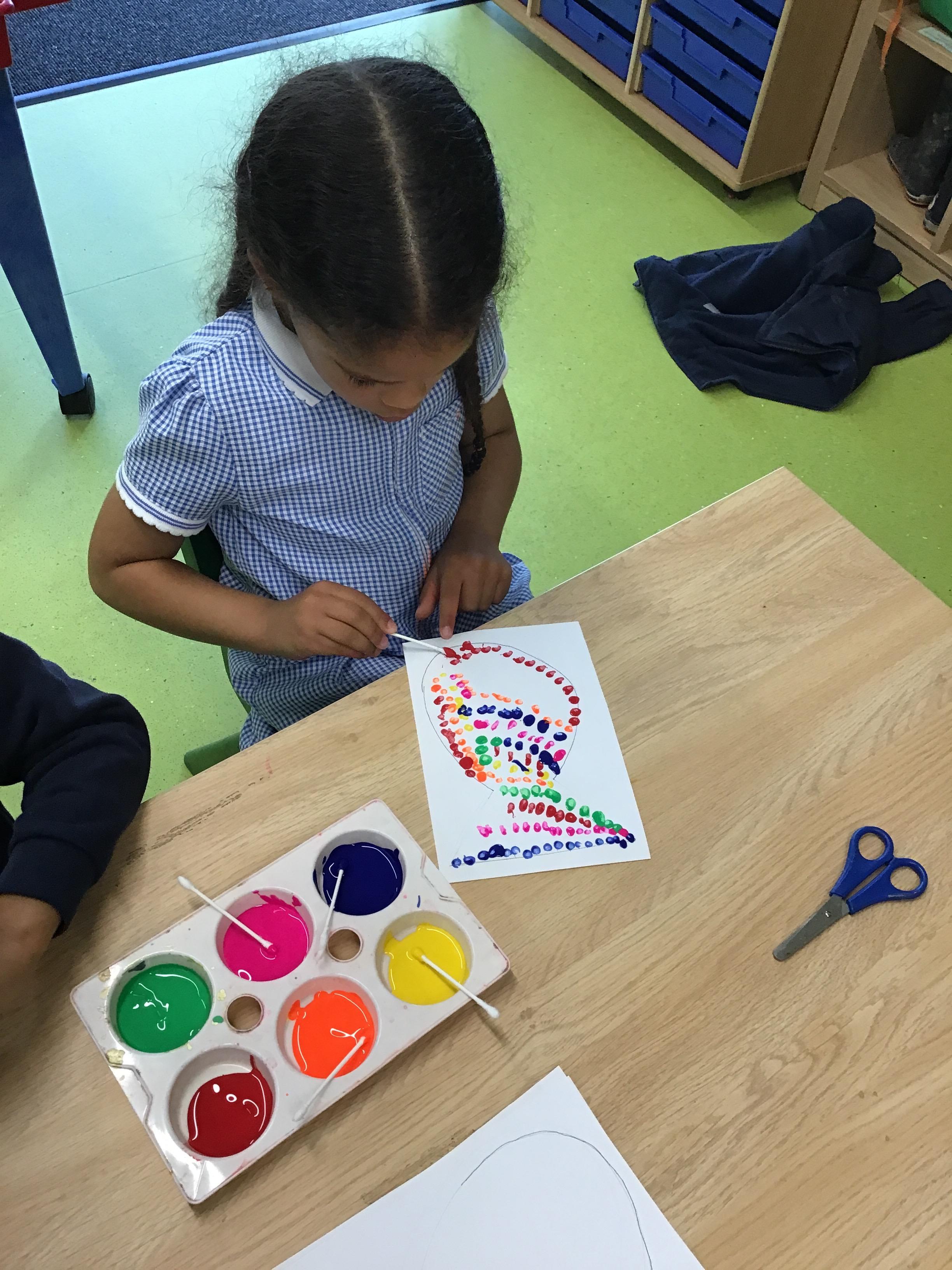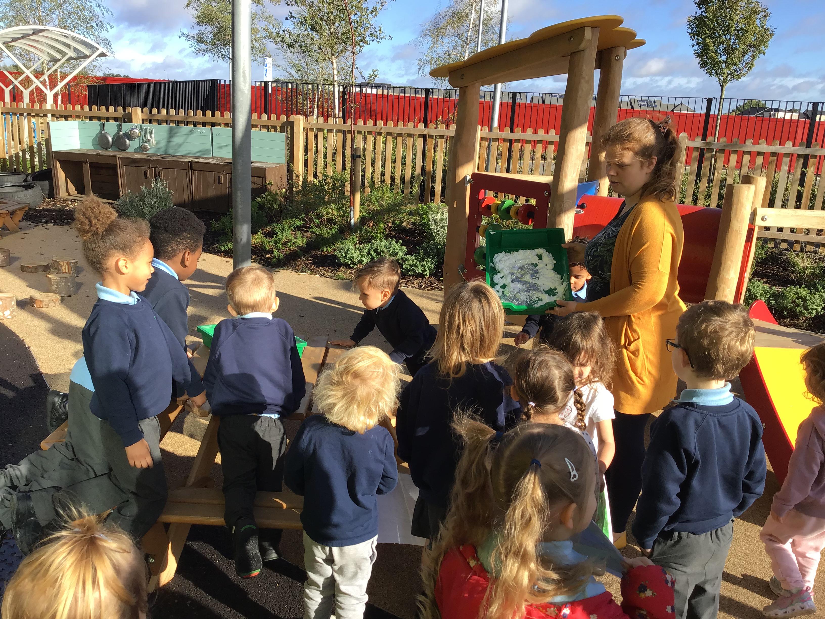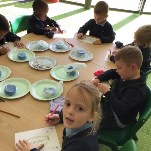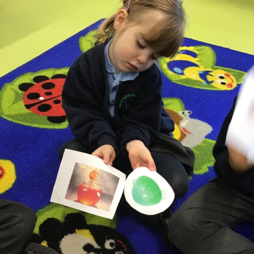 This week, the children have continued learning about the topic of food. As a class, we investigated what would happen when we put warm water over skittles. The children were firstly shown the equipment for the experiment and were asked to discuss what they thought we might be doing. The experiment was then set up and the children made some predictions about what they thought might happen, including 'There will be a rainbow on the plate' and 'The colour is going to come off the skittles'. After the water had been added to the skittles, the children were excited to see a rainbow start to appear and were then asked to make a comment about what they could see, e.g. 'The colours gone off the bottom onto the plate' and 'The colour is going into the middle, it's moving'. The children have also listened to the story Handa’s Surprise. They talked about the story, thinking about the characters and the plot. The children then tried some of the different fruits that appeared in the story, finally making fruit skewers using them. The children had to cut some of the fruit using a plastic knife. To celebrate the Hindu festival of Diwali, the children each made their own Diva lamp. They were given a ball of clay and had to use their thumbs to make an indent in it in order to fit a tea light. They created patterns around the edge using tools and then once it had dried, were able to paint and add glitter to it. I hope you are enjoying these at home. For our outdoor learning this week, the children worked with the children from class 2 to complete a photo scavenger hunt to familiarise themselves with the grove which is in the centre of the school building. They also created their own chalk paths and handprint artwork. Next week the children will be learning to read the tricky words 'no' and ‘into’ and will be learning the sounds l/ll, ss and j in our phonics sessions. We are currently in the process of setting up the fruit and vegetable initiative from the government where each child will receive a healthy snack every day. In the meantime, if your child would like to bring a piece of fruit or vegetable for a mid-morning snack please put this in their book bag. Thank you and I hope you all have a great weekend