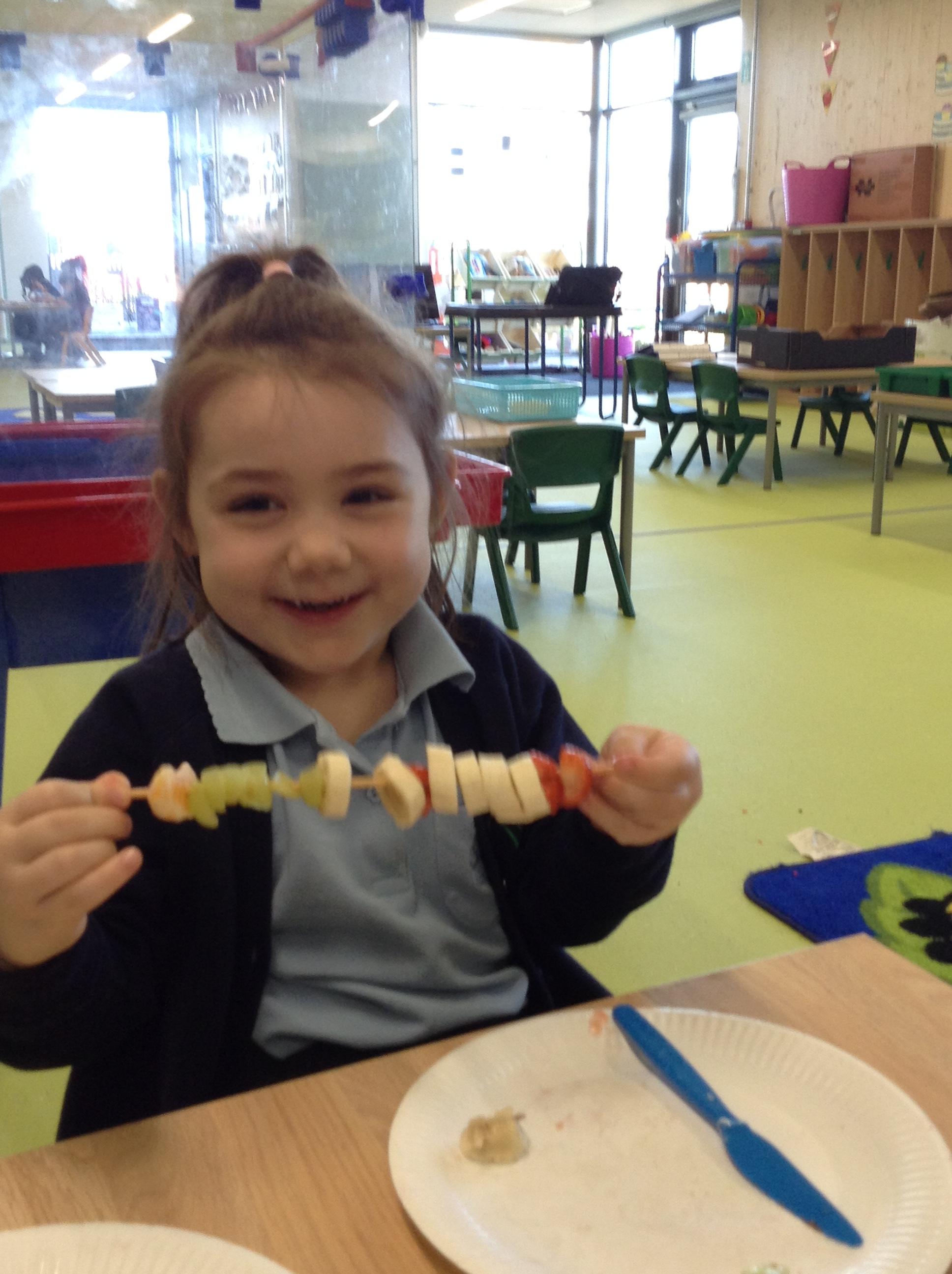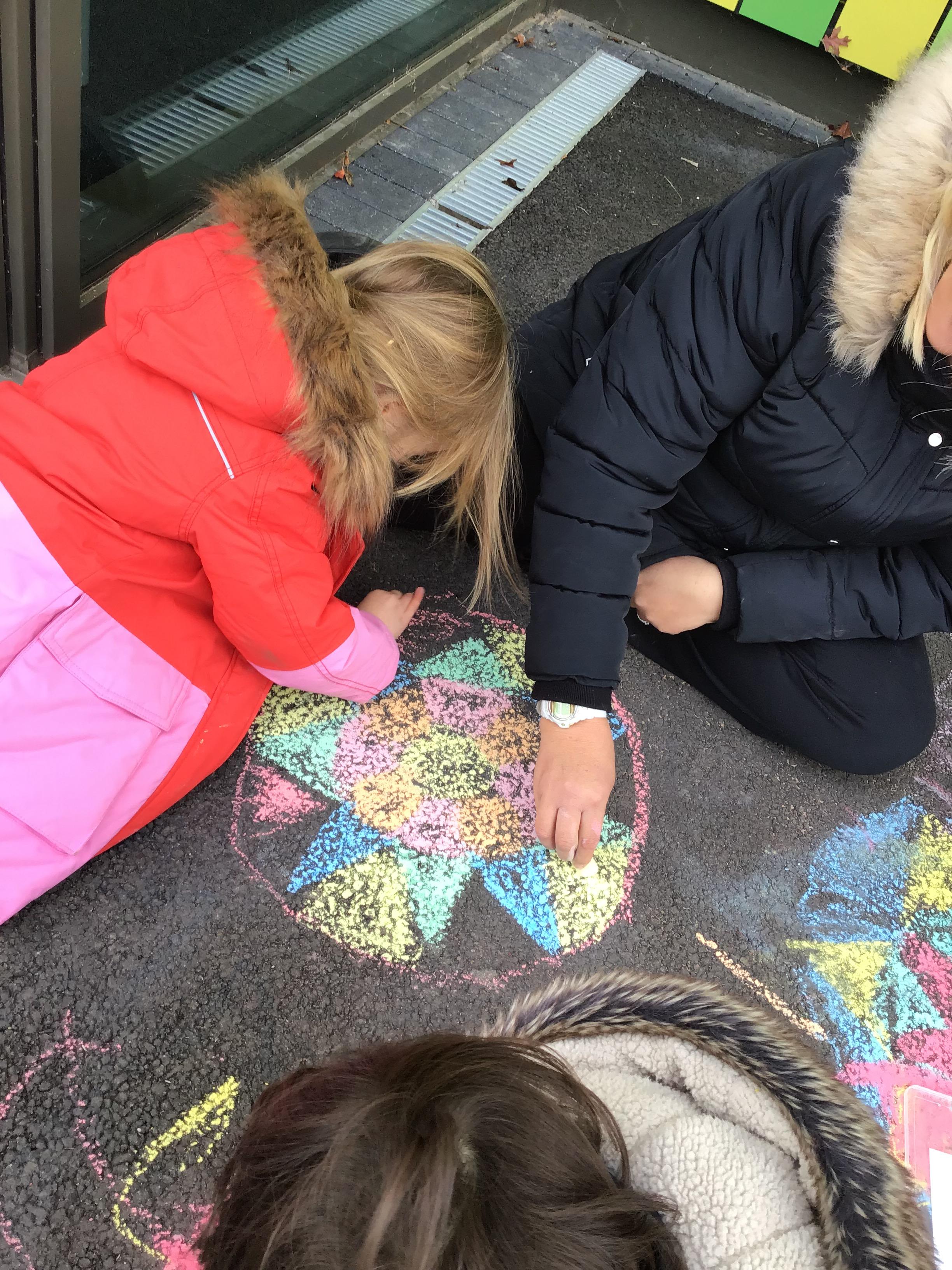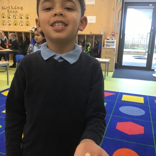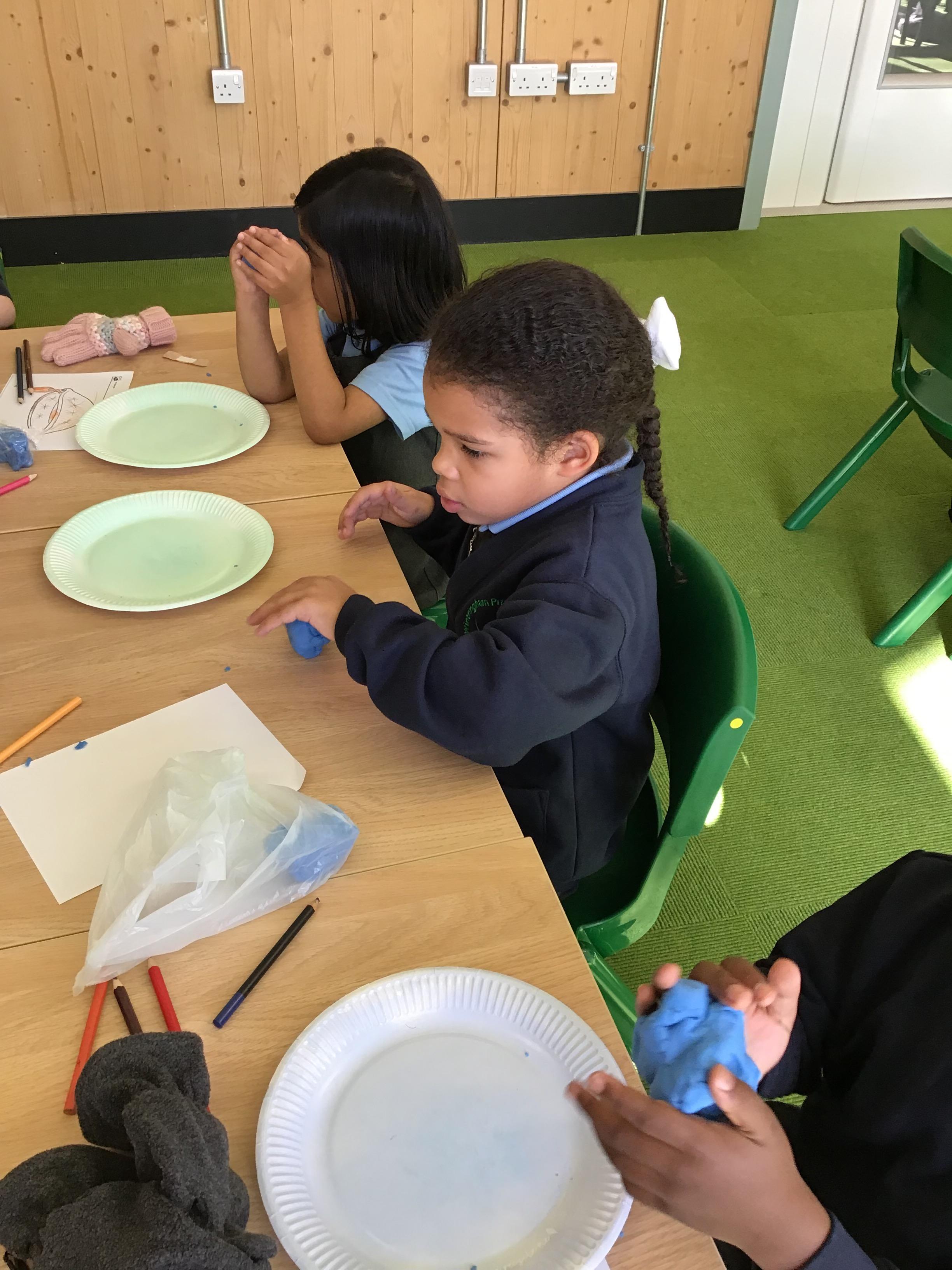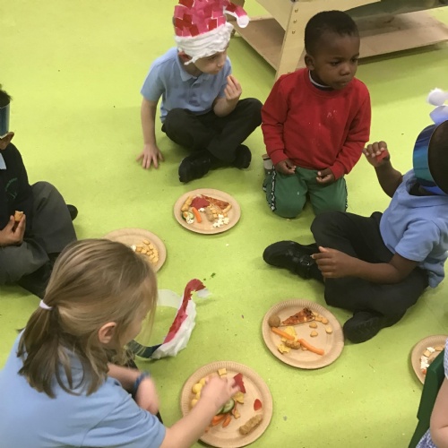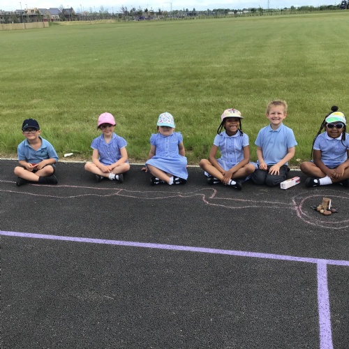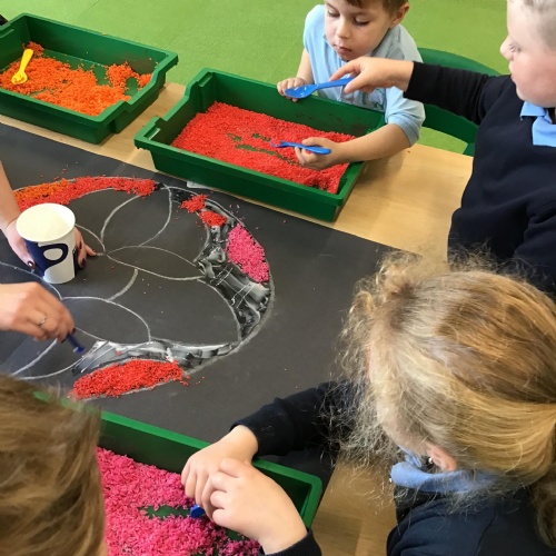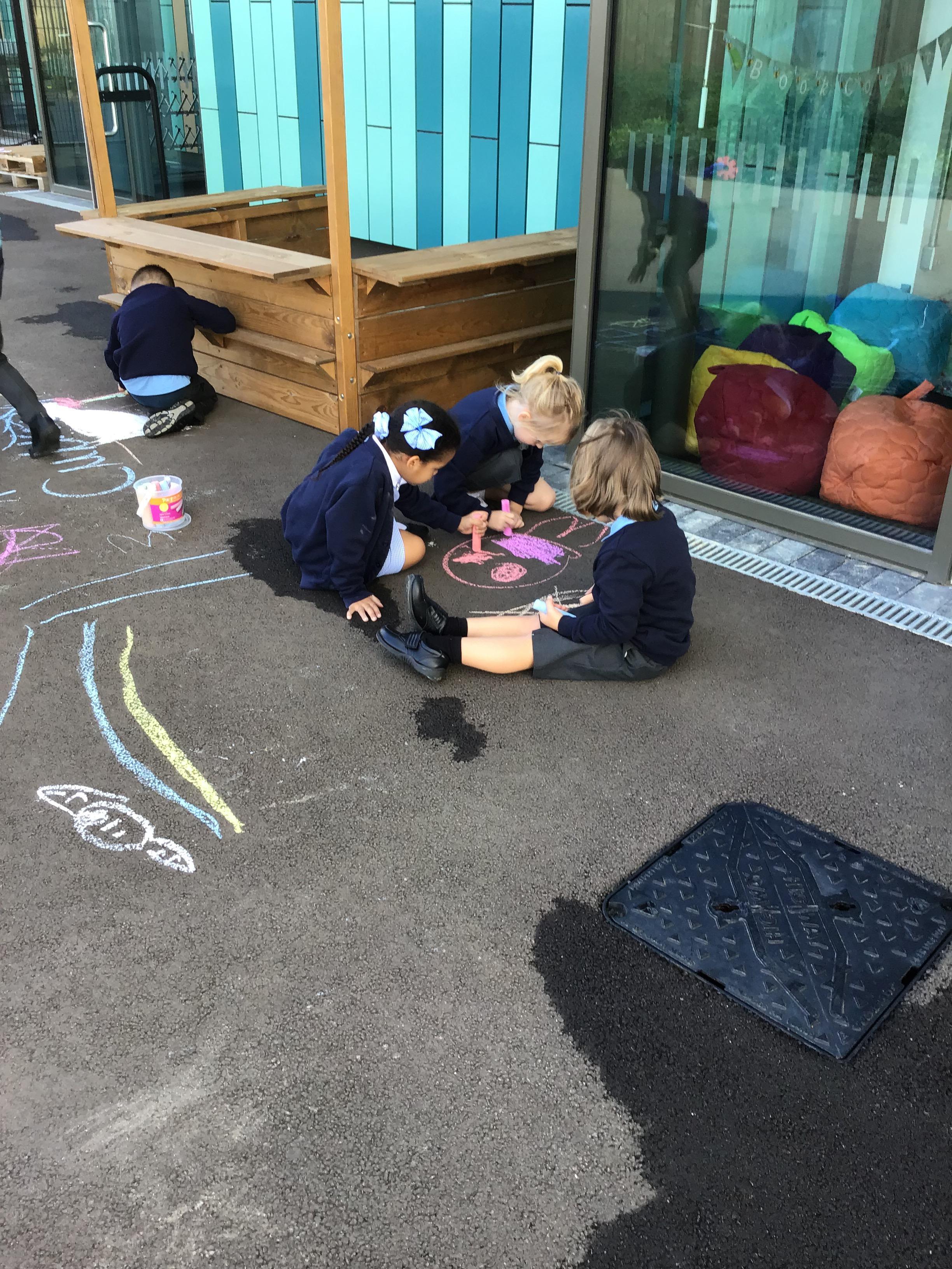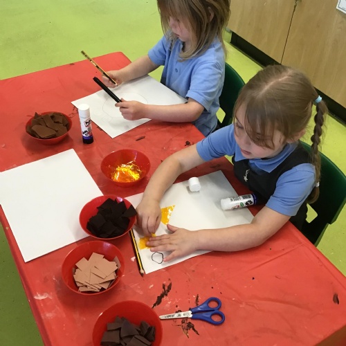 This week, the children have continued learning about the topic of food. As a class, we investigated what would happen when we put warm water over skittles. The children were firstly shown the equipment for the experiment and were asked to discuss what they thought we might be doing. The experiment was then set up and the children made some predictions about what they thought might happen, including 'There will be a rainbow on the plate' and 'The colour is going to come off the skittles'. After the water had been added to the skittles, the children were excited to see a rainbow start to appear and were then asked to make a comment about what they could see, e.g. 'The colours gone off the bottom onto the plate' and 'The colour is going into the middle, it's moving'. The children have also listened to the story Handa’s Surprise. They talked about the story, thinking about the characters and the plot. The children then tried some of the different fruits that appeared in the story, finally making fruit skewers using them. The children had to cut some of the fruit using a plastic knife. To celebrate the Hindu festival of Diwali, the children each made their own Diva lamp. They were given a ball of clay and had to use their thumbs to make an indent in it in order to fit a tea light. They created patterns around the edge using tools and then once it had dried, were able to paint and add glitter to it. I hope you are enjoying these at home. For our outdoor learning this week, the children worked with the children from class 2 to complete a photo scavenger hunt to familiarise themselves with the grove which is in the centre of the school building. They also created their own chalk paths and handprint artwork. Next week the children will be learning to read the tricky words 'no' and ‘into’ and will be learning the sounds l/ll, ss and j in our phonics sessions. We are currently in the process of setting up the fruit and vegetable initiative from the government where each child will receive a healthy snack every day. In the meantime, if your child would like to bring a piece of fruit or vegetable for a mid-morning snack please put this in their book bag. Thank you and I hope you all have a great weekend