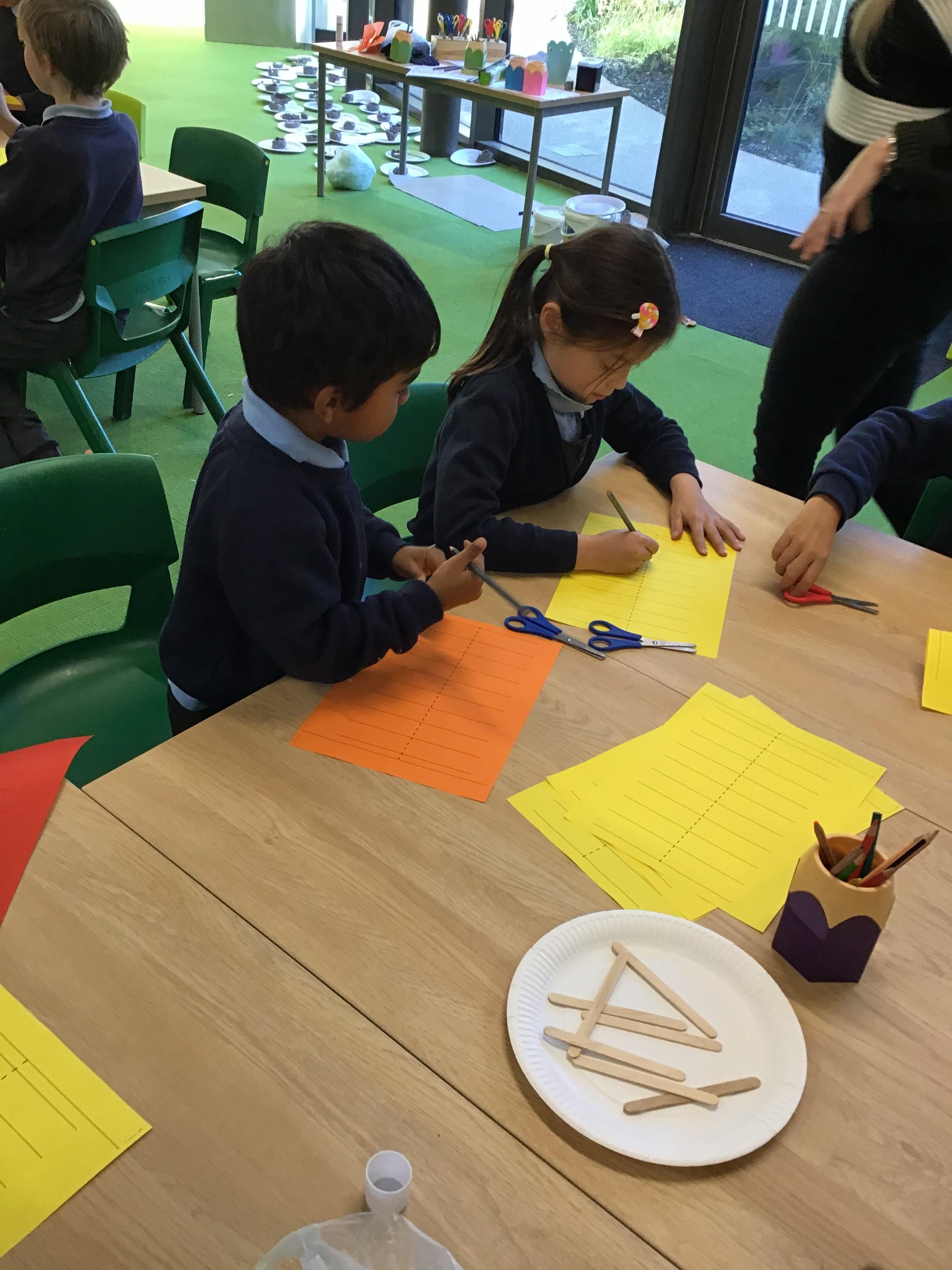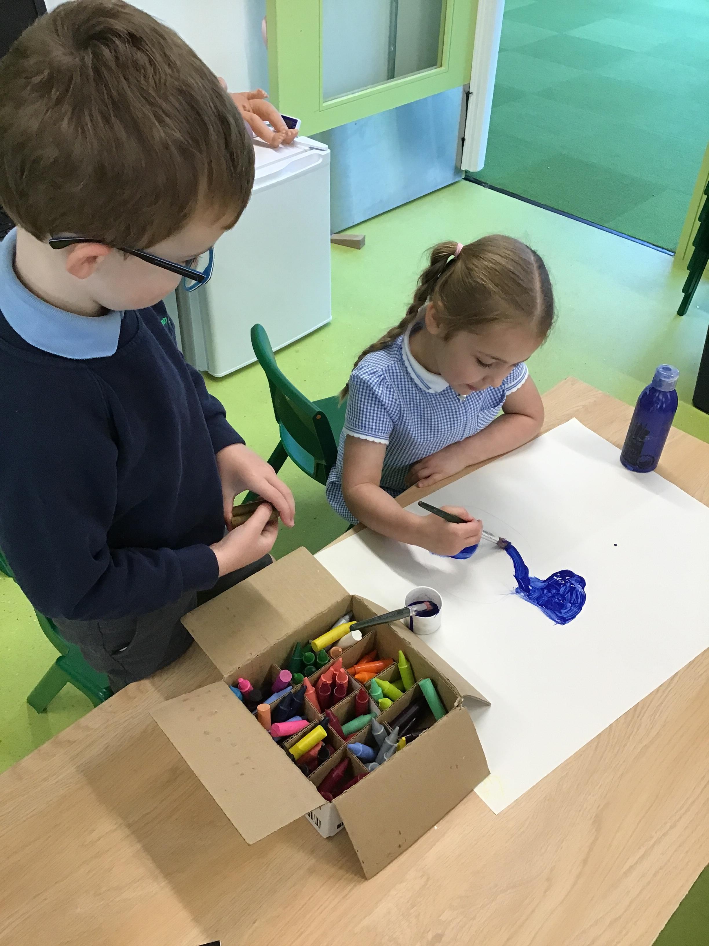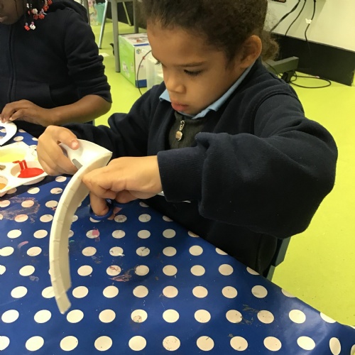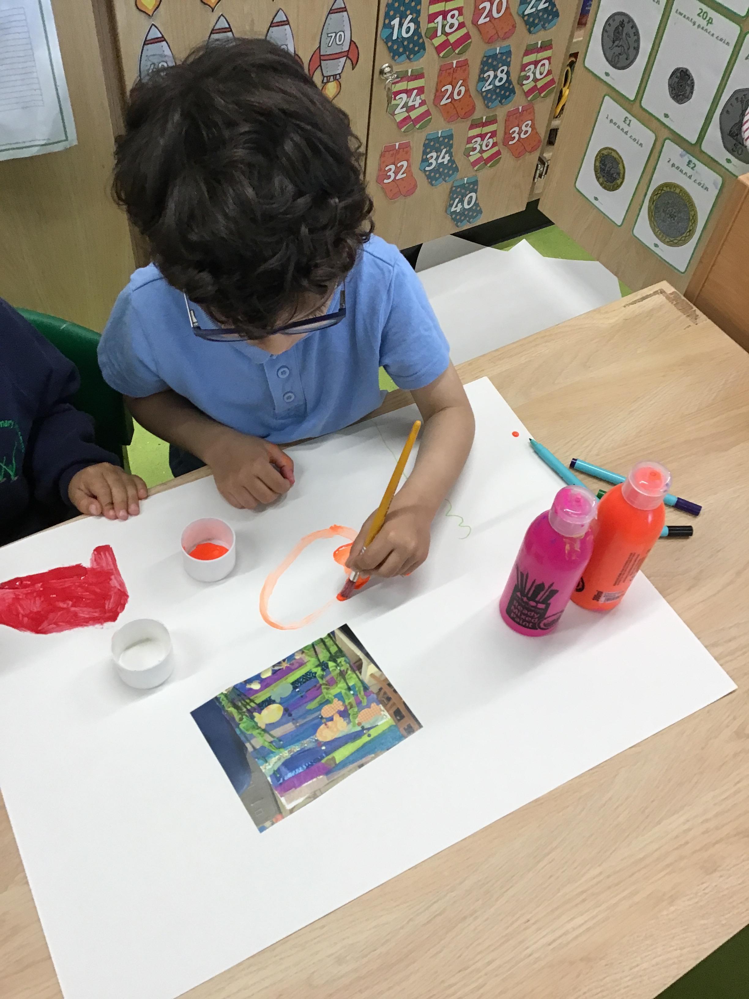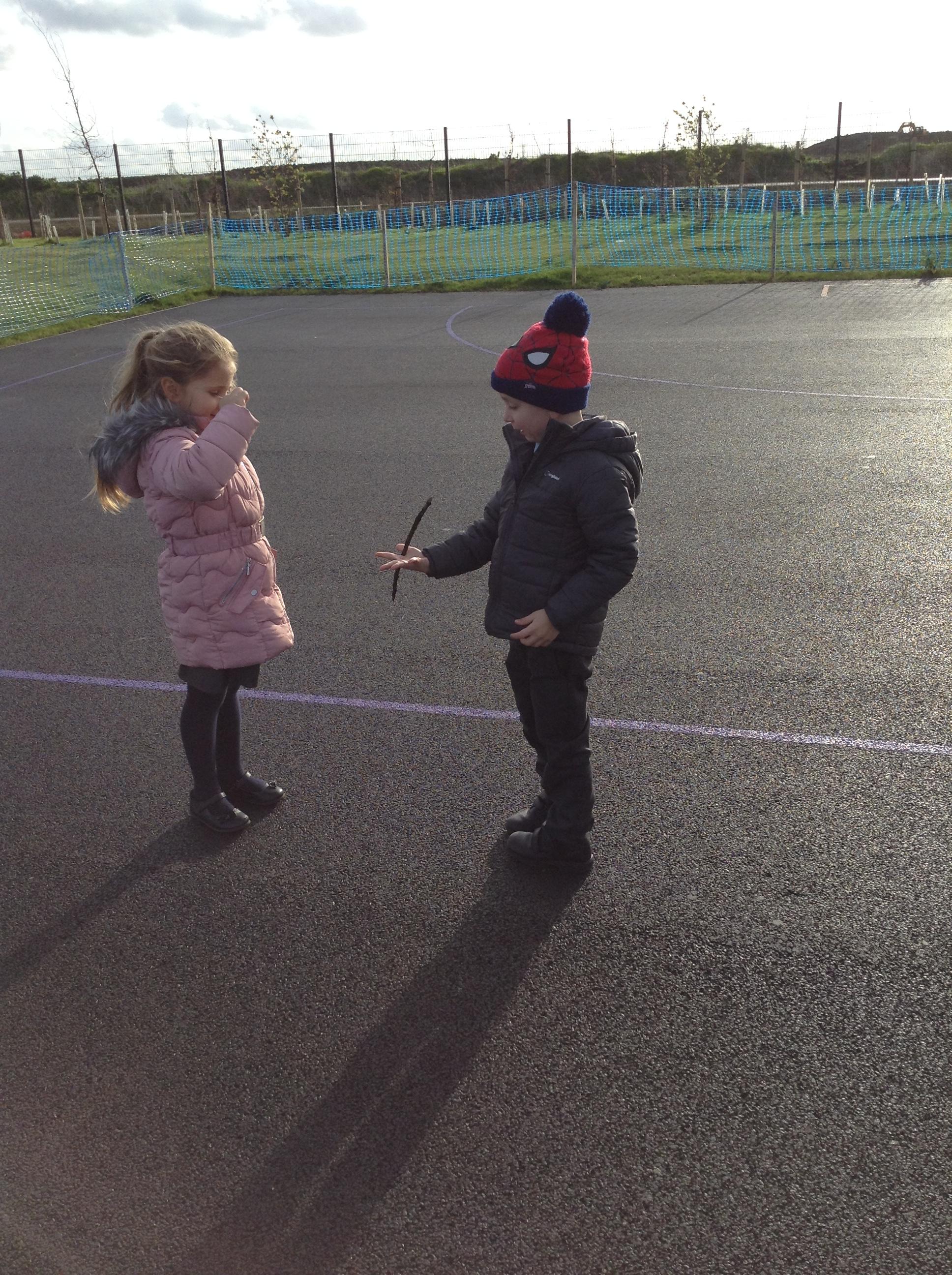 This week, the children have continued learning about the topic of food. As a class, we investigated what would happen when we put warm water over skittles. The children were firstly shown the equipment for the experiment and were asked to discuss what they thought we might be doing. The experiment was then set up and the children made some predictions about what they thought might happen, including 'There will be a rainbow on the plate' and 'The colour is going to come off the skittles'. After the water had been added to the skittles, the children were excited to see a rainbow start to appear and were then asked to make a comment about what they could see, e.g. 'The colours gone off the bottom onto the plate' and 'The colour is going into the middle, it's moving'. The children have also listened to the story Handa’s Surprise. They talked about the story, thinking about the characters and the plot. The children then tried some of the different fruits that appeared in the story, finally making fruit skewers using them. The children had to cut some of the fruit using a plastic knife. To celebrate the Hindu festival of Diwali, the children each made their own Diva lamp. They were given a ball of clay and had to use their thumbs to make an indent in it in order to fit a tea light. They created patterns around the edge using tools and then once it had dried, were able to paint and add glitter to it. I hope you are enjoying these at home. For our outdoor learning this week, the children worked with the children from class 2 to complete a photo scavenger hunt to familiarise themselves with the grove which is in the centre of the school building. They also created their own chalk paths and handprint artwork. Next week the children will be learning to read the tricky words 'no' and ‘into’ and will be learning the sounds l/ll, ss and j in our phonics sessions. We are currently in the process of setting up the fruit and vegetable initiative from the government where each child will receive a healthy snack every day. In the meantime, if your child would like to bring a piece of fruit or vegetable for a mid-morning snack please put this in their book bag. Thank you and I hope you all have a great weekend