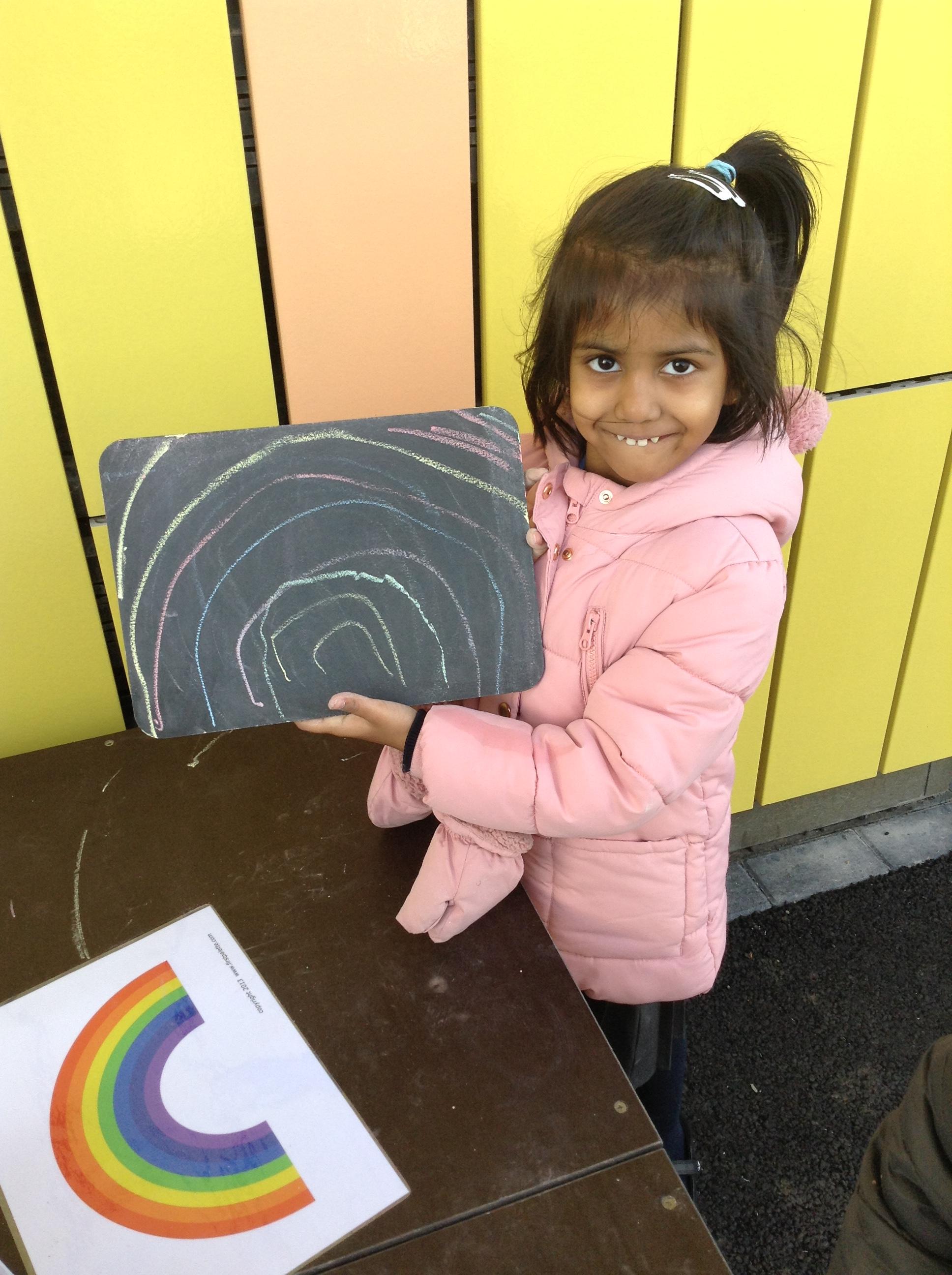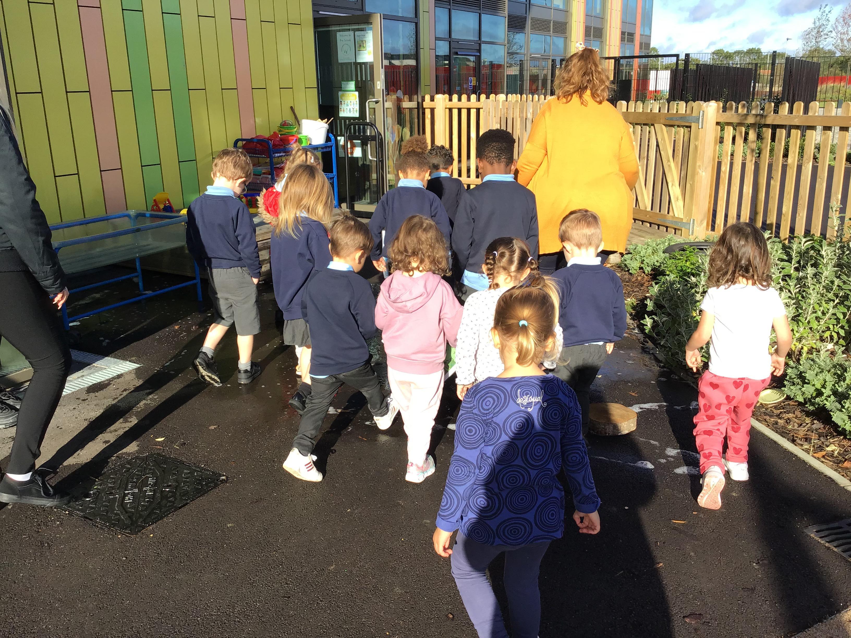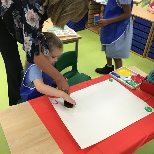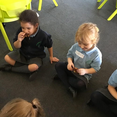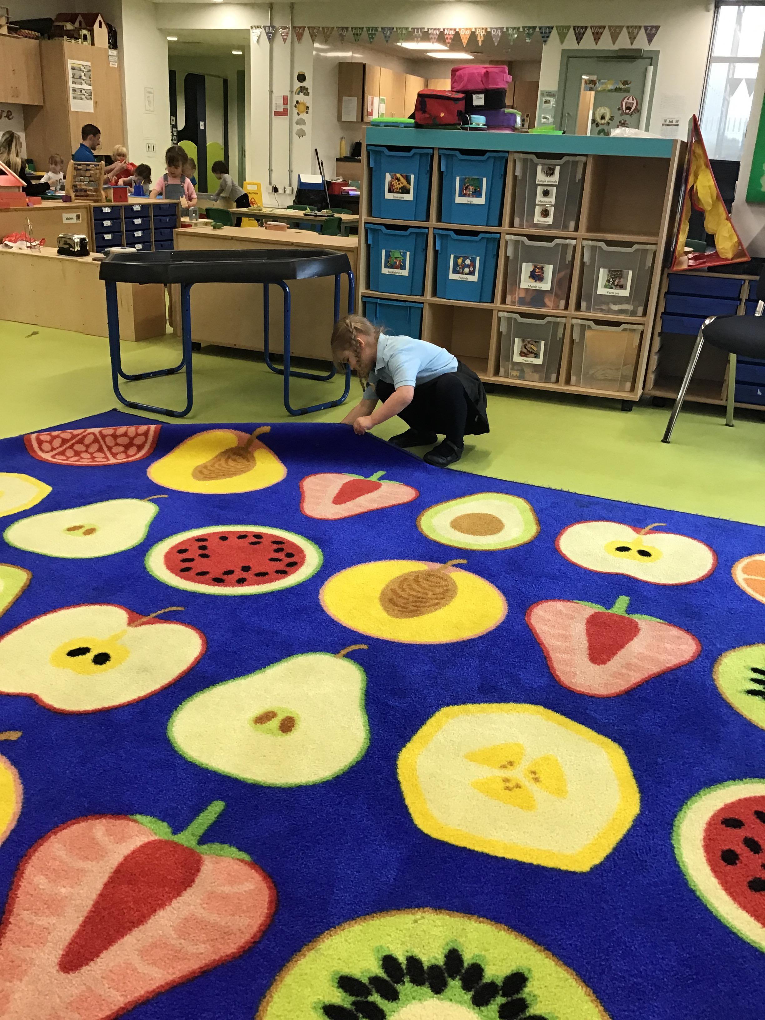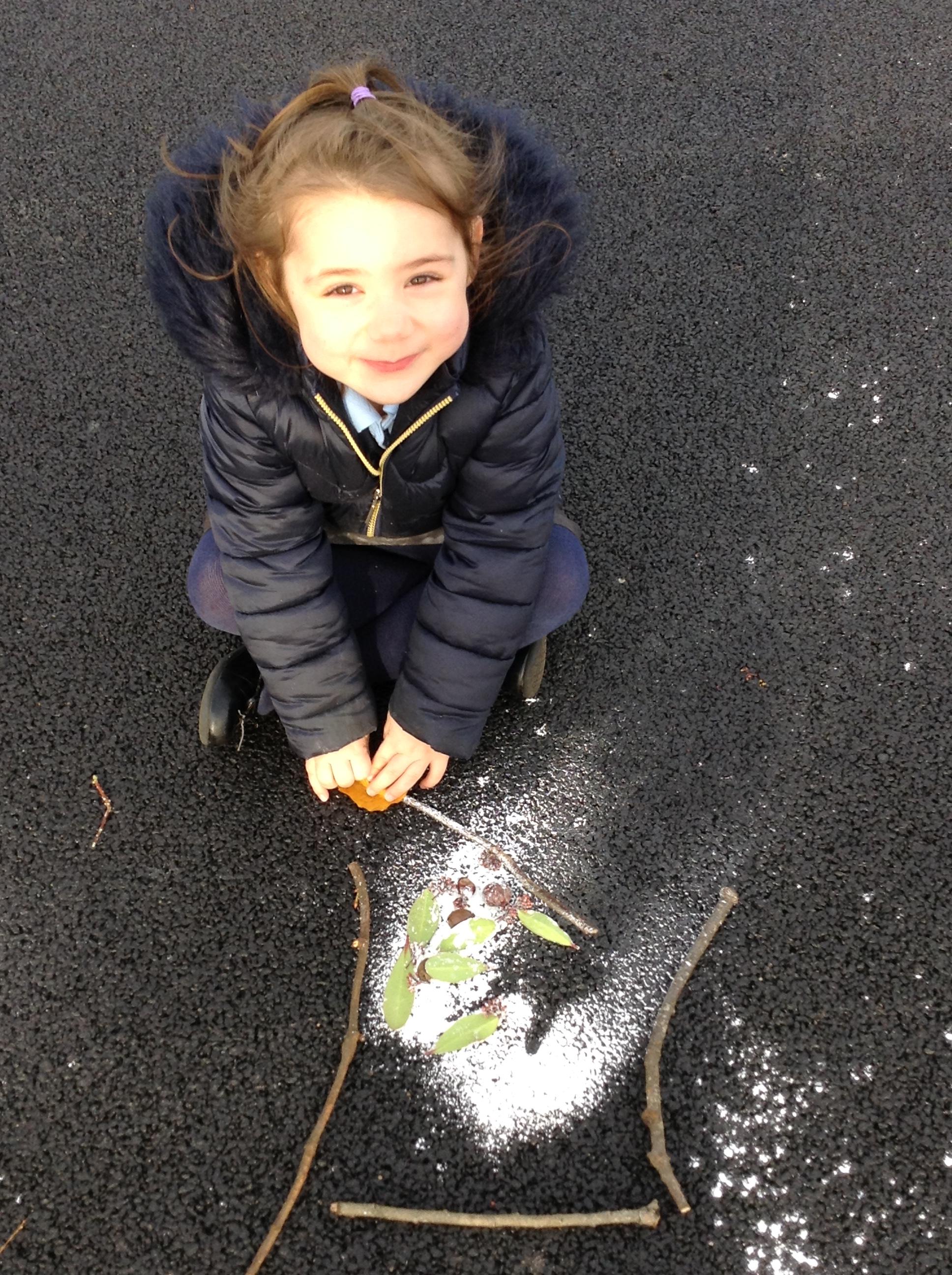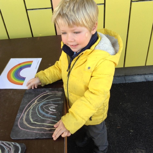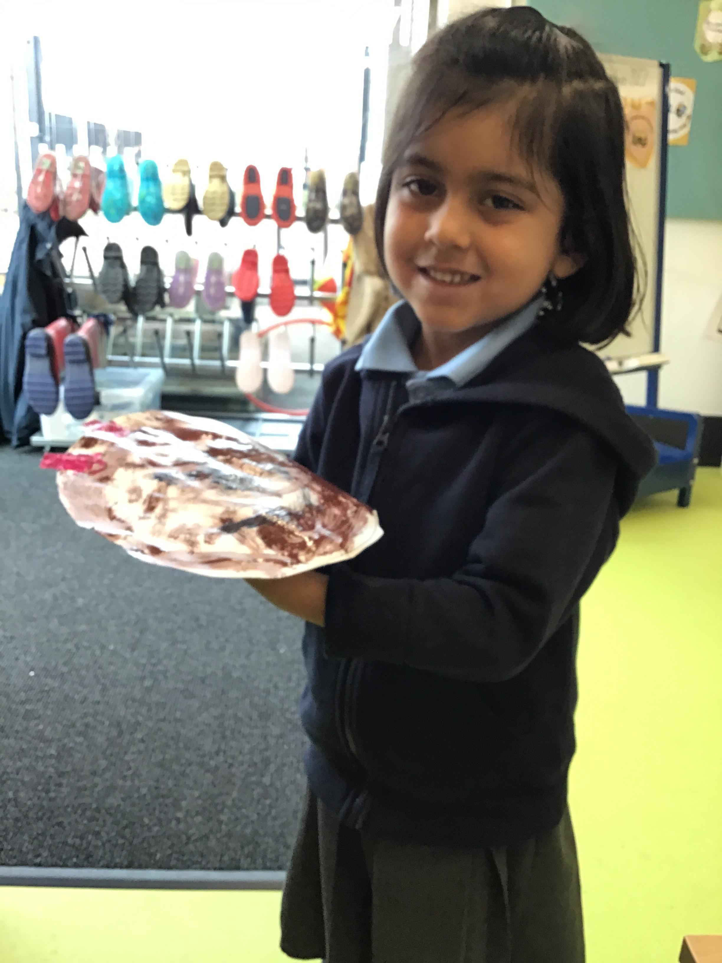 This week, the children have continued learning about the topic of food. As a class, we investigated what would happen when we put warm water over skittles. The children were firstly shown the equipment for the experiment and were asked to discuss what they thought we might be doing. The experiment was then set up and the children made some predictions about what they thought might happen, including 'There will be a rainbow on the plate' and 'The colour is going to come off the skittles'. After the water had been added to the skittles, the children were excited to see a rainbow start to appear and were then asked to make a comment about what they could see, e.g. 'The colours gone off the bottom onto the plate' and 'The colour is going into the middle, it's moving'. The children have also listened to the story Handa’s Surprise. They talked about the story, thinking about the characters and the plot. The children then tried some of the different fruits that appeared in the story, finally making fruit skewers using them. The children had to cut some of the fruit using a plastic knife. To celebrate the Hindu festival of Diwali, the children each made their own Diva lamp. They were given a ball of clay and had to use their thumbs to make an indent in it in order to fit a tea light. They created patterns around the edge using tools and then once it had dried, were able to paint and add glitter to it. I hope you are enjoying these at home. For our outdoor learning this week, the children worked with the children from class 2 to complete a photo scavenger hunt to familiarise themselves with the grove which is in the centre of the school building. They also created their own chalk paths and handprint artwork. Next week the children will be learning to read the tricky words 'no' and ‘into’ and will be learning the sounds l/ll, ss and j in our phonics sessions. We are currently in the process of setting up the fruit and vegetable initiative from the government where each child will receive a healthy snack every day. In the meantime, if your child would like to bring a piece of fruit or vegetable for a mid-morning snack please put this in their book bag. Thank you and I hope you all have a great weekend