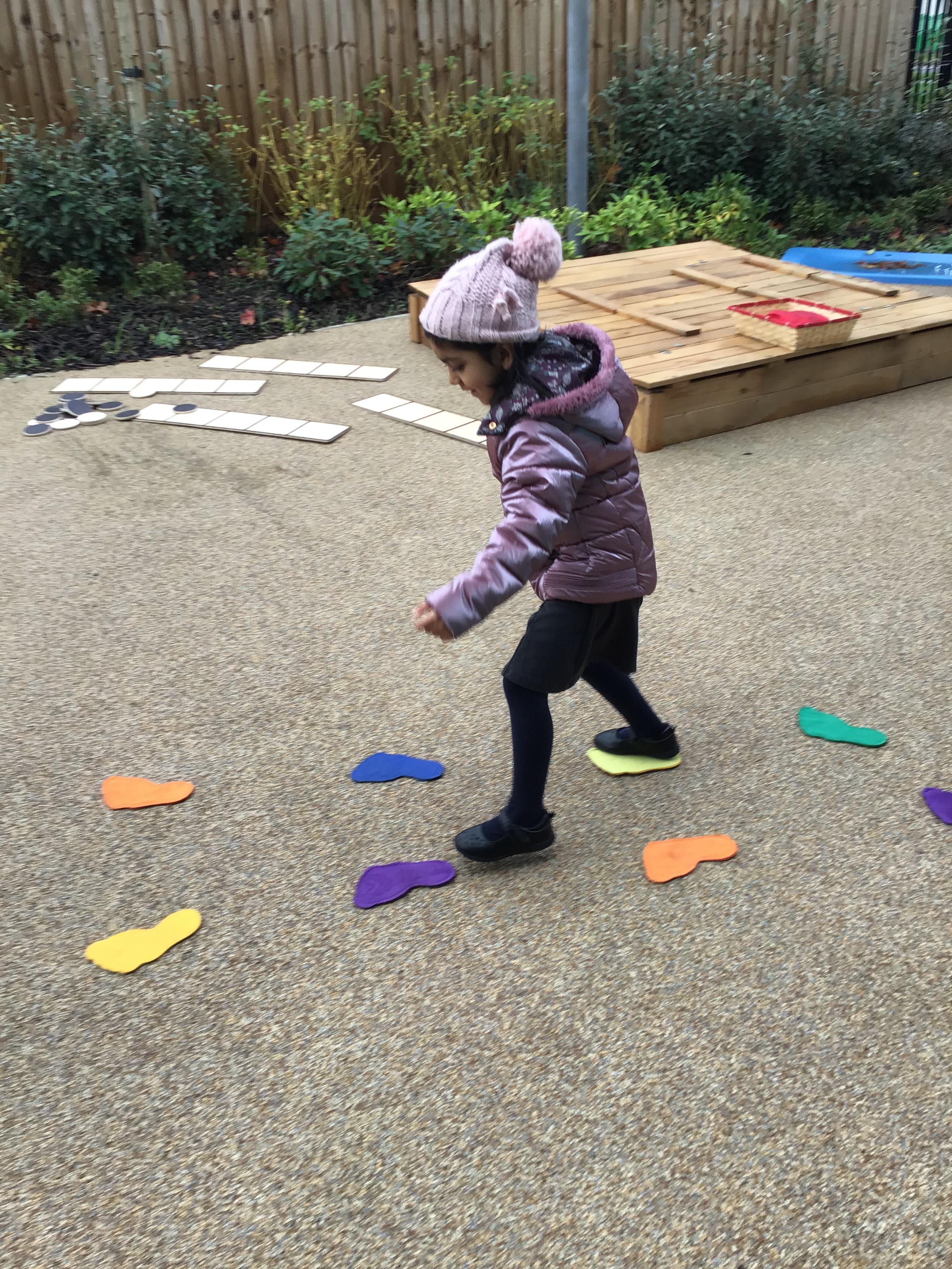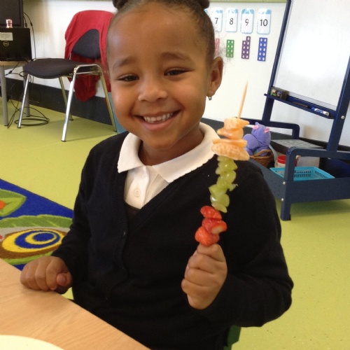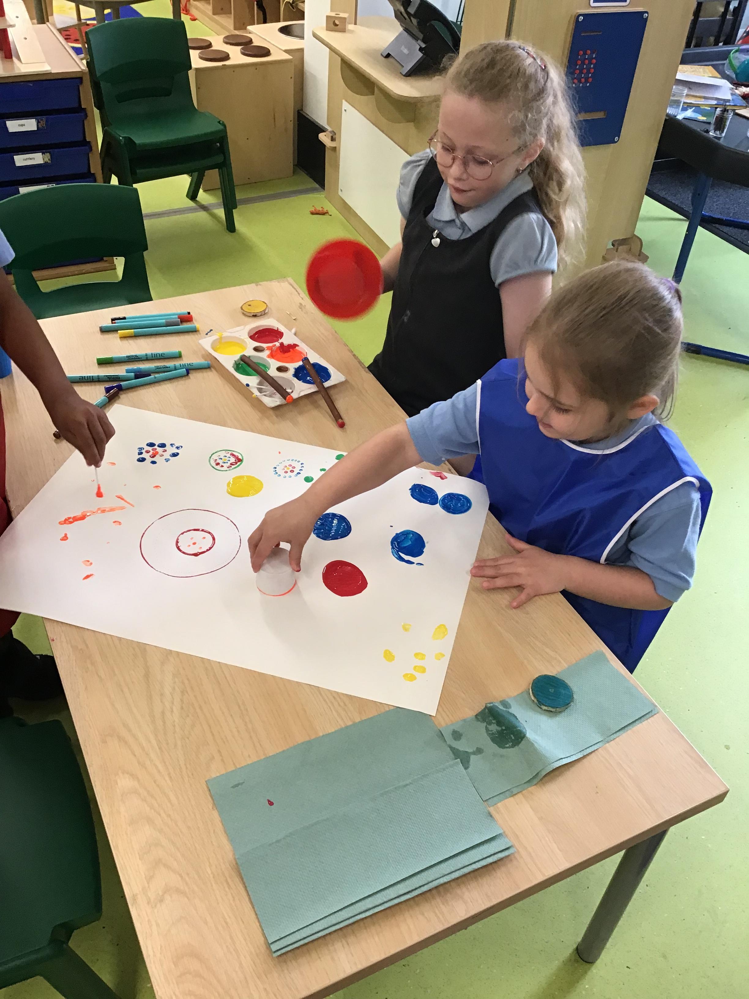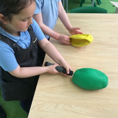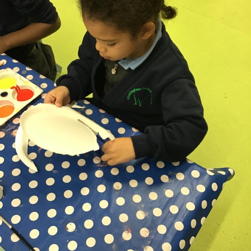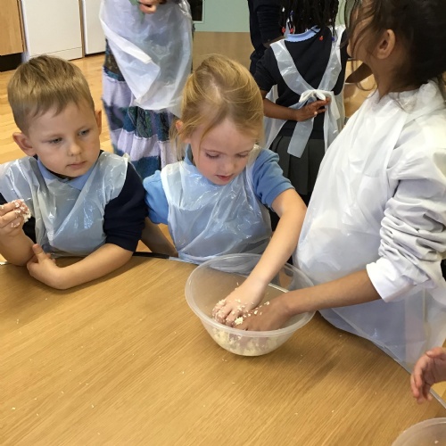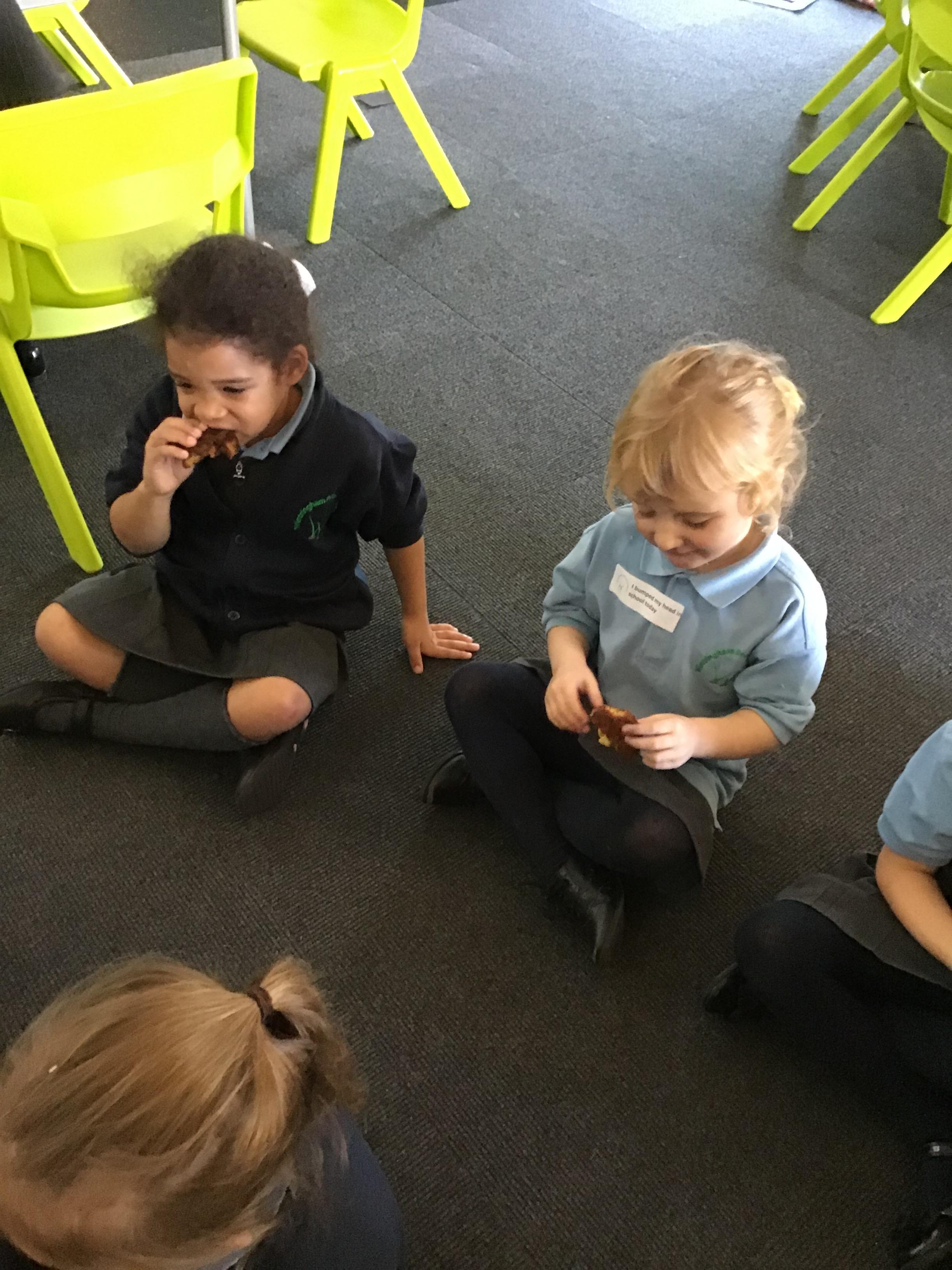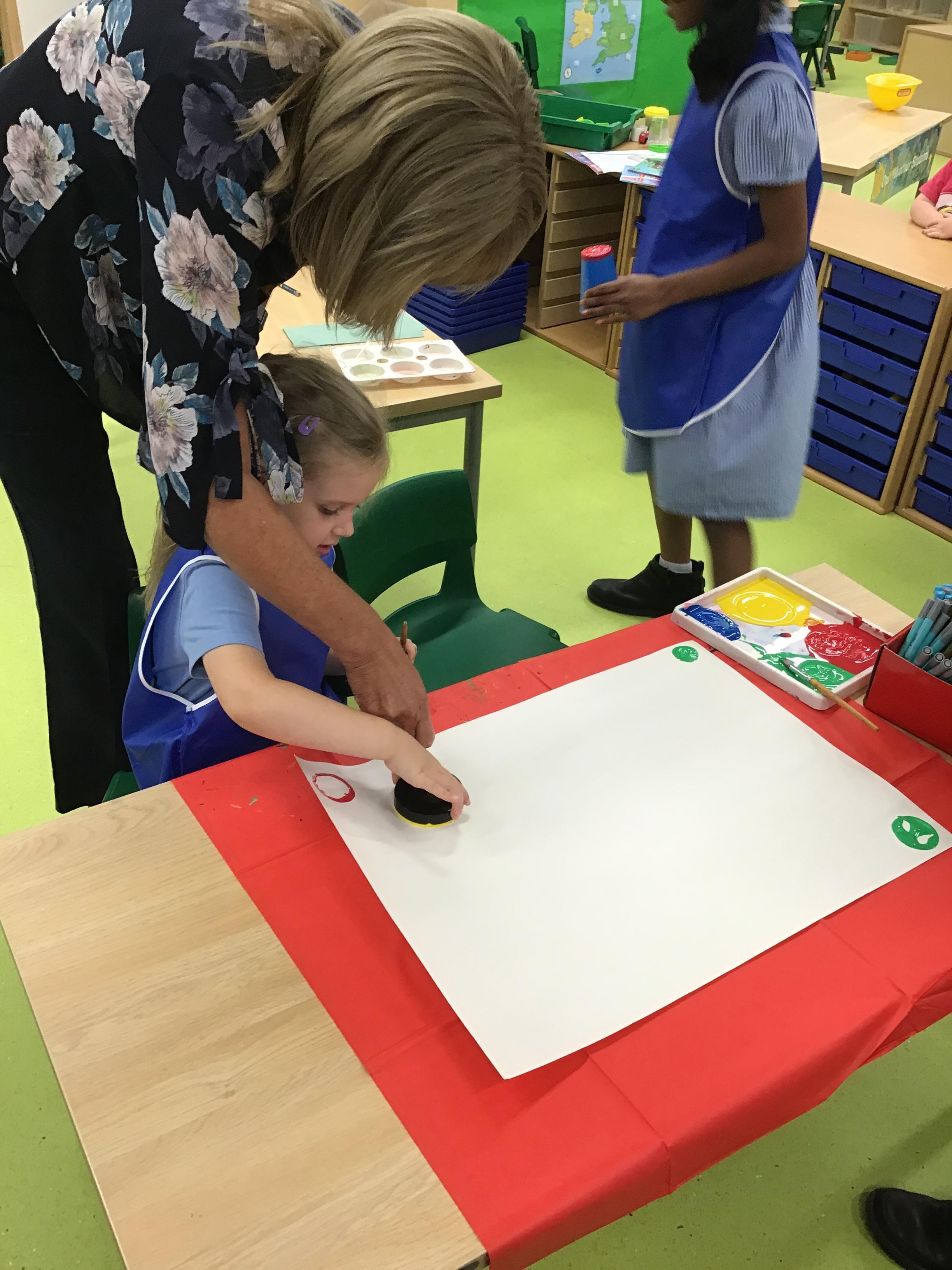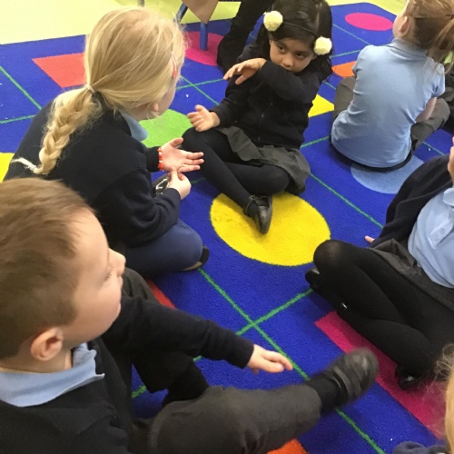 This week, the children have continued learning about the topic of food. As a class, we investigated what would happen when we put warm water over skittles. The children were firstly shown the equipment for the experiment and were asked to discuss what they thought we might be doing. The experiment was then set up and the children made some predictions about what they thought might happen, including 'There will be a rainbow on the plate' and 'The colour is going to come off the skittles'. After the water had been added to the skittles, the children were excited to see a rainbow start to appear and were then asked to make a comment about what they could see, e.g. 'The colours gone off the bottom onto the plate' and 'The colour is going into the middle, it's moving'. The children have also listened to the story Handa’s Surprise. They talked about the story, thinking about the characters and the plot. The children then tried some of the different fruits that appeared in the story, finally making fruit skewers using them. The children had to cut some of the fruit using a plastic knife. To celebrate the Hindu festival of Diwali, the children each made their own Diva lamp. They were given a ball of clay and had to use their thumbs to make an indent in it in order to fit a tea light. They created patterns around the edge using tools and then once it had dried, were able to paint and add glitter to it. I hope you are enjoying these at home. For our outdoor learning this week, the children worked with the children from class 2 to complete a photo scavenger hunt to familiarise themselves with the grove which is in the centre of the school building. They also created their own chalk paths and handprint artwork. Next week the children will be learning to read the tricky words 'no' and ‘into’ and will be learning the sounds l/ll, ss and j in our phonics sessions. We are currently in the process of setting up the fruit and vegetable initiative from the government where each child will receive a healthy snack every day. In the meantime, if your child would like to bring a piece of fruit or vegetable for a mid-morning snack please put this in their book bag. Thank you and I hope you all have a great weekend