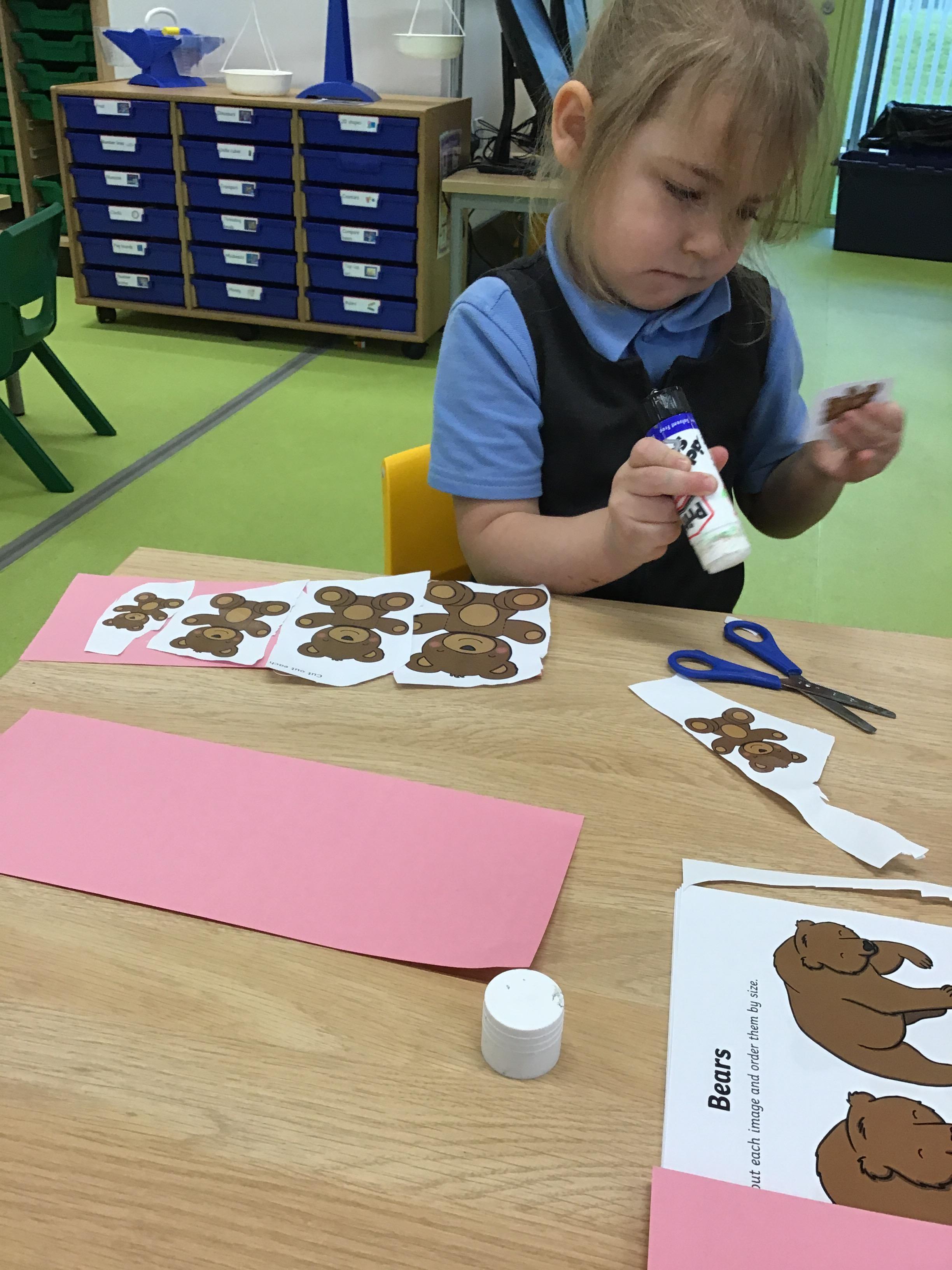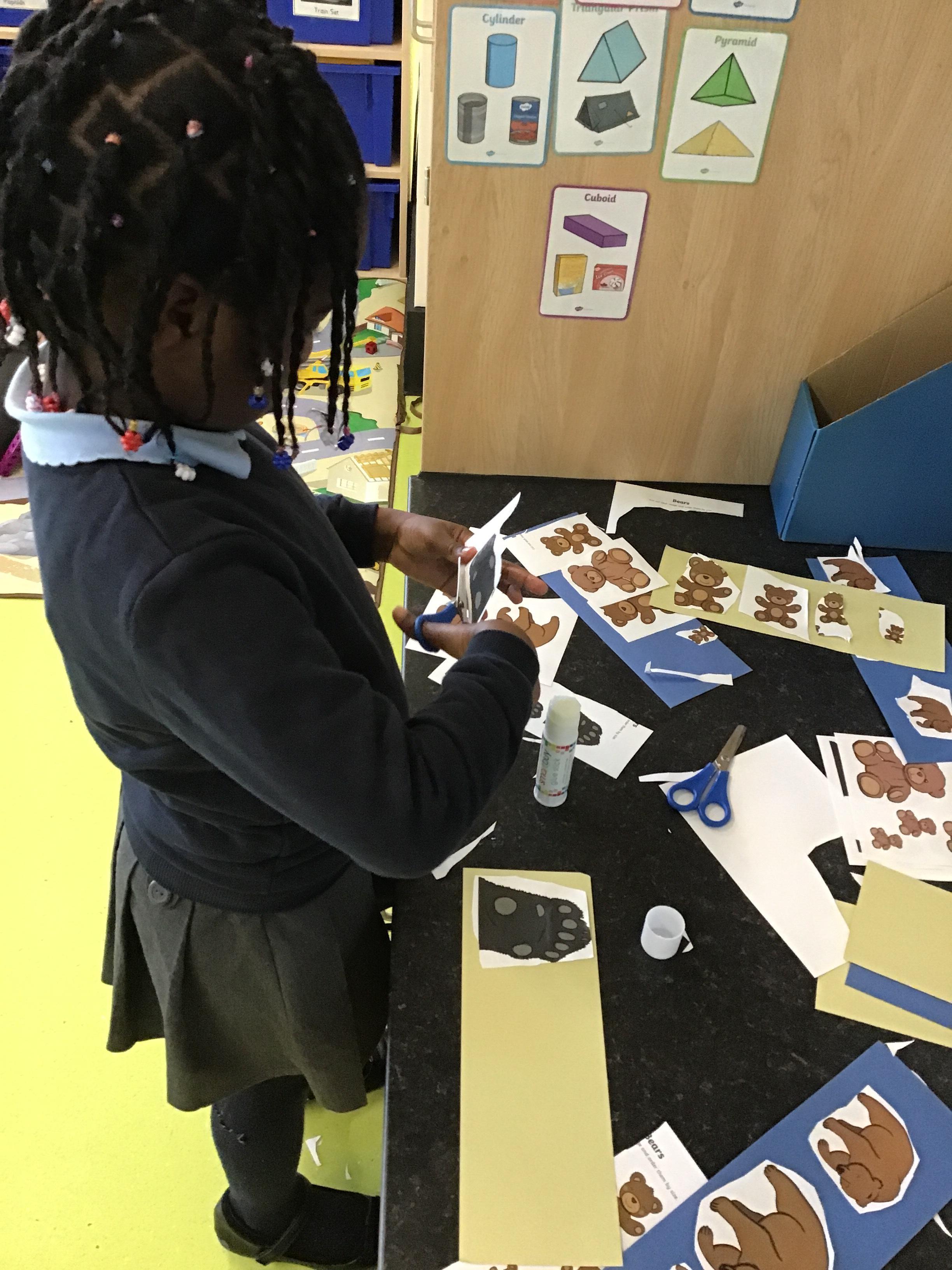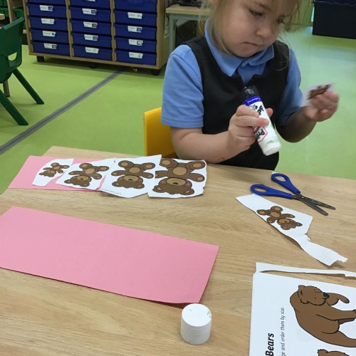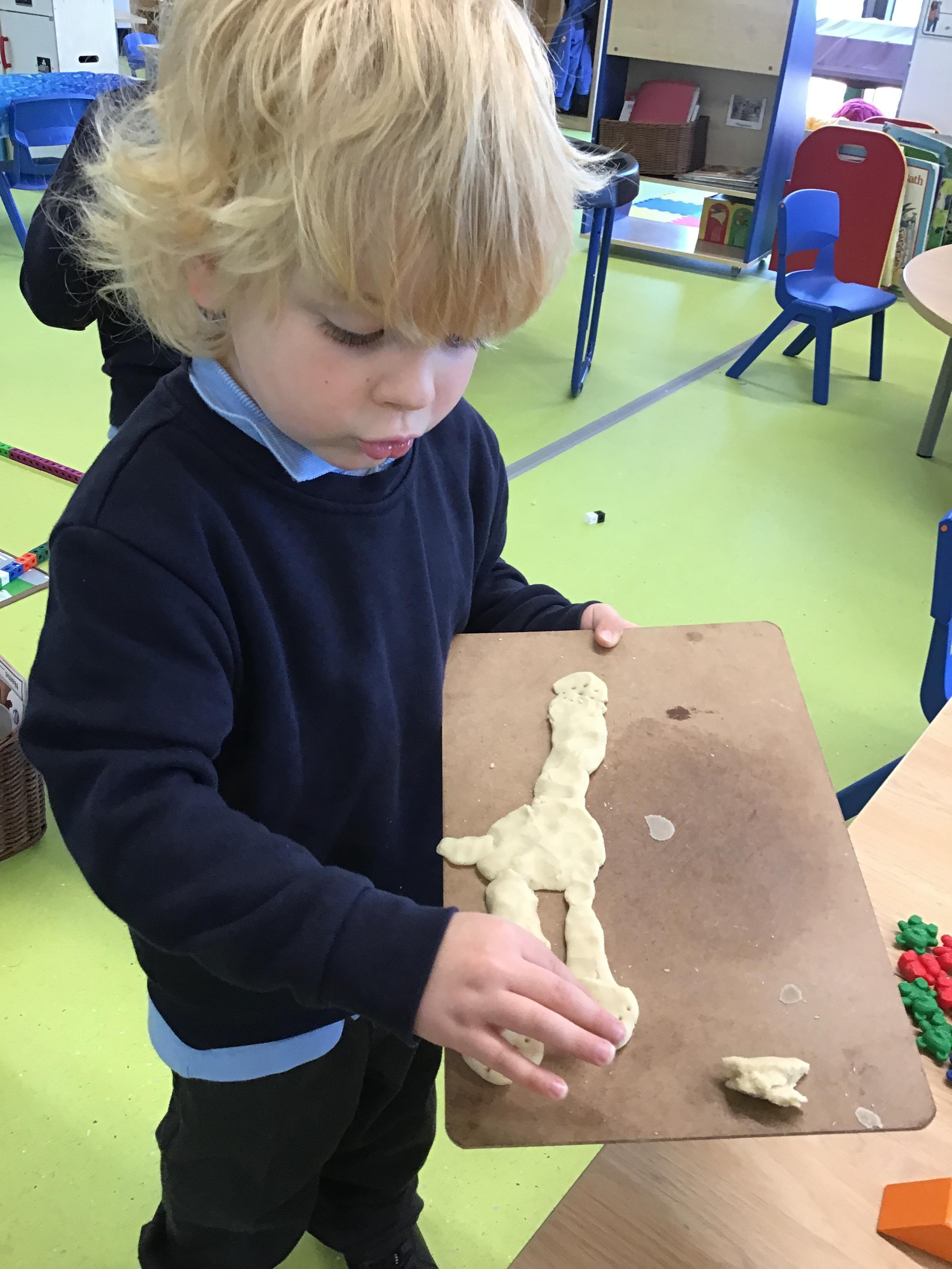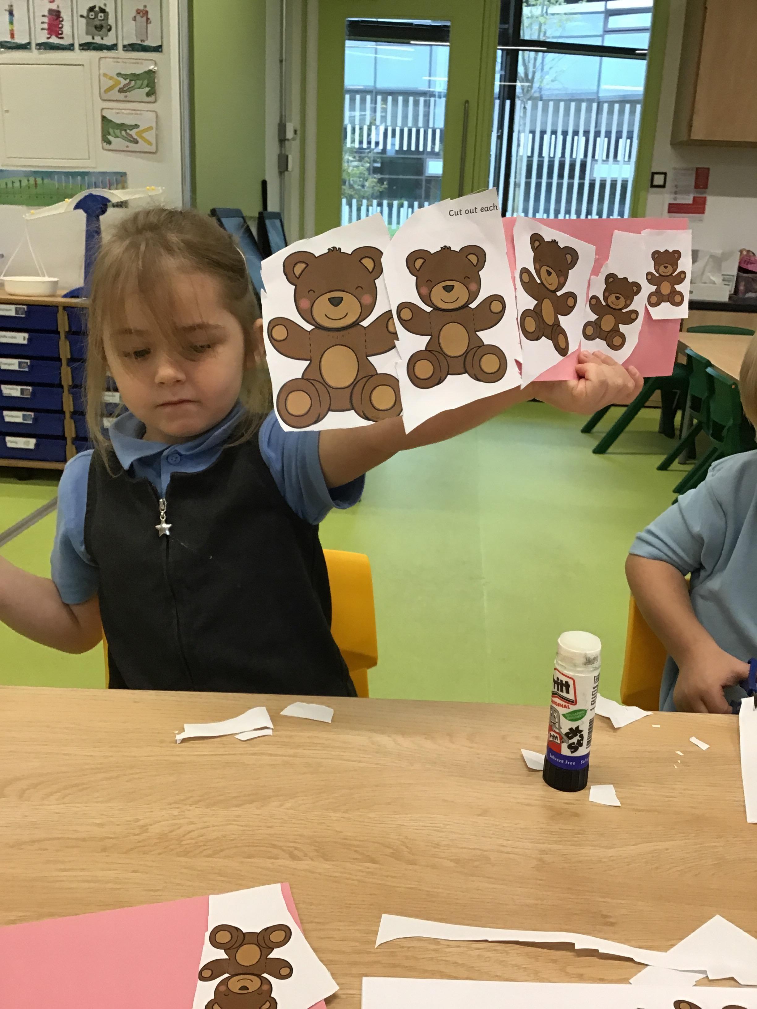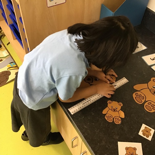 In continuous provision, the children have been, making bears with playdough, using different construction material to create bear caves, measuring the height of bears and drawing and writing things linked to the story.