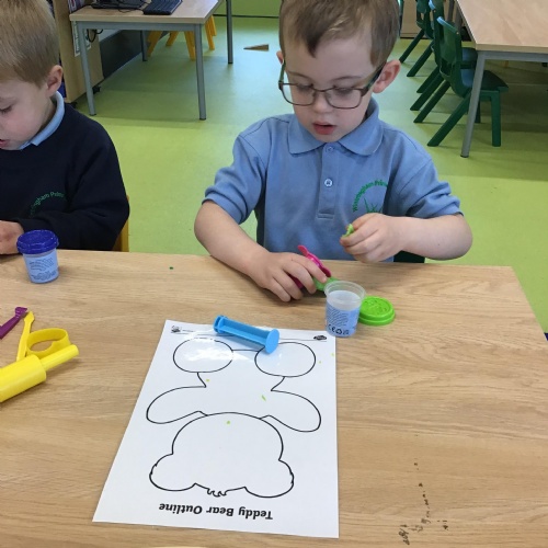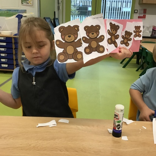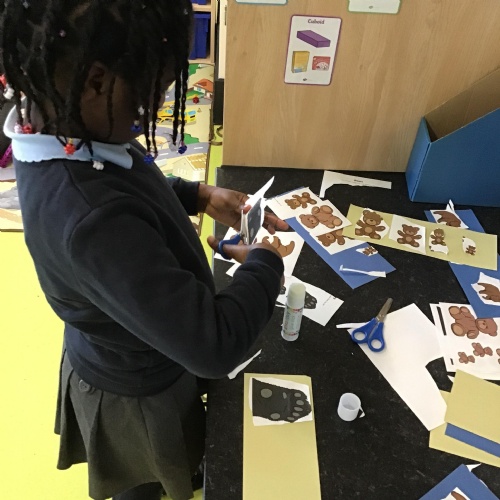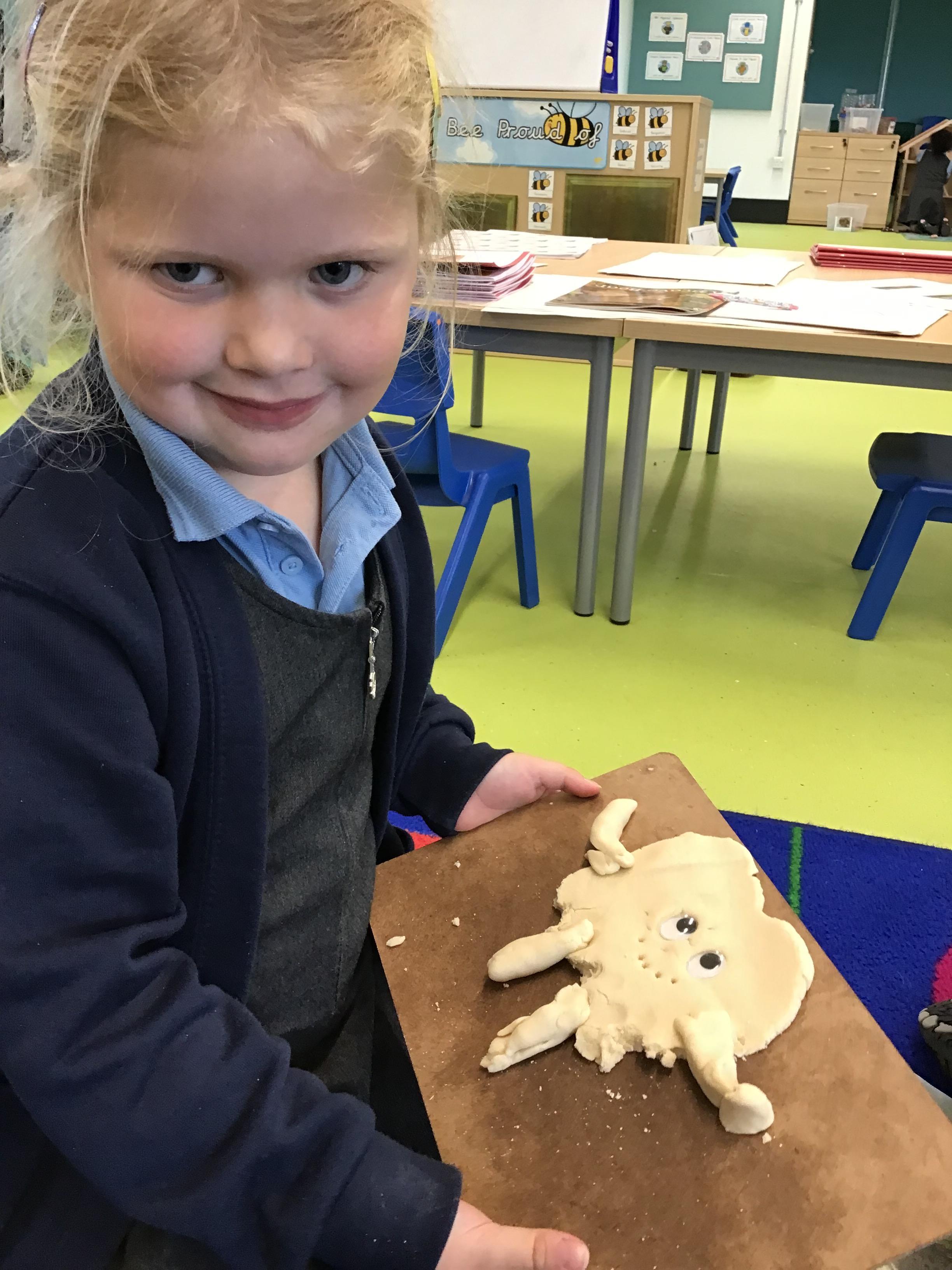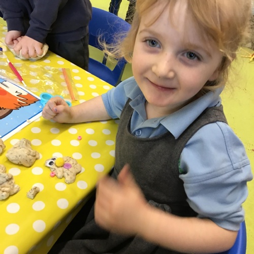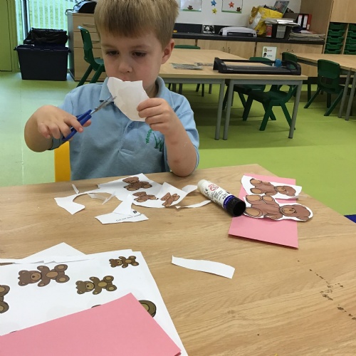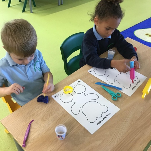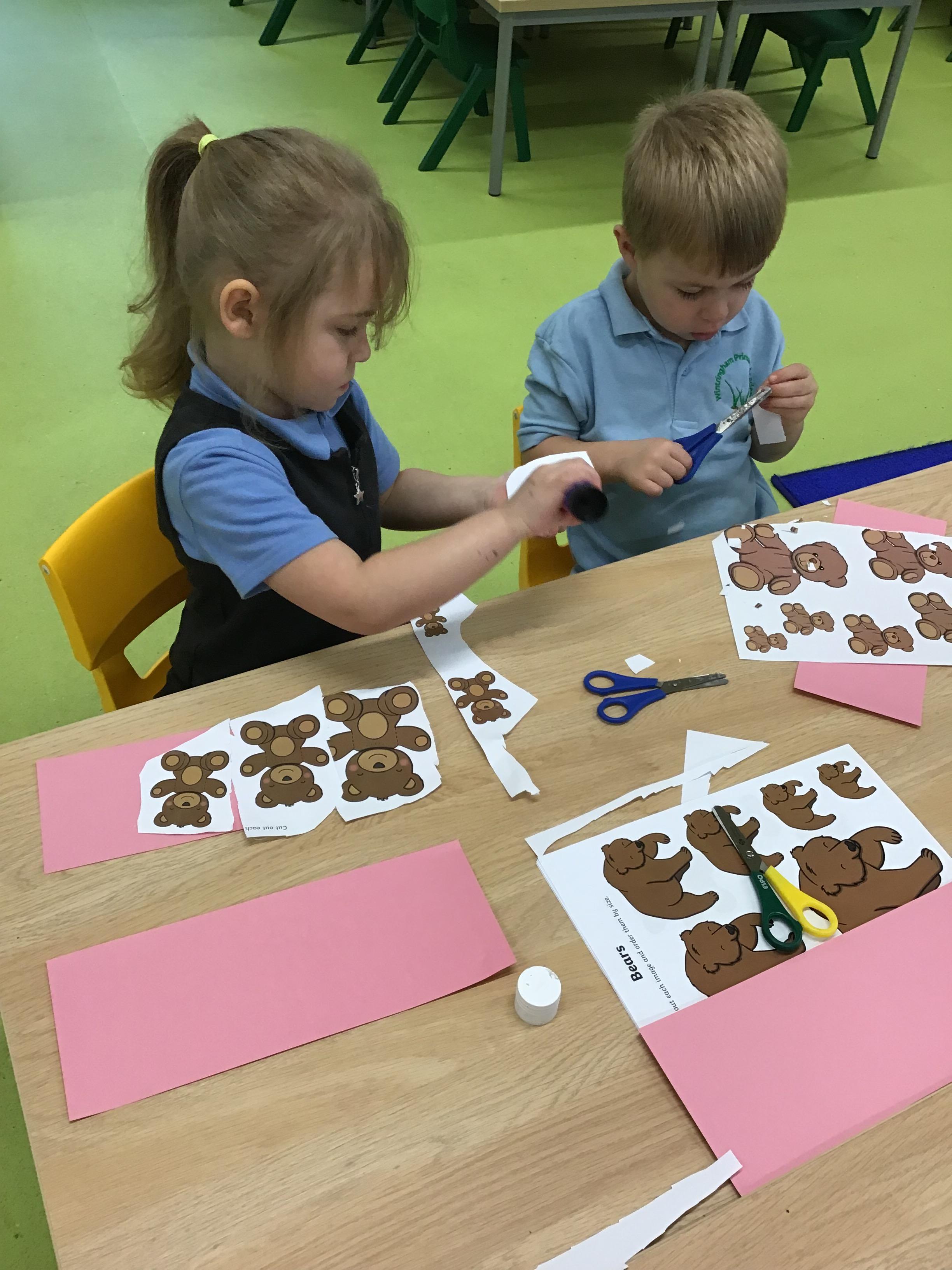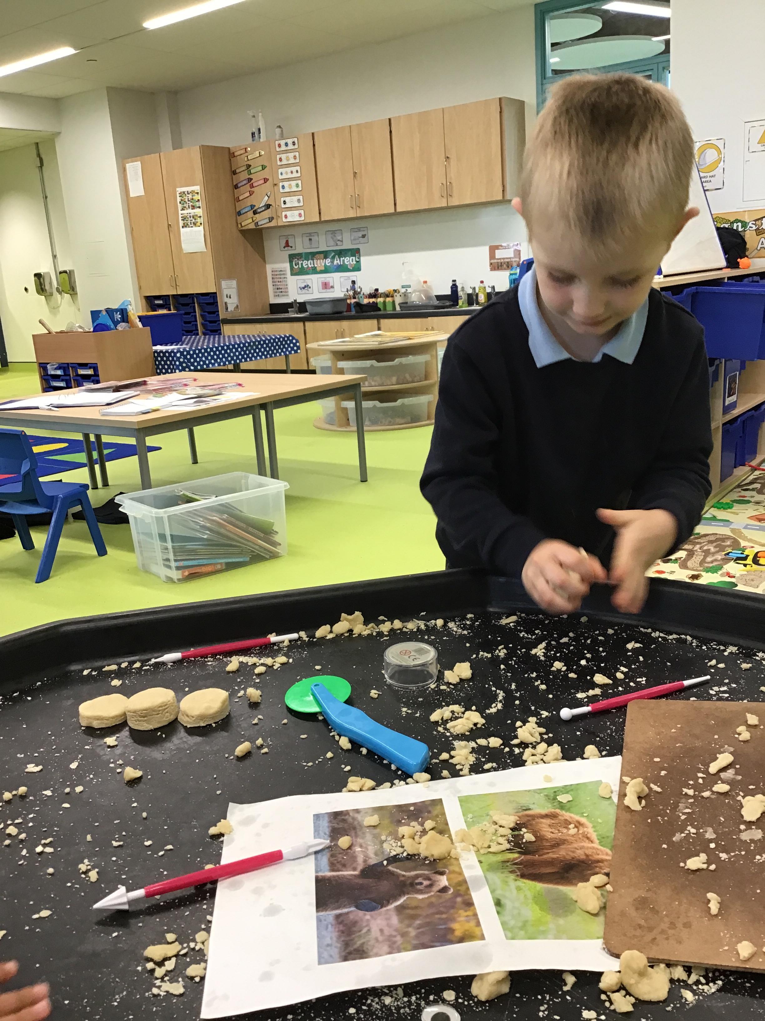 In continuous provision, the children have been, making bears with playdough, using different construction material to create bear caves, measuring the height of bears and drawing and writing things linked to the story.