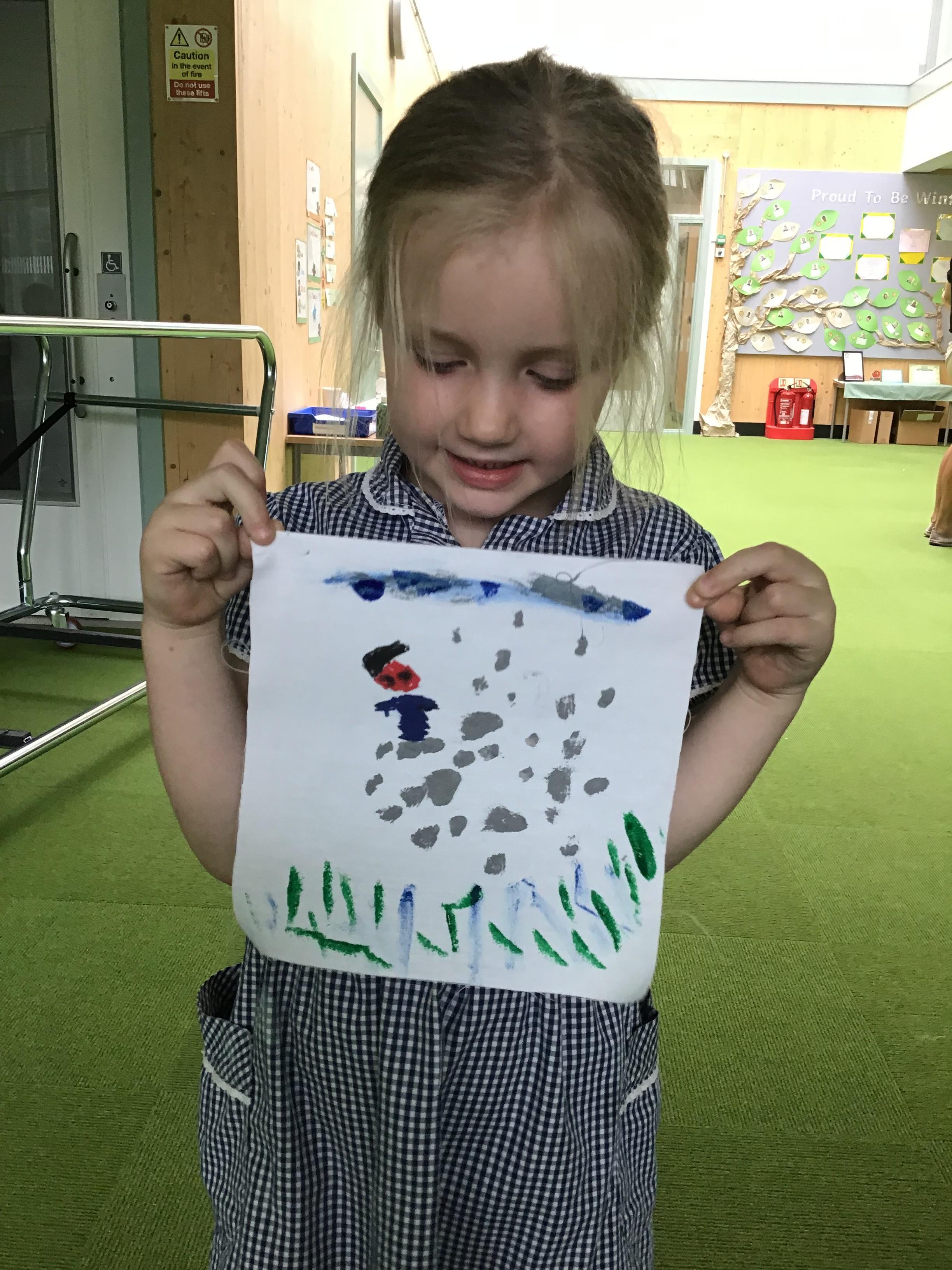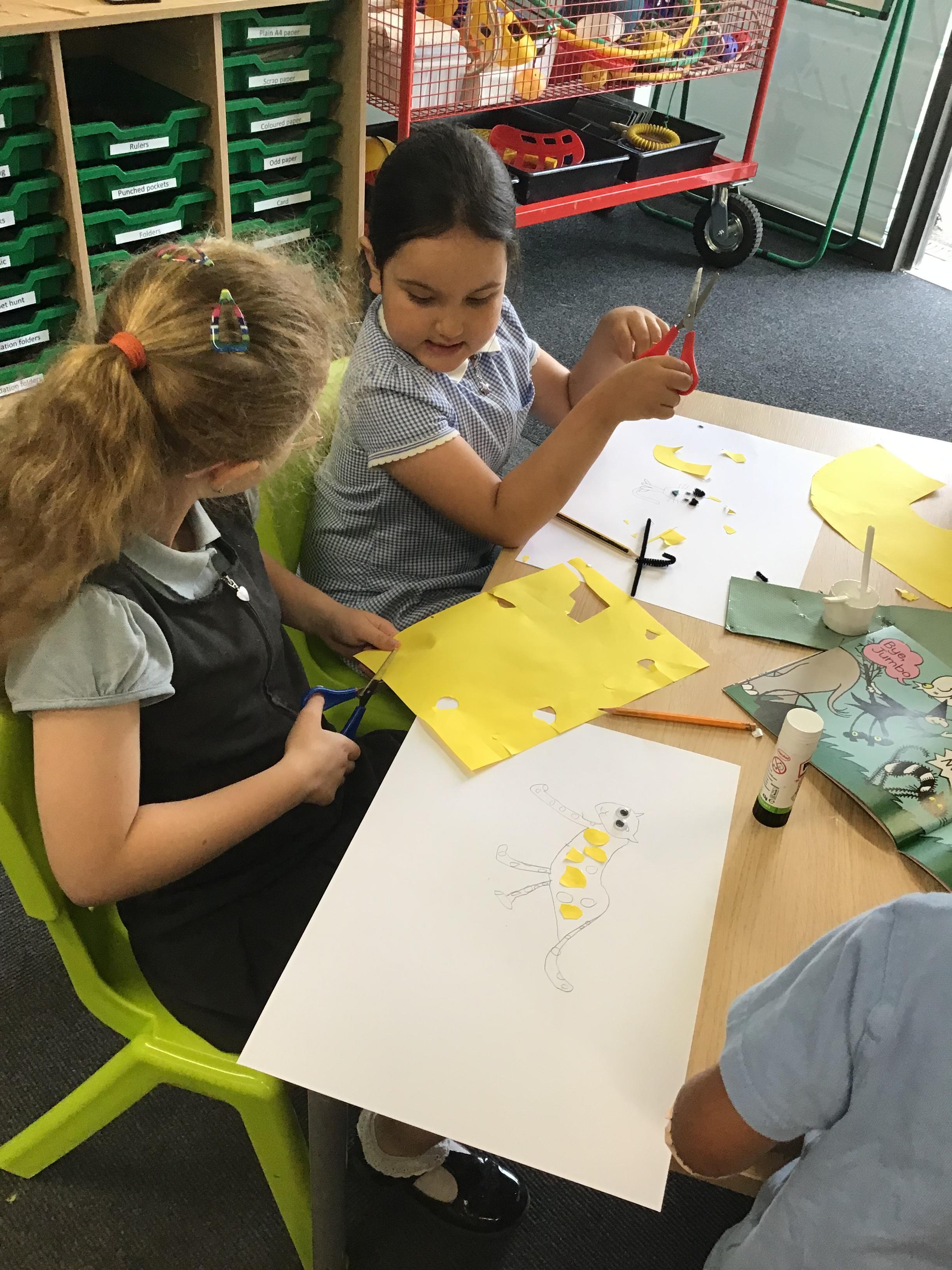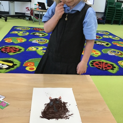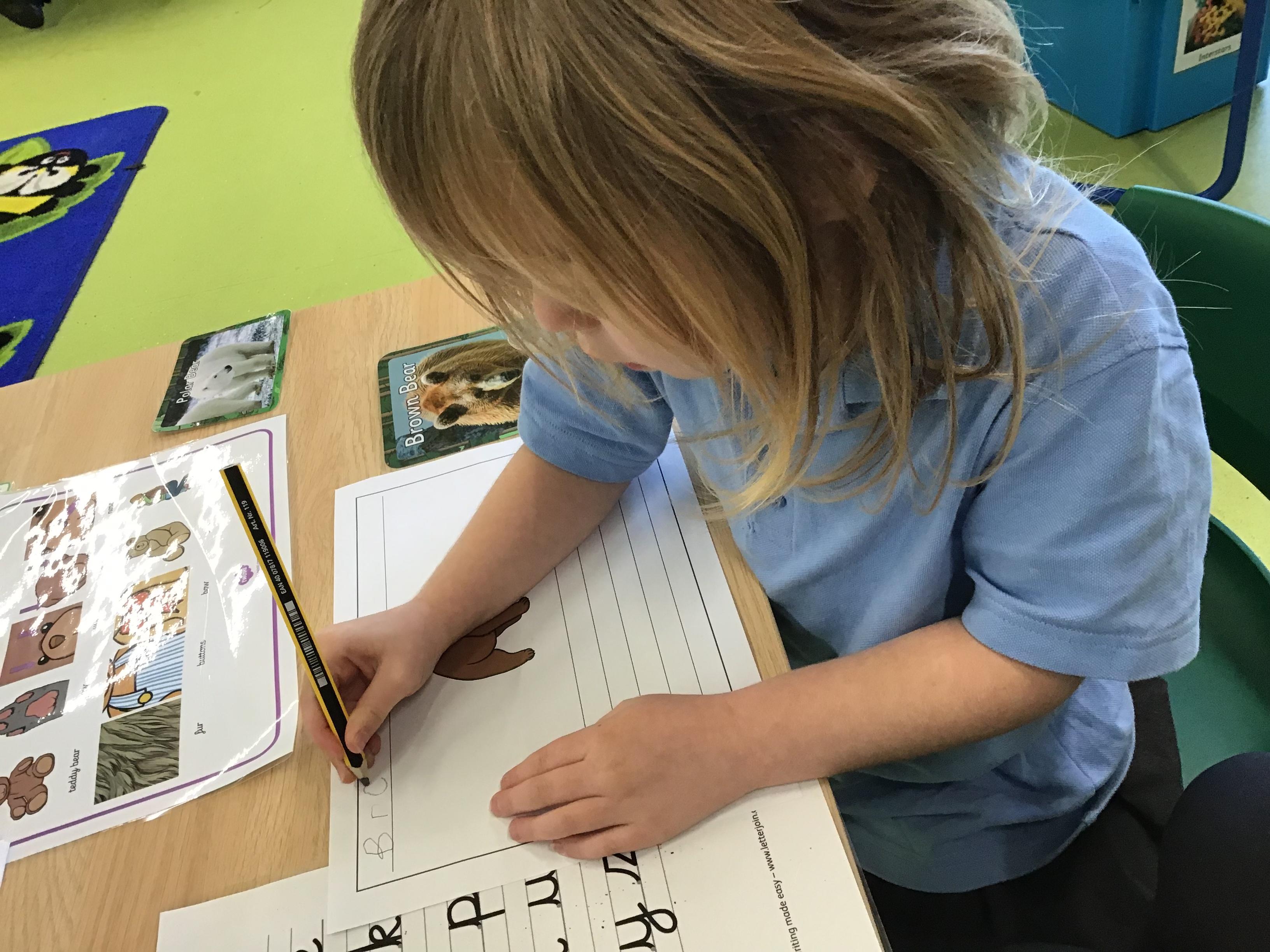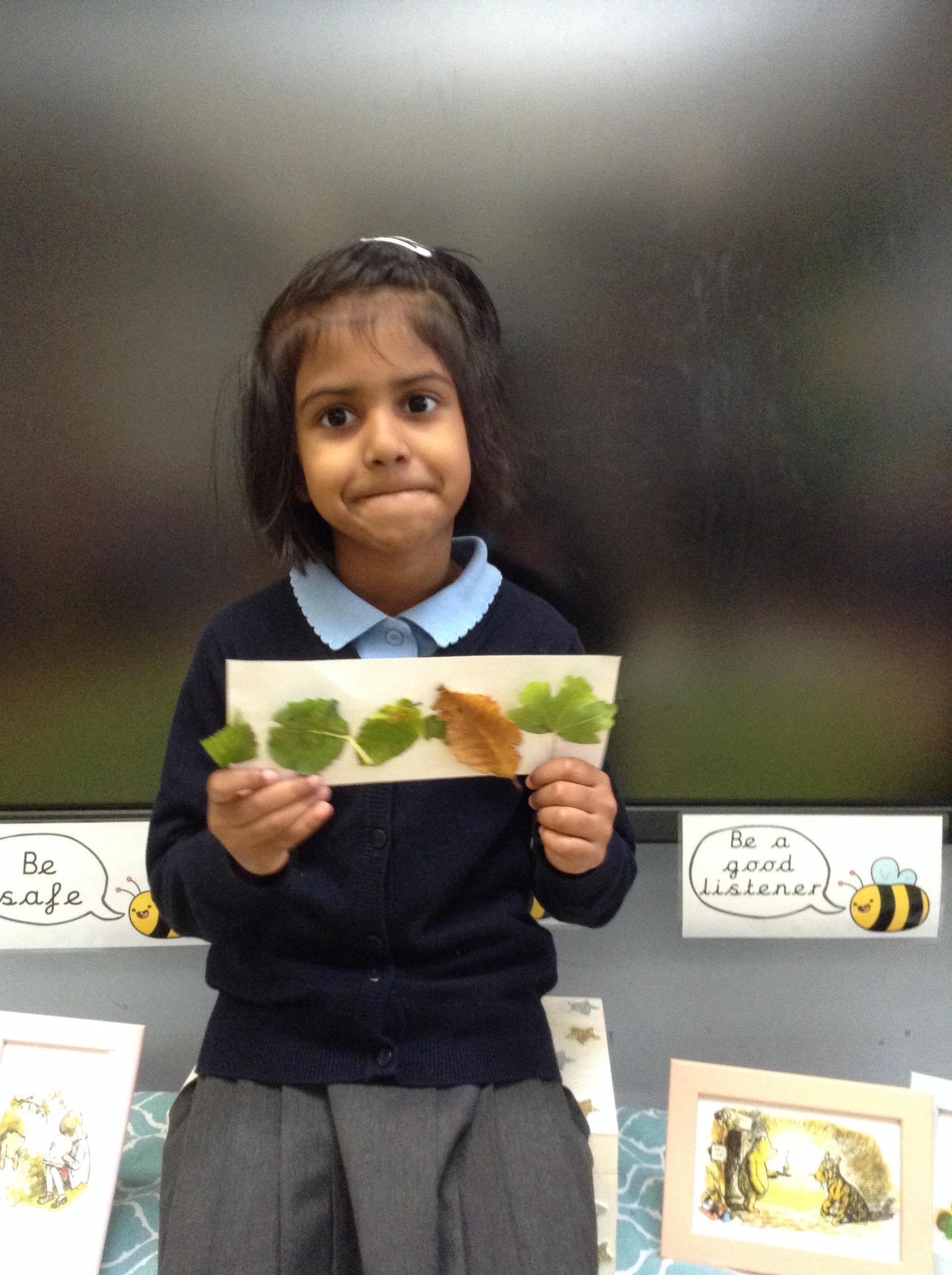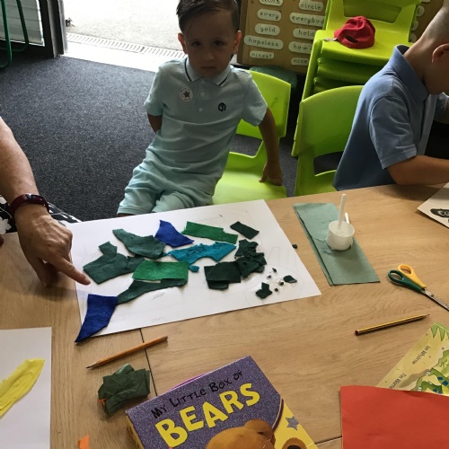 This week, the children have been learning about the story 'A Brave Bear'. At the beginning of the week, the children were told the first line of the story 'Everything was hot', without being shown the front cover, the title of the book or any of the illustrations. The children discussed with their talk partner and then drew a picture of what this could be in relation to and their ideas ranged from volcanoes erupting, a bowl of soup, a radiator and warm summer days. Later on in the week, the children were shown the illustration that went alongside the sentence 'Everything was hot'. The picture was of two bears (daddy bear and baby bear) lying down in their cave on a hot summers day. The children then listened to some sounds of the forest and worked with their partner to add more detail to the illustration that they were given, e.g. drawing trees, flowers, a waterfall and some birds flying in the sky. The children have been independently writing about different parts of the story, cutting/sticking pictures of bears in the correct size order, estimating/counting the number of bears that can be seen in a picture and also making their very own bear pictures using brown paint and a plastic fork. For this week's forest school session, the children listened to the story 'Leaf Man'. They then went out onto the field to make their own leaf men using materials they collected outside. They collected leaves along with other natural materials and placed these on a laminated white sheet so they stood out from the field. When we came back inside, the children each took on the character of leaf man and said/completed the sentence "I am leaf man and I like .....". Next week we will be learning the sounds c, k, ck and e in our phonics sessions. The children will also be continuing to practise segmenting and blending sounds for reading and writing. Please continue to support your child at home by looking at their reading books and asking them questions about the setting, events and characters in the story. I hope you all have a lovely weekend