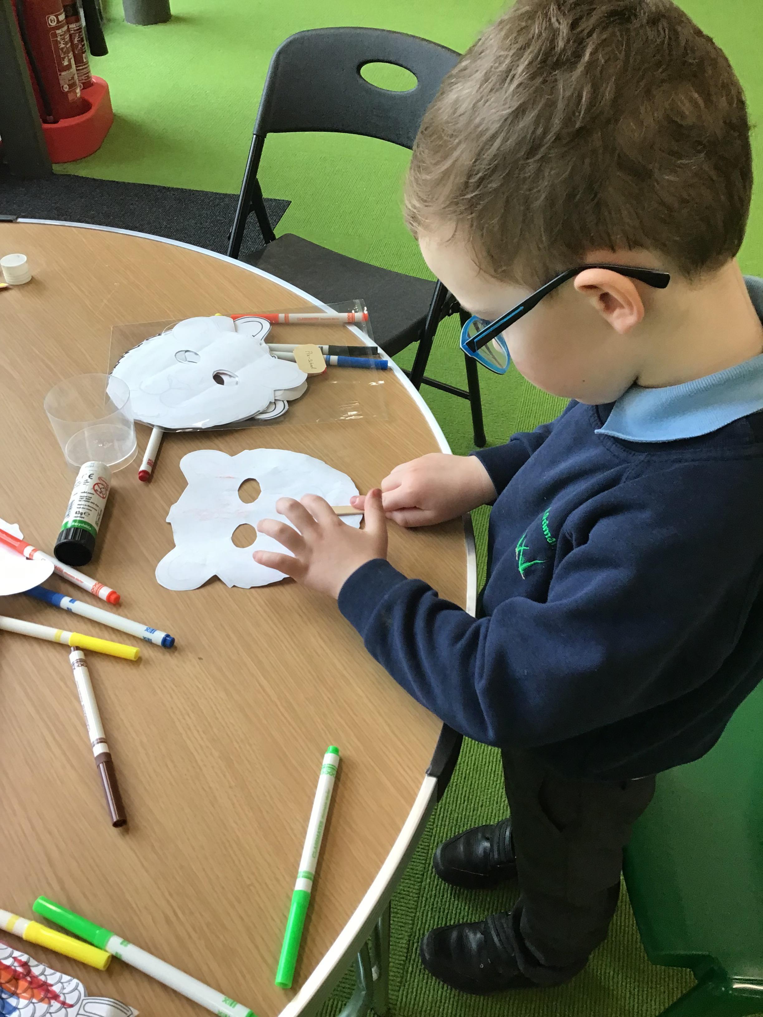 Creative - Make a mask for each of the three bears. Can you write the bear's names on the back of your masks? Listen carefully to the letter sounds you can hear in their names and write them down.