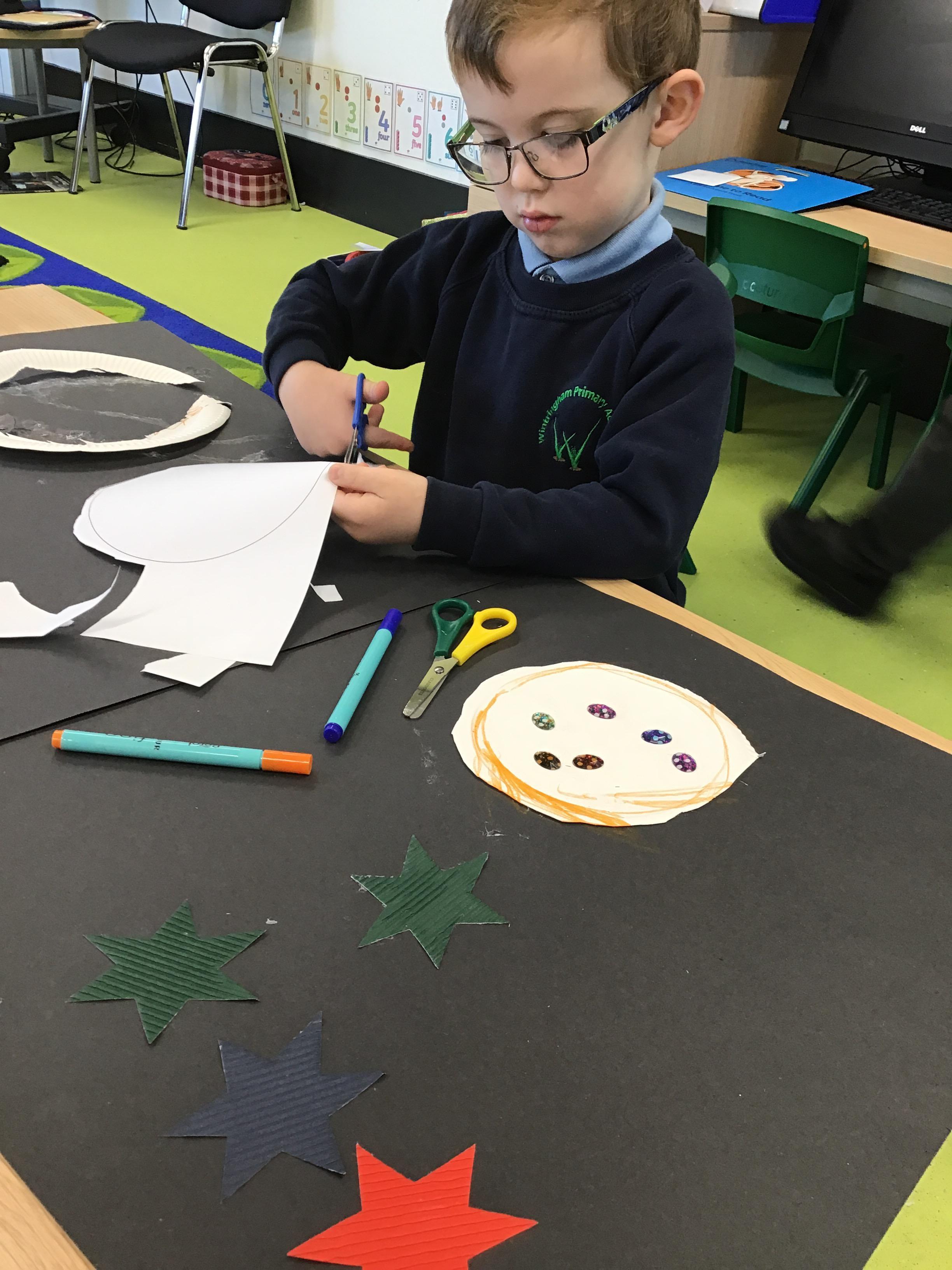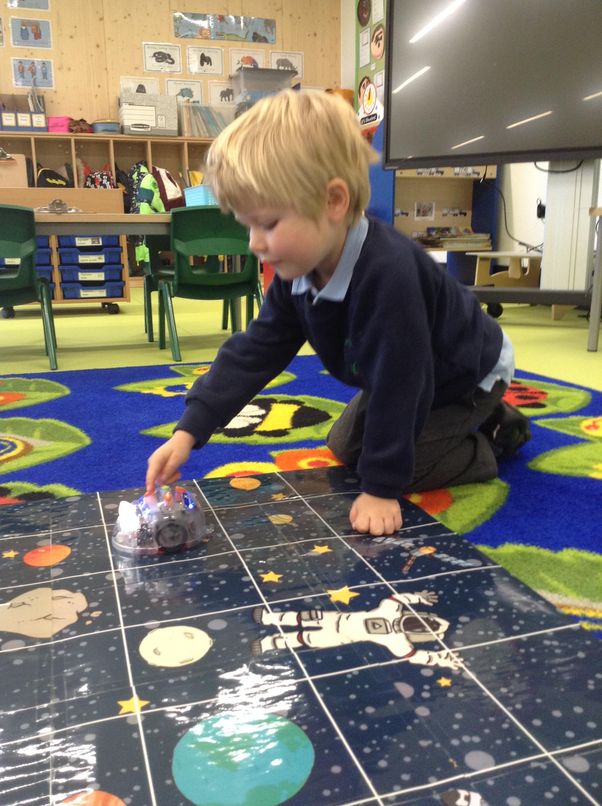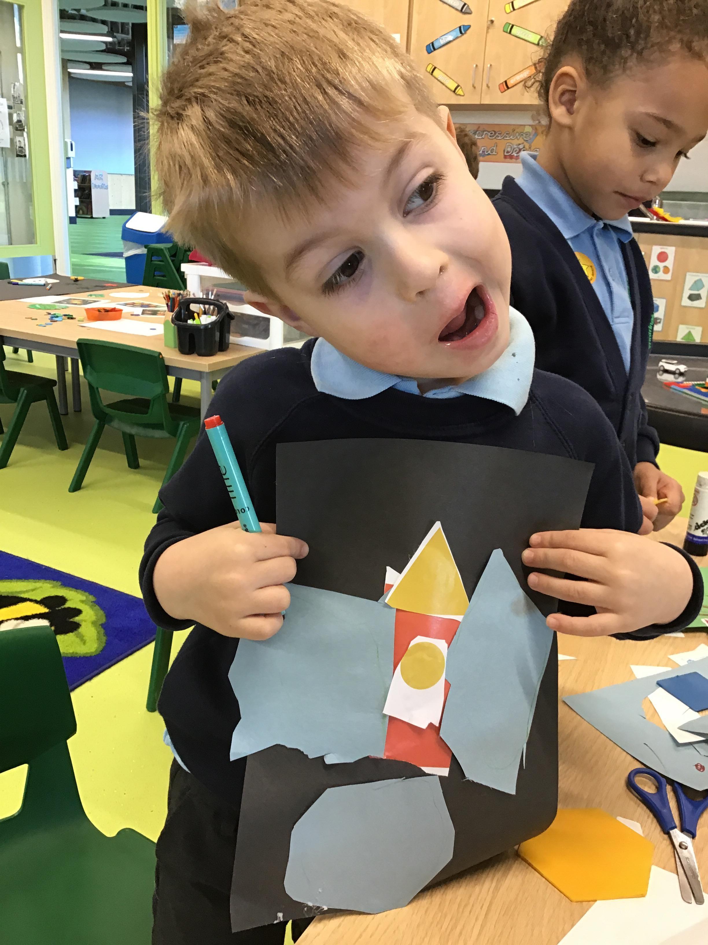 This week the children's learning has been around the topic of space. On Tuesday, as a class, we created a mind map of what the children knew about space and they thought of some really great ideas, including 'There are lots of stars', 'Astronauts go to the moon in rockets' and 'Planets spin around the sun'. I have been doing benchmark assessments on the children's reading skills this week. I am very proud of the children and how far they have progressed with their reading. A note has been written in your child's reading diary and an observation has been added onto Tapestry to let you know which level book they will now be bringing home, along with a next step for your child to work on when reading. The children have been enjoying programming the beebot to make a journey across a map of space. They verbally planned the route around space focusing on using directional language, ensuring they made the beebot get to a point of interest on their journey. As the beebot was moving, they were asked to think about if the directions were accurate and if they needed to make changes to their plans. The children have been independently writing a list of things that they would take to the moon with them, making star constellation pictures using glitter on black paper, making rockets using a variety of 2D shapes, using pegs and tweezers to retrieve planets from space and acting out the story 'Whatever Next', which the children have also been exploring during group time this week. They used props from the story to act it out and then discussed items that baby bear should (e.g. a bottle of water and a watch) and should not (e.g. a dustpan and brush) take to the moon with him and why. On Tuesday the children will have their first virtual assembly which will be the 'wishing the lights on' assembly. The children will need to close their eyes and wish really hard for the lights to come on the Christmas tree. They will also have the opportunity to hang their home-made Christmas decorations on the tree, so if your child has made a decoration then please remember to bring it into school by Tuesday morning. Next week the children will be learning to read the tricky words ‘he’ and ‘she’ and will be learning the sounds z/zz, qu and sh in our phonics sessions.