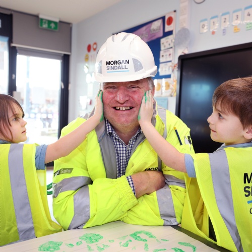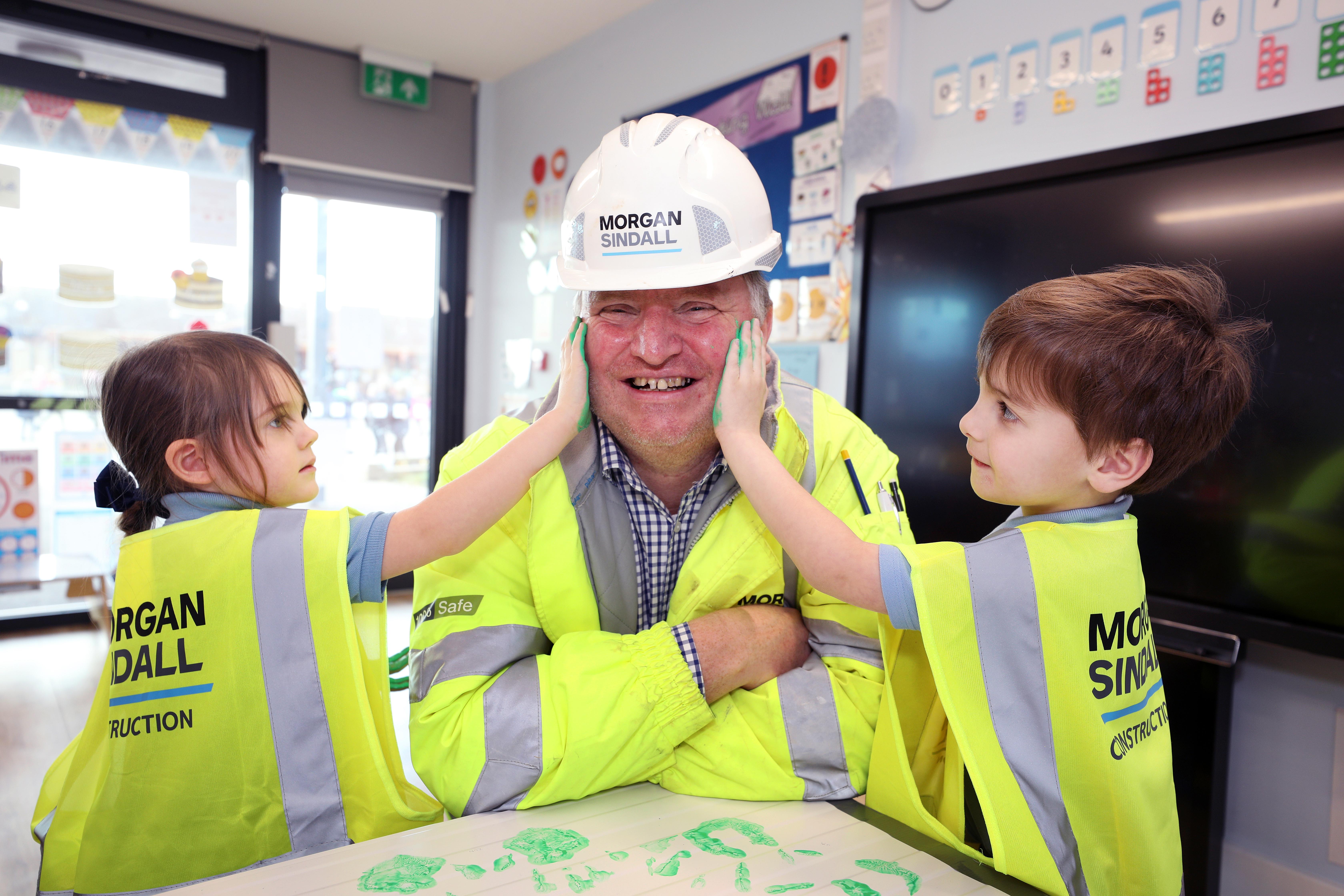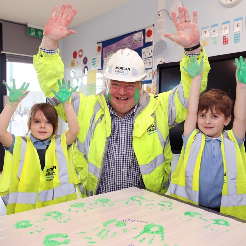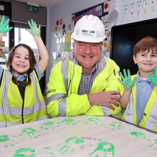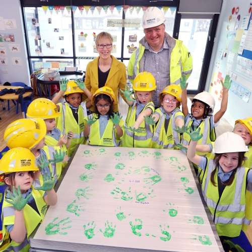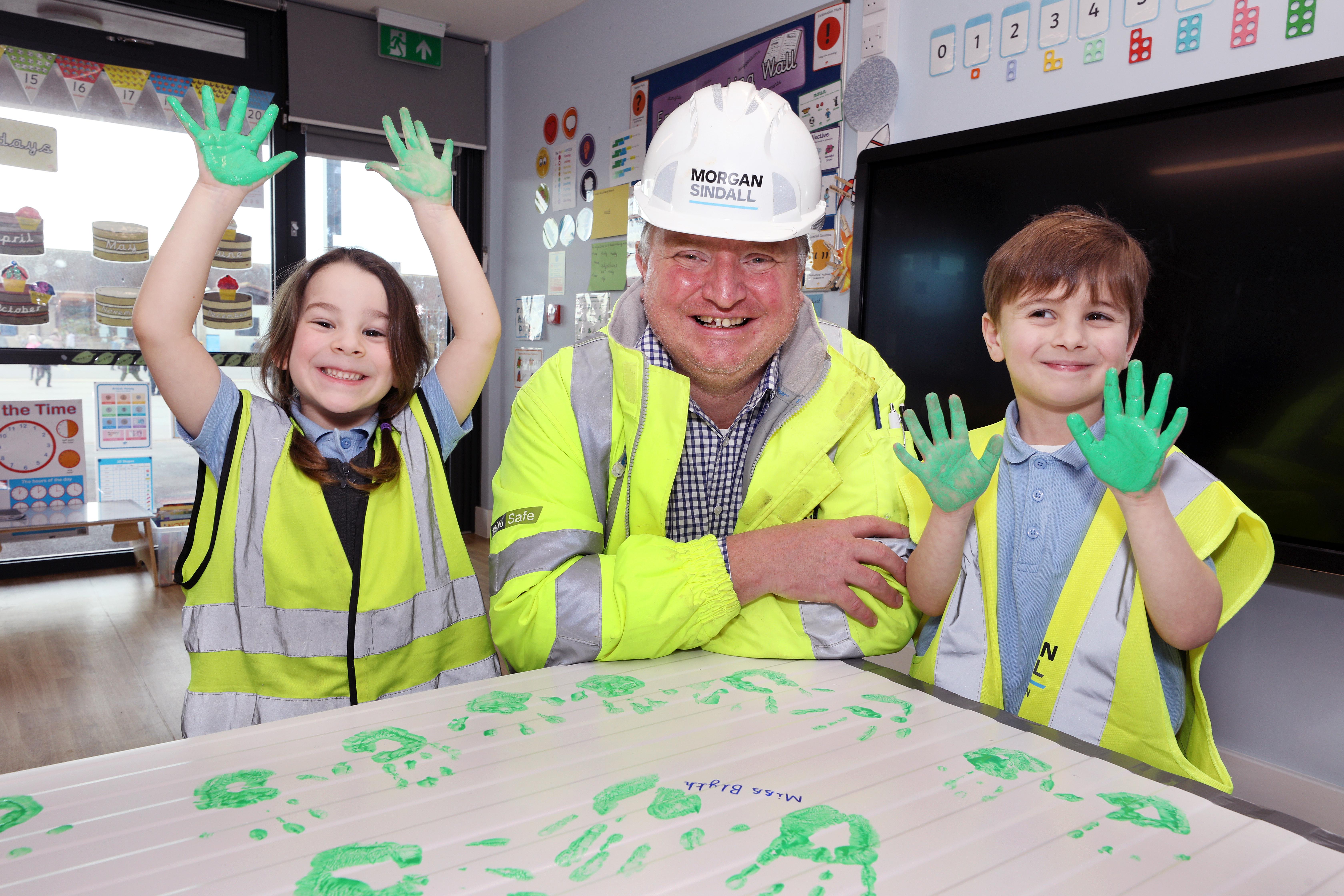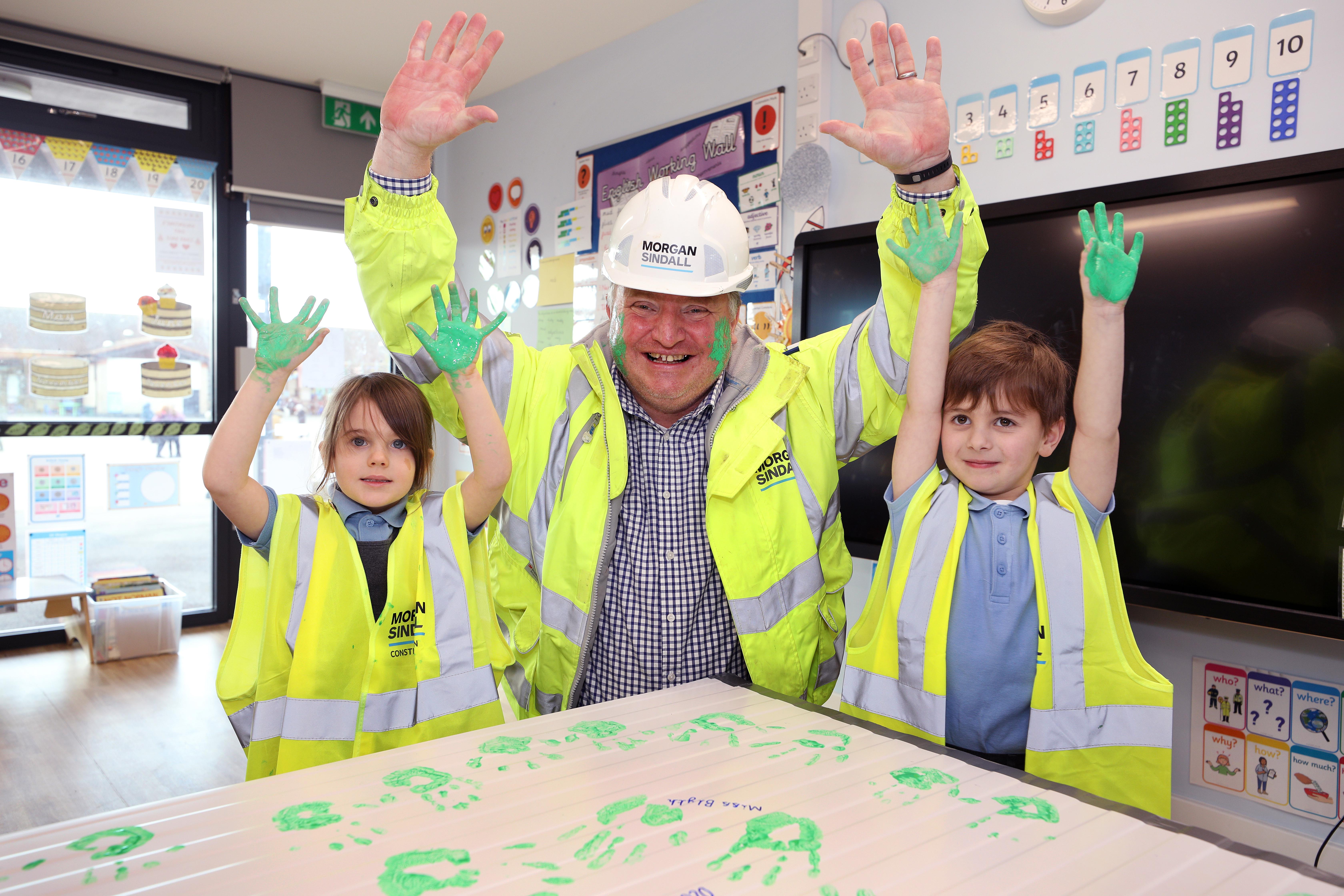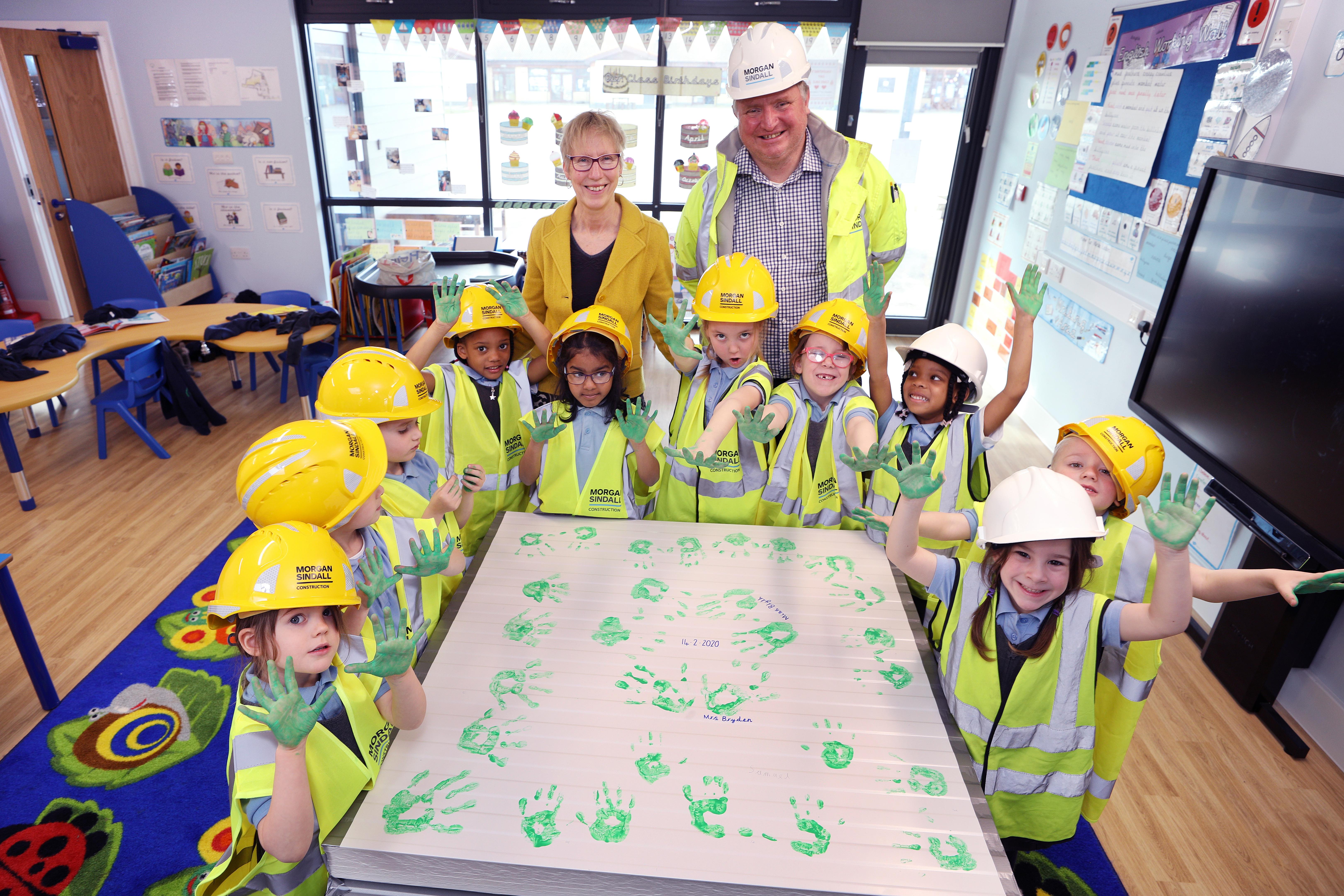 On Friday 14th February Morgan Sindall brought a large panel from the roof of the new Wintringham building into school for the children put their hand prints and names on. Mrs Bryden, Mrs Pritchard, Miss Blyth and Mrs Kennard also added their prints. The children thought it was very funny when two of them added their green hand prints to Gary Nicholson (Morgan Sindall’s Project Manager) face! The panel will be built into the roof of the new building to be found in the future.